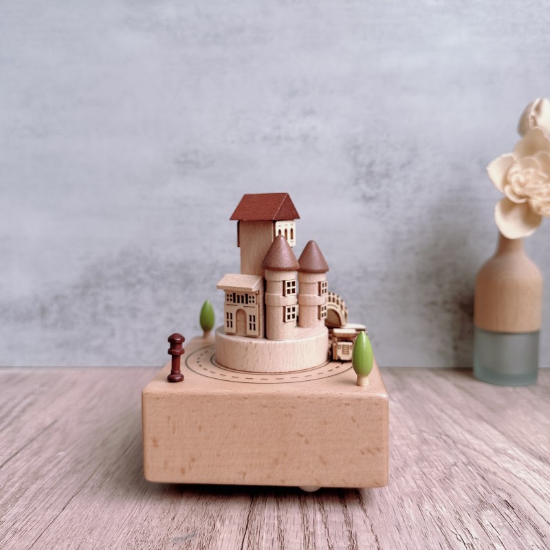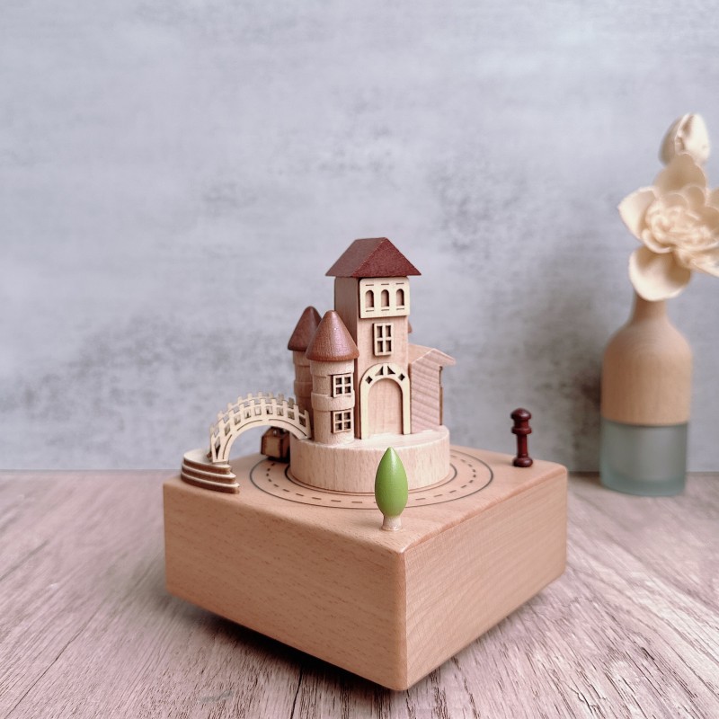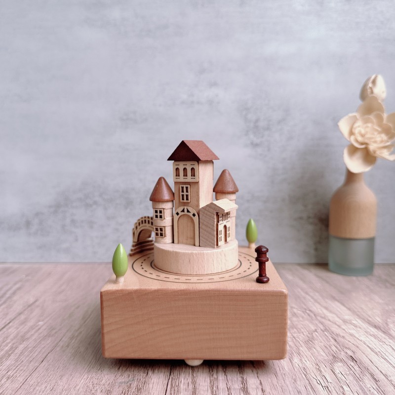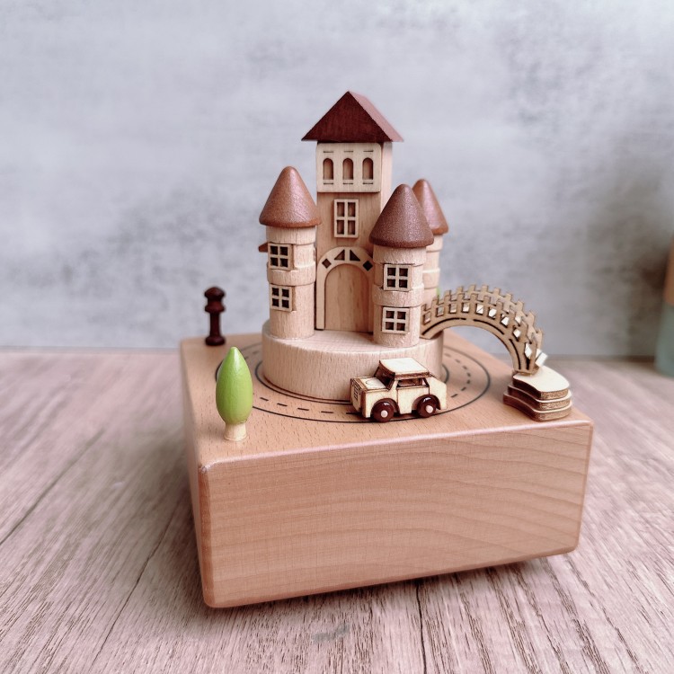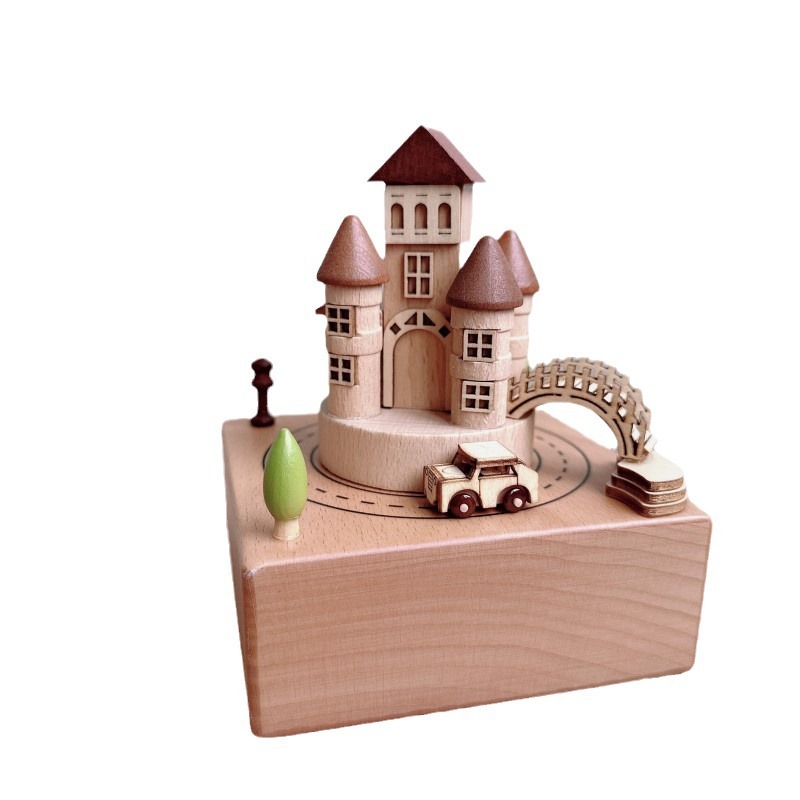 童话城堡可旋转八音盒厂家直销礼品木质工艺品音乐盒原木摆件手工