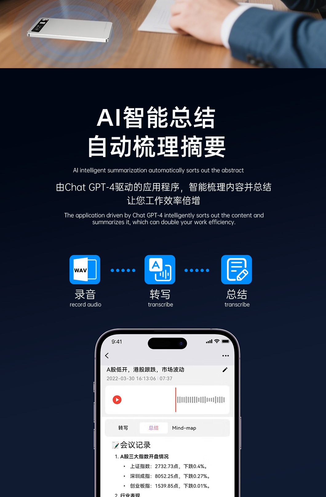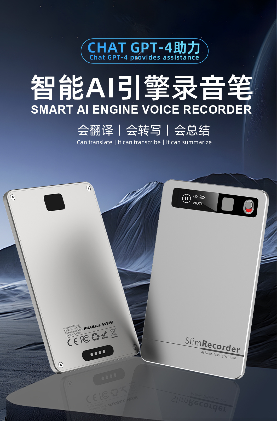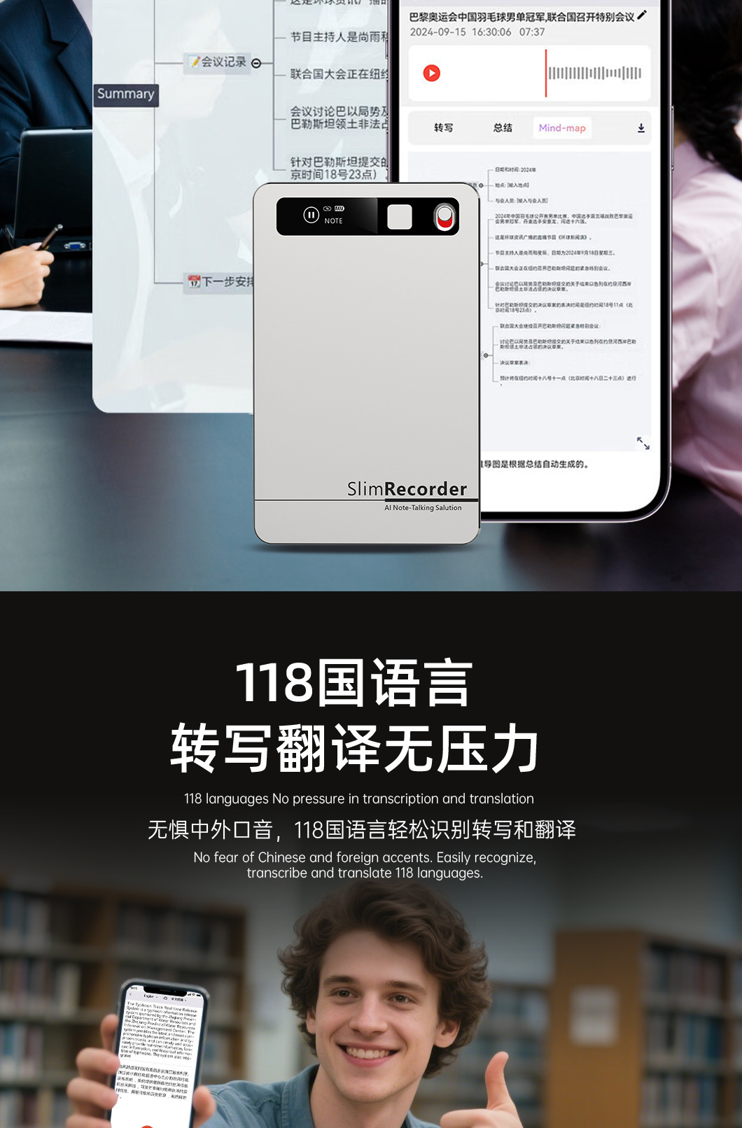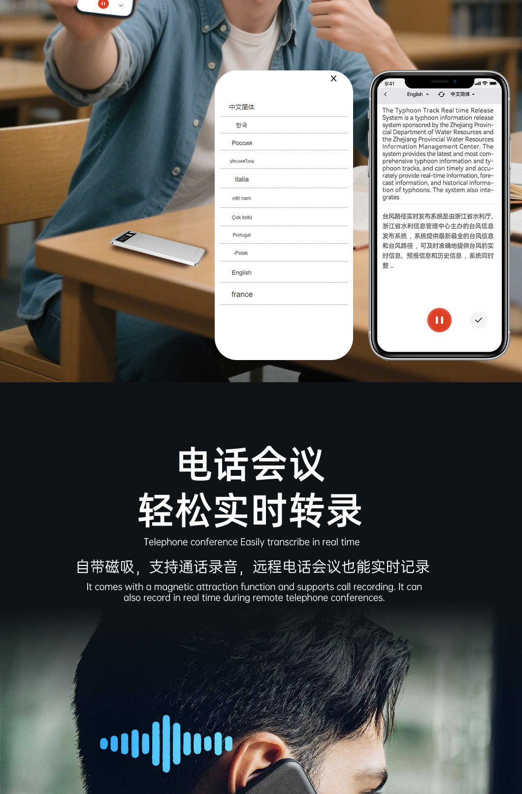 随身超薄Ai录音笔高清降噪学生医生会议转写录音翻译多语种录音笔