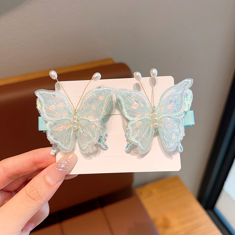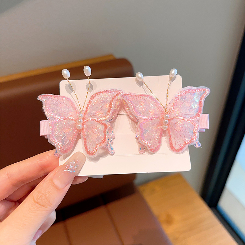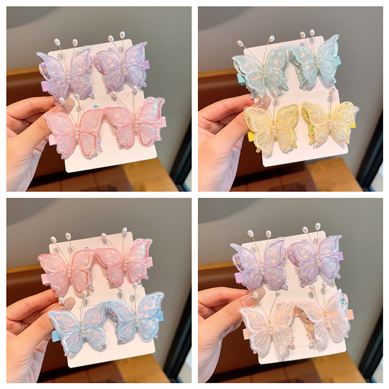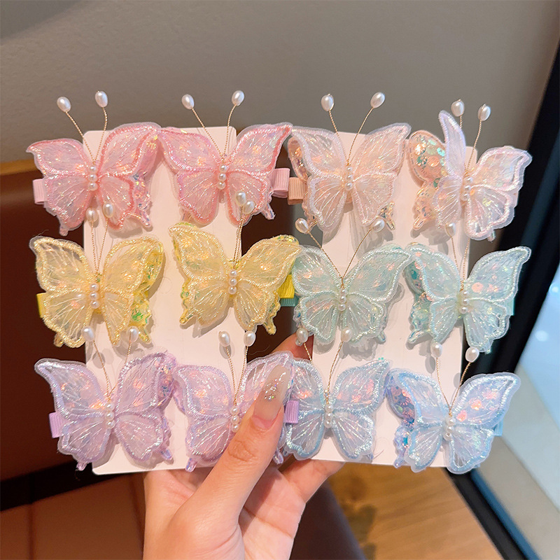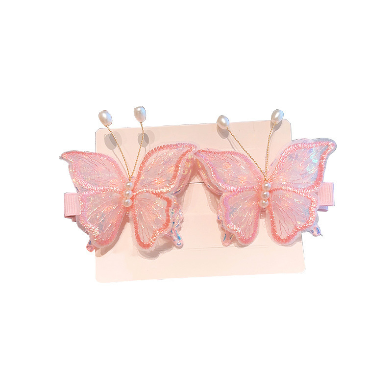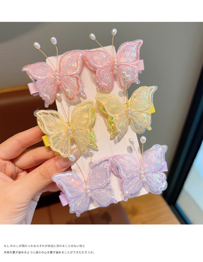 新款双层网纱珍珠蝴蝶边夹侧边刘海发夹小女孩碎发头饰超仙发饰女