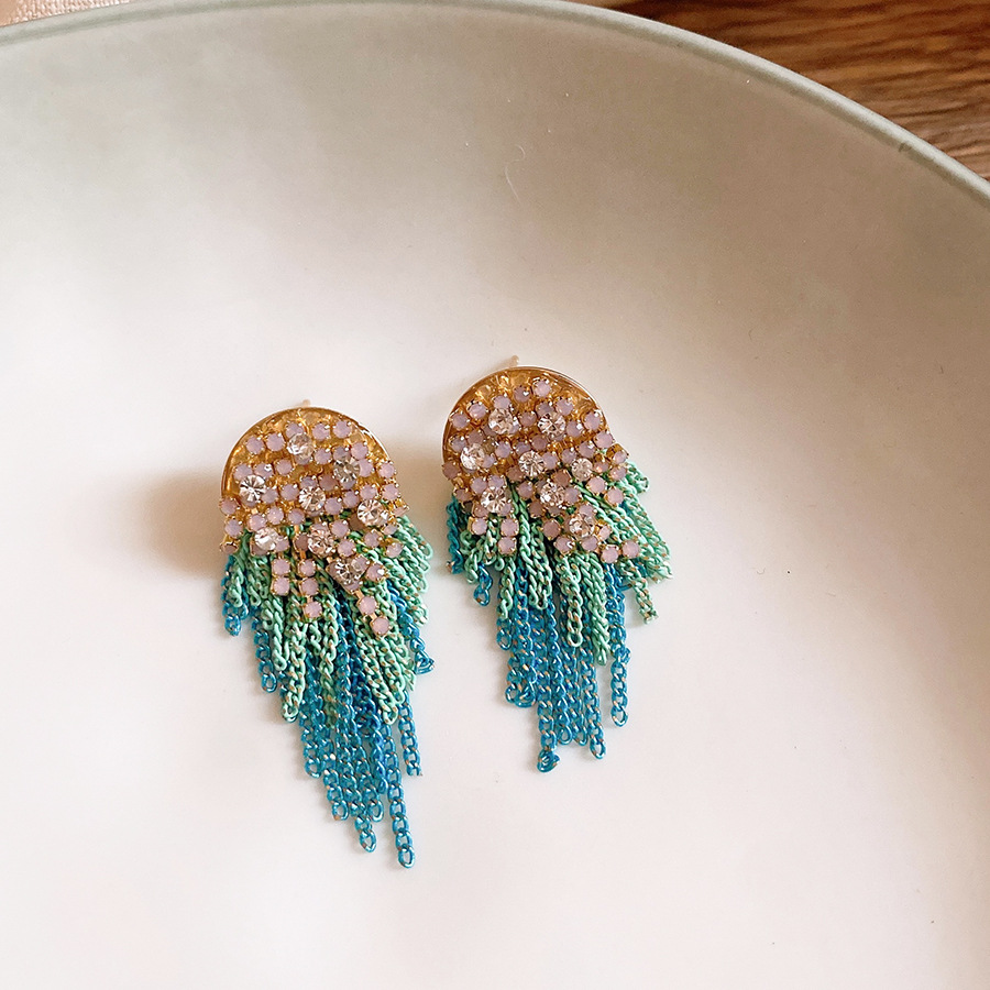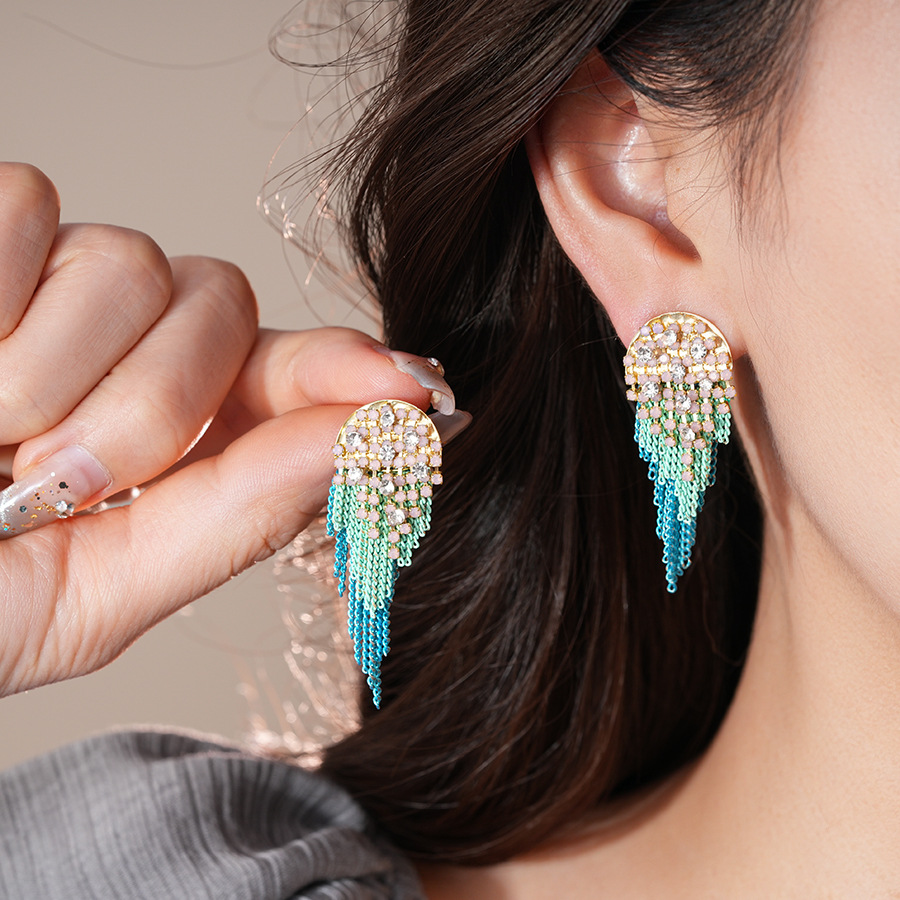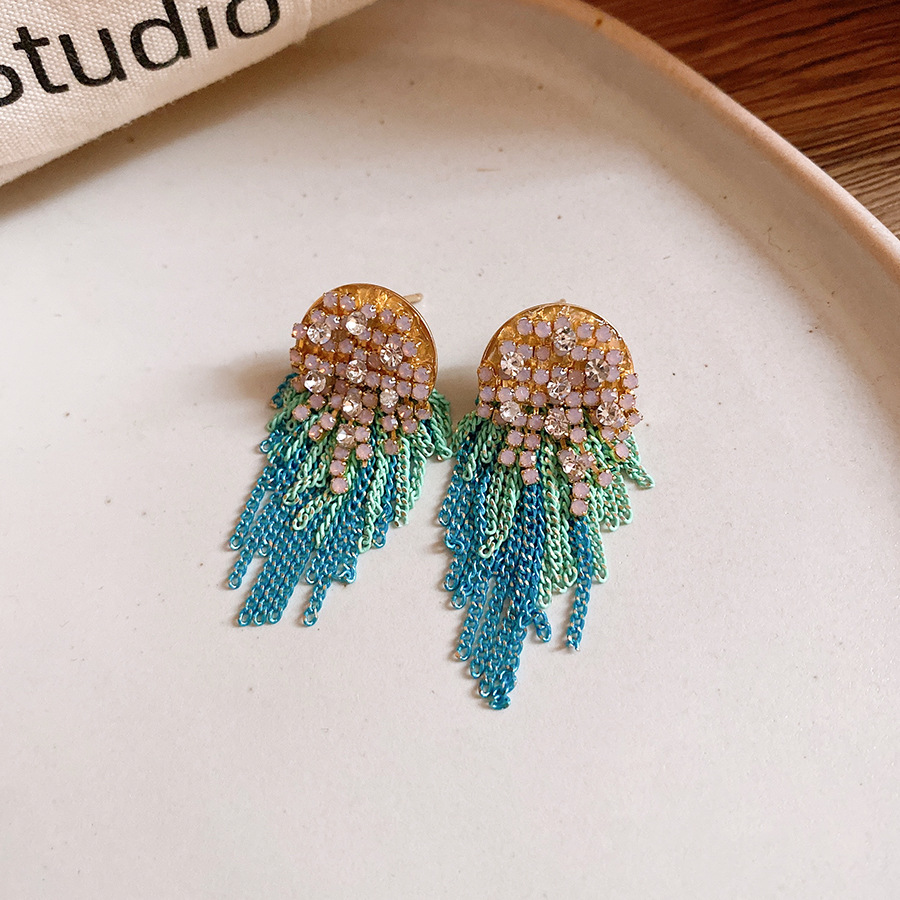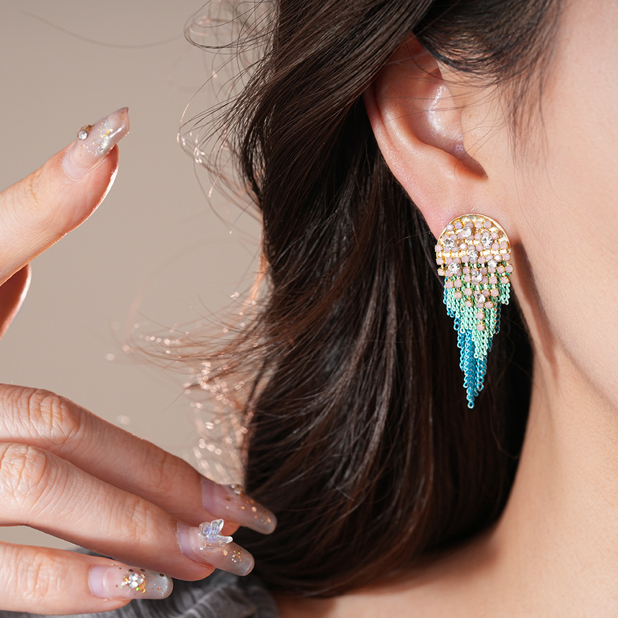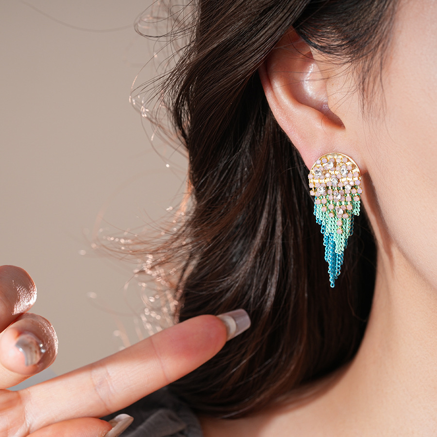 银针彩色镶钻链条流苏耳环欧美小众夸张耳钉时尚个性复古气质耳饰