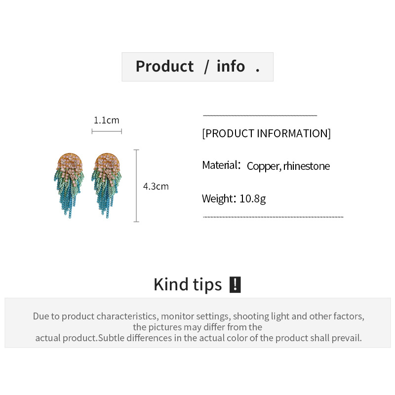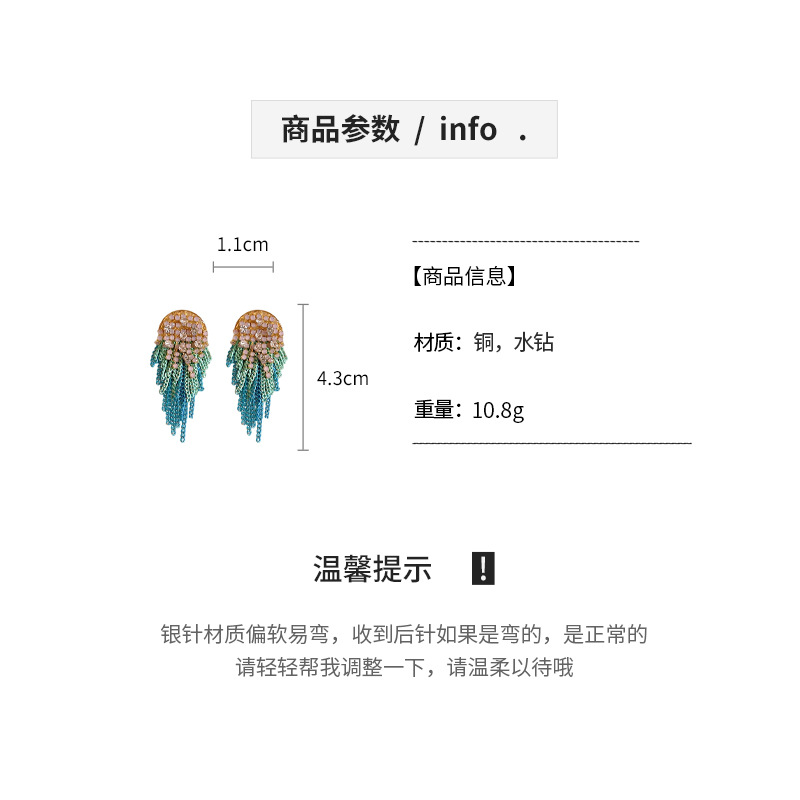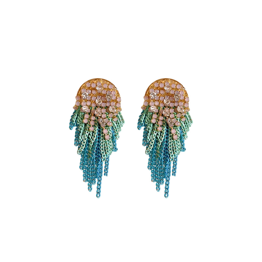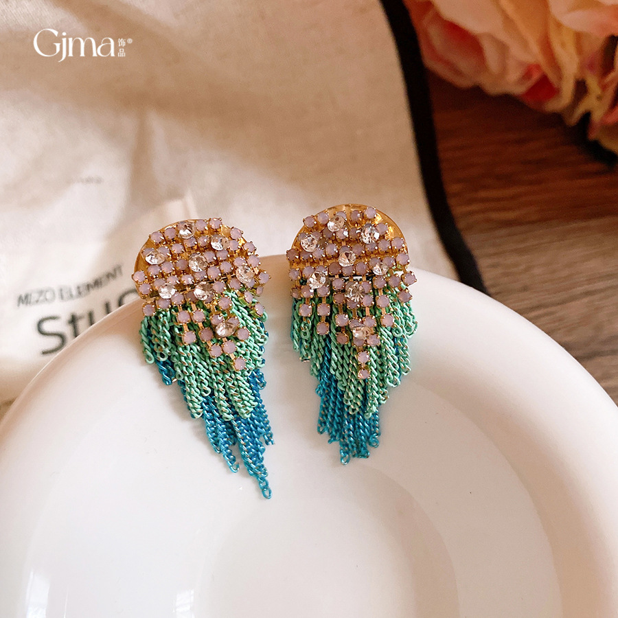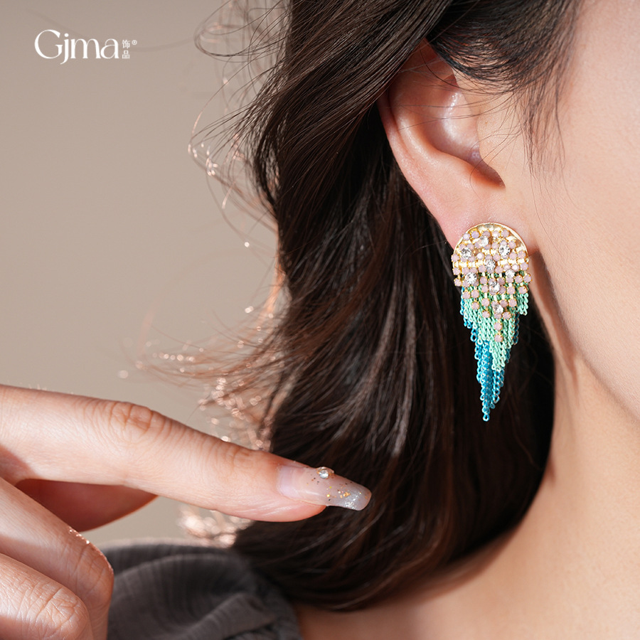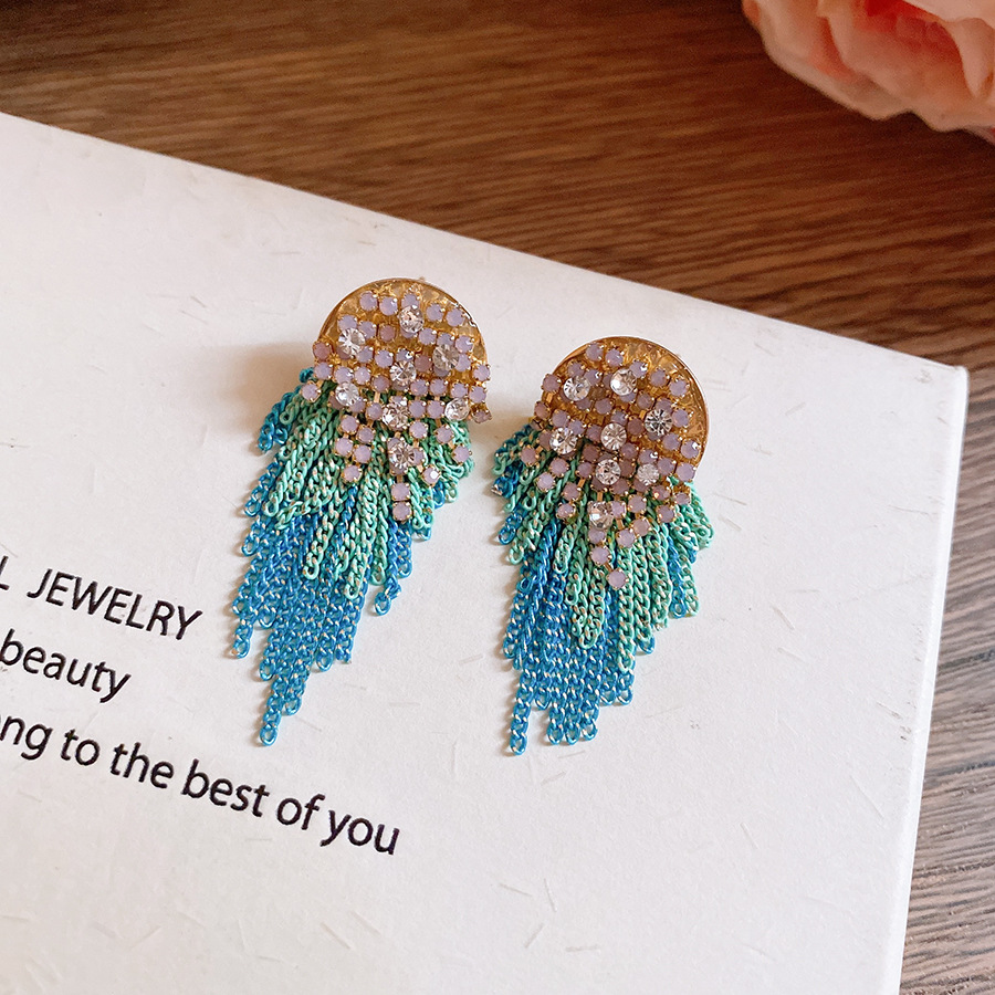 银针彩色镶钻链条流苏耳环欧美小众夸张耳钉时尚个性复古气质耳饰