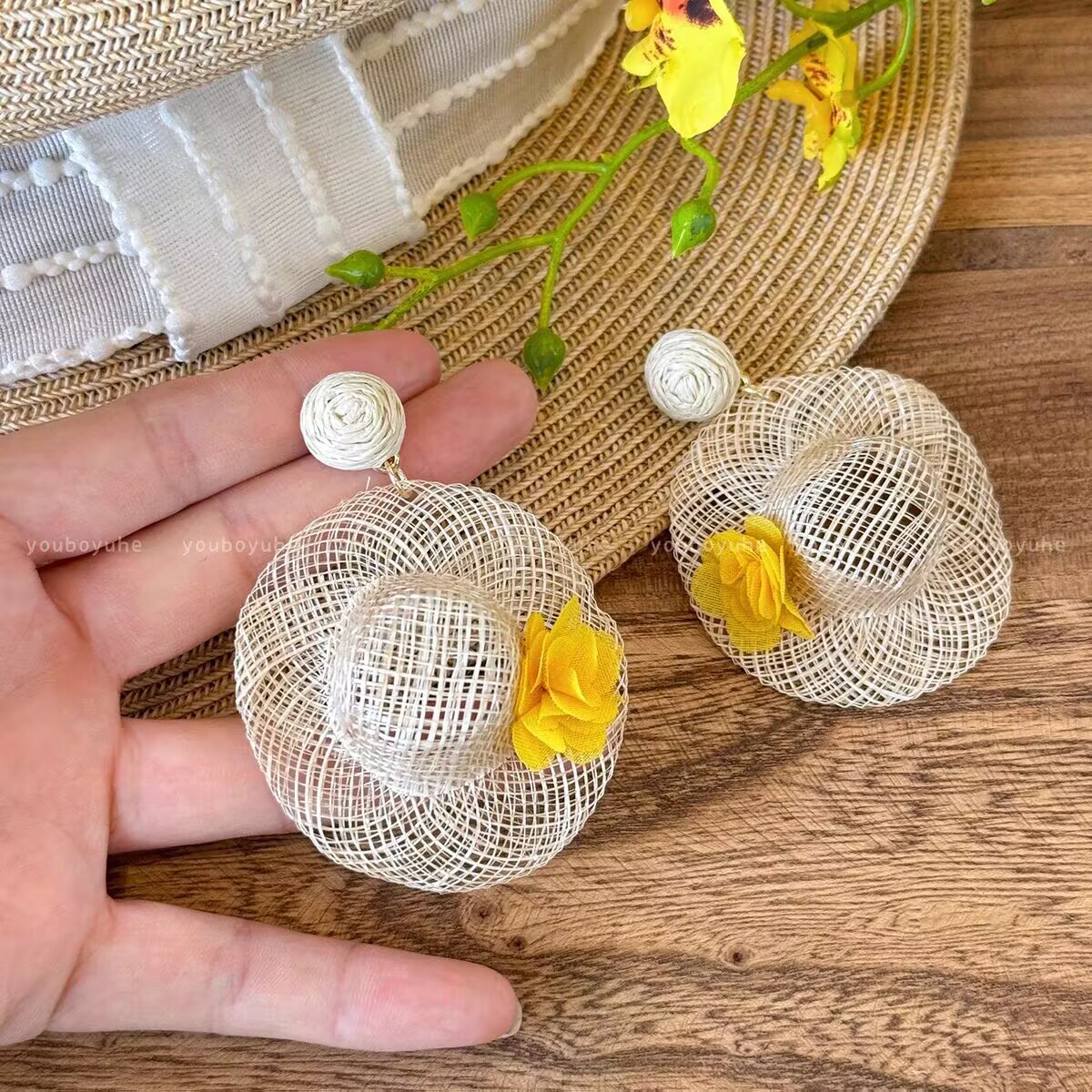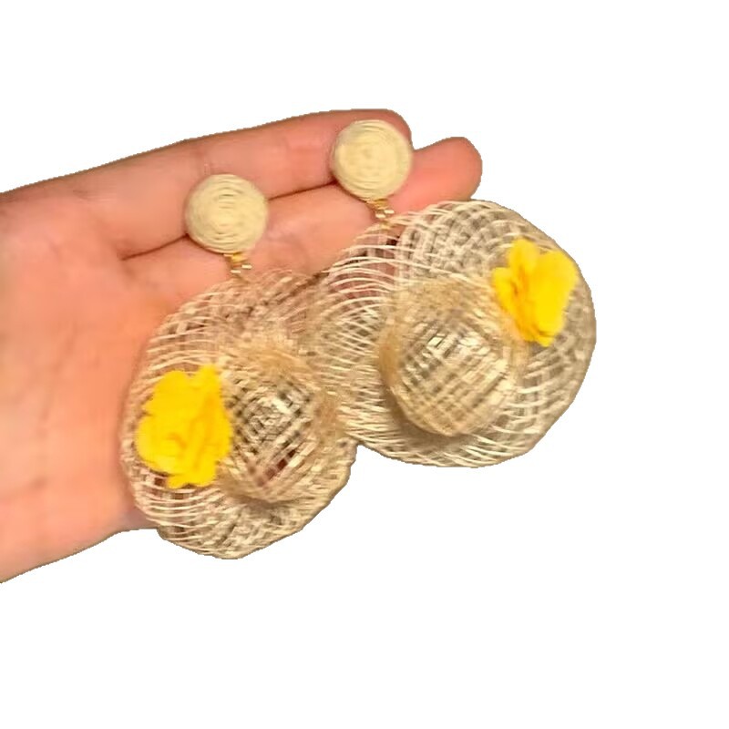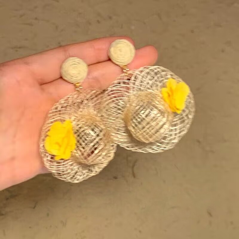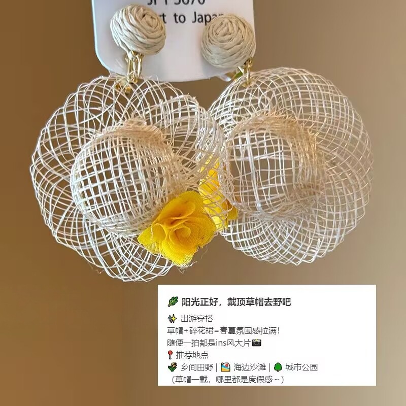 夏日度假风藤编帽子花朵耳环设计感小众耳钉个性轻奢高级感耳饰女