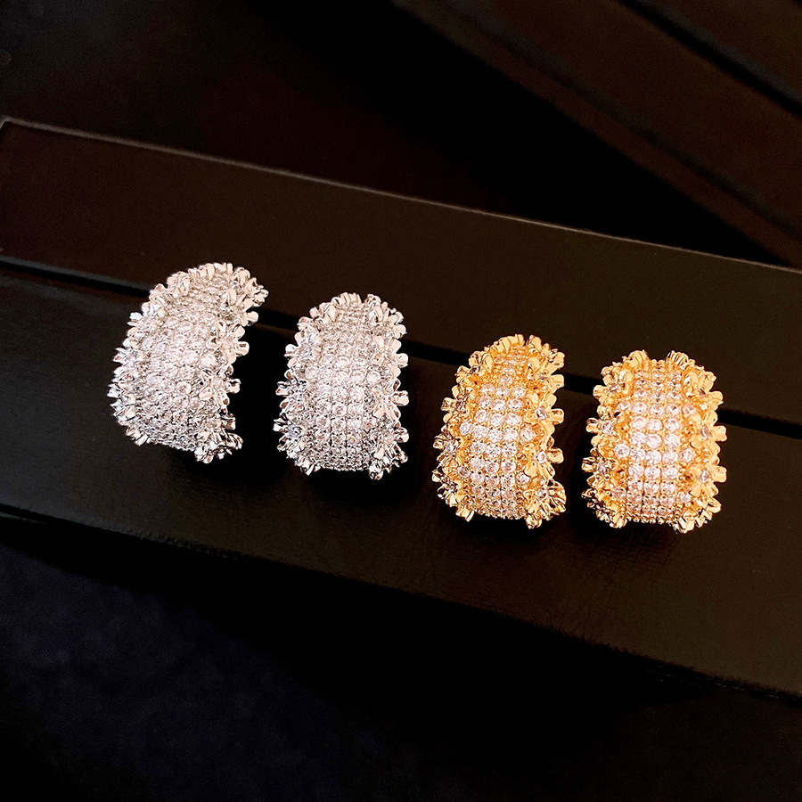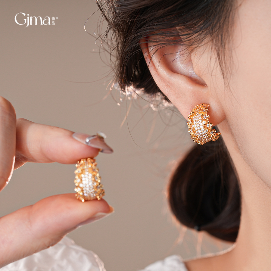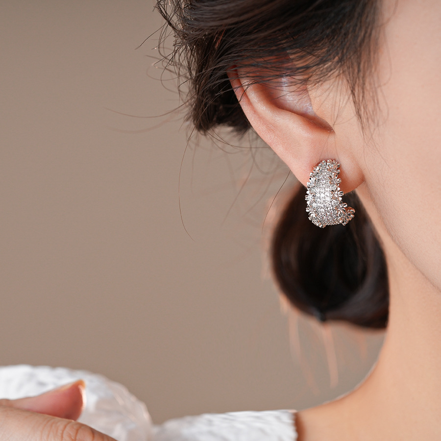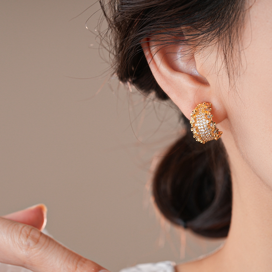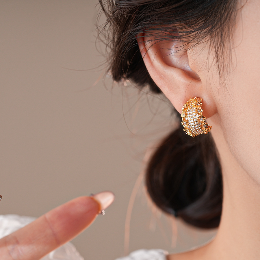 18k真金电镀锆石花边C形耳环轻奢高级感耳钉个性设计感小众耳饰女