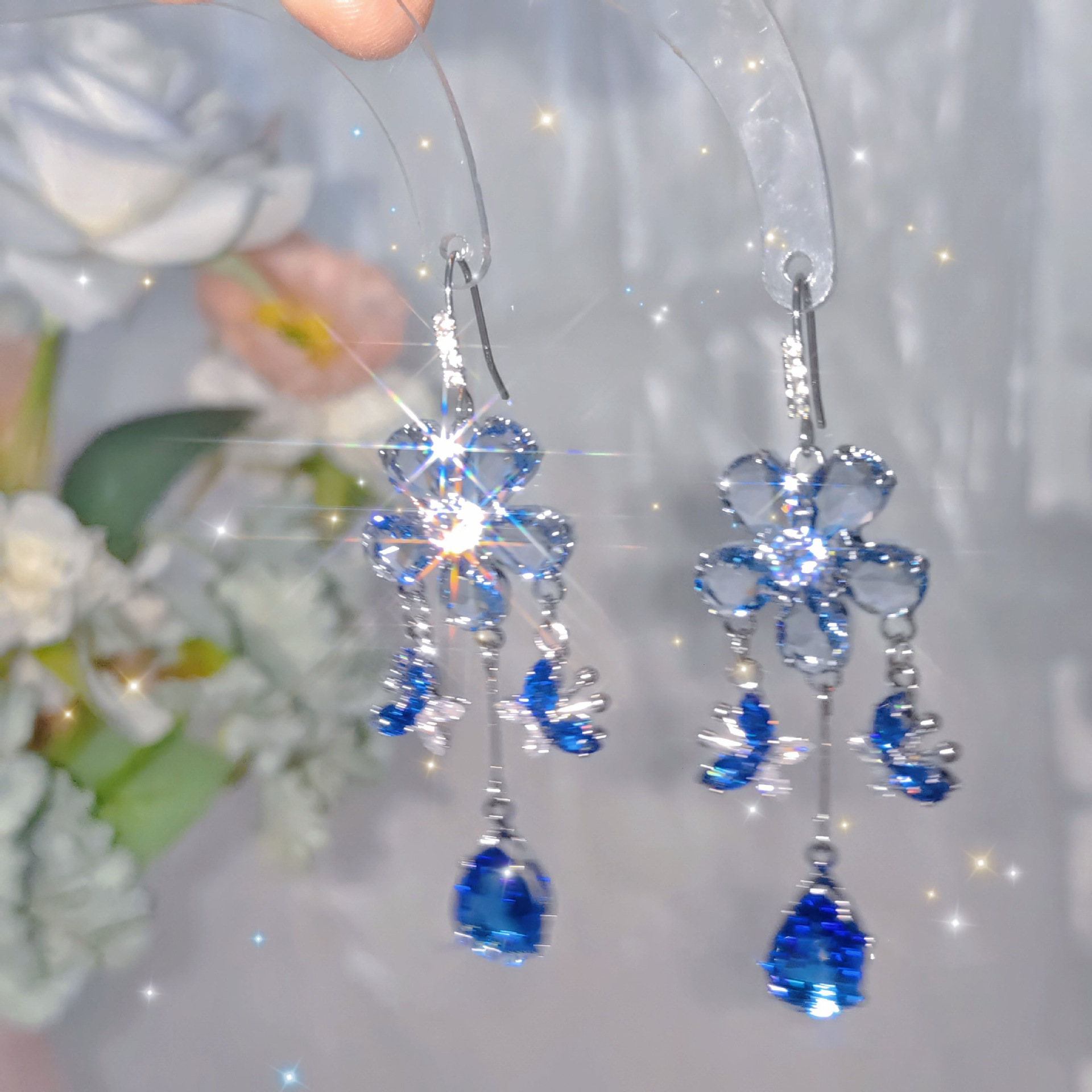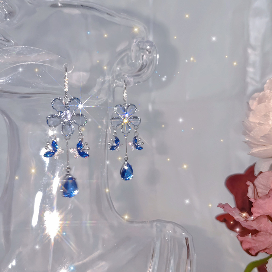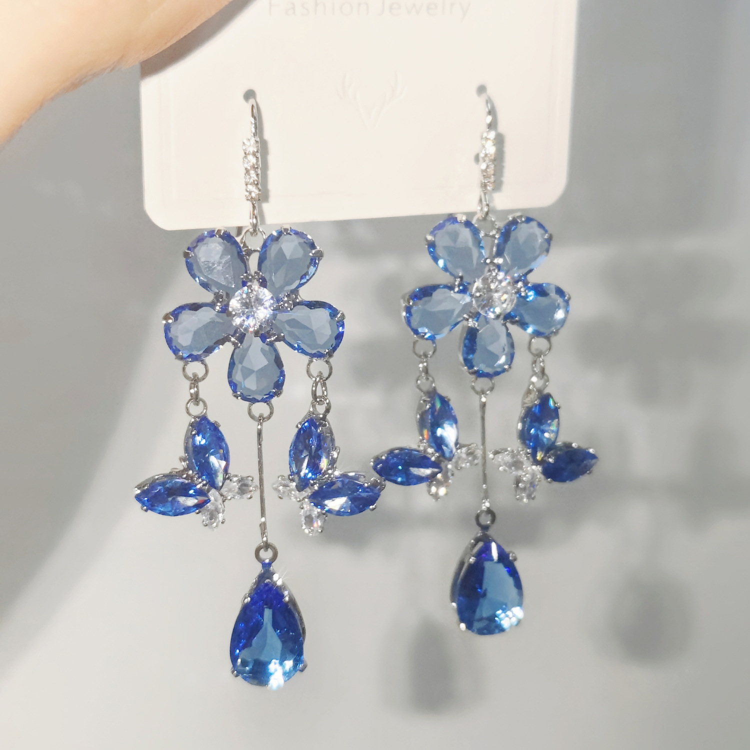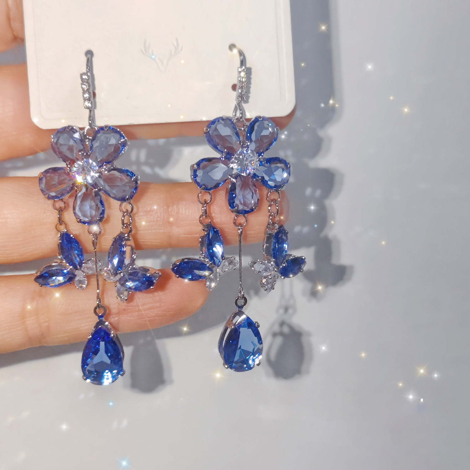 蓝色锆石花朵蝴蝶水滴流苏耳钩小众清冷感气质耳环轻奢高级感耳饰