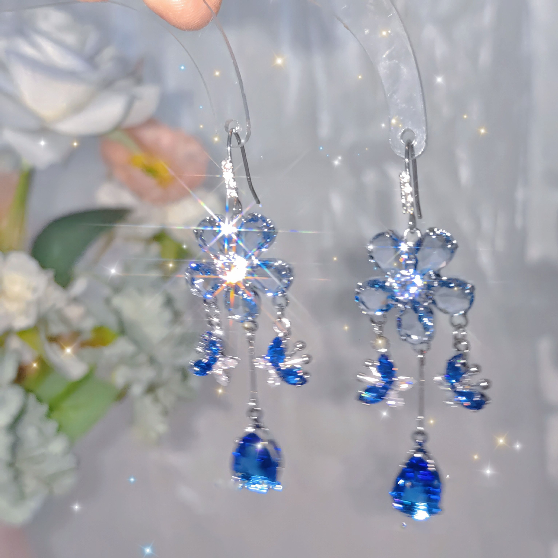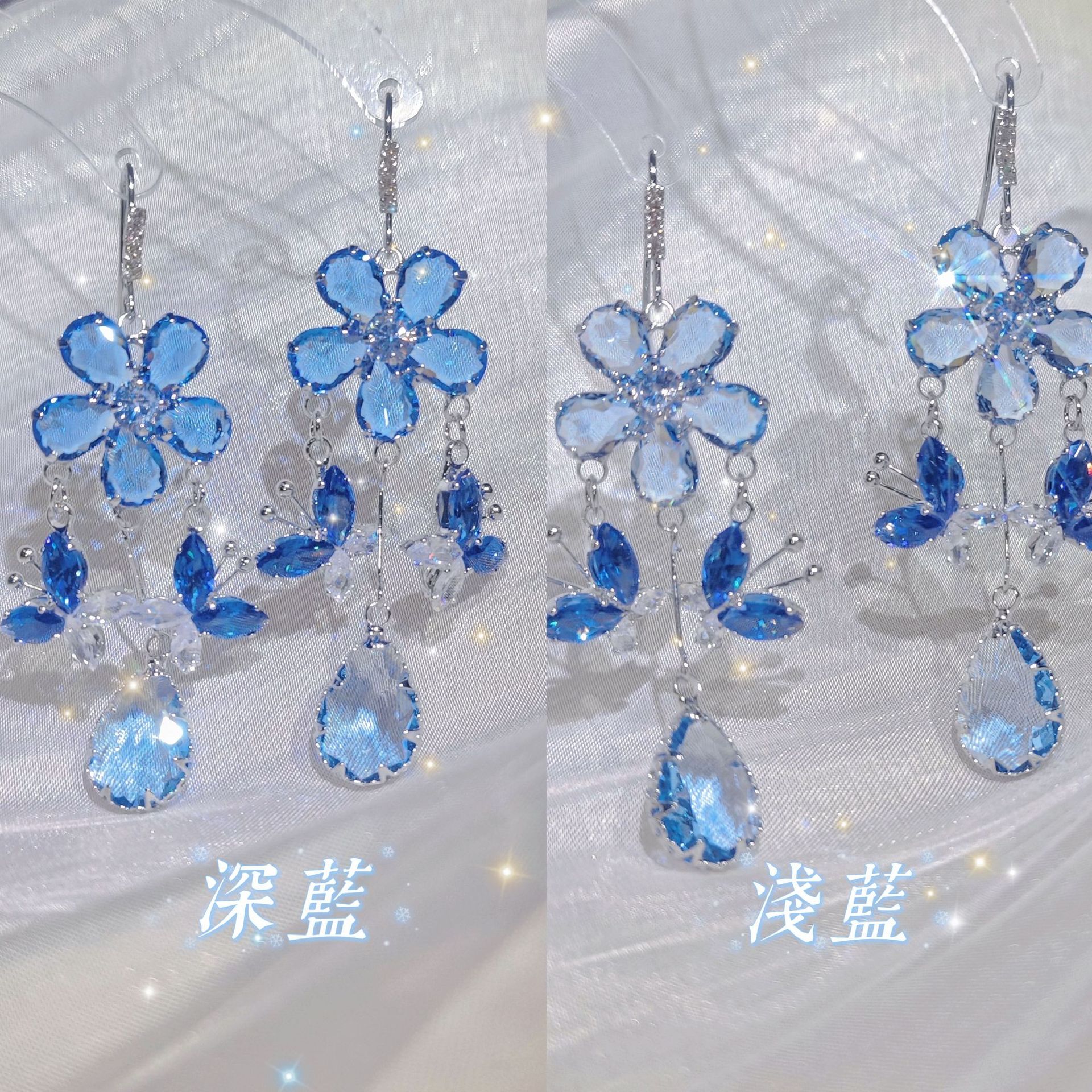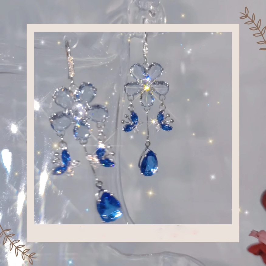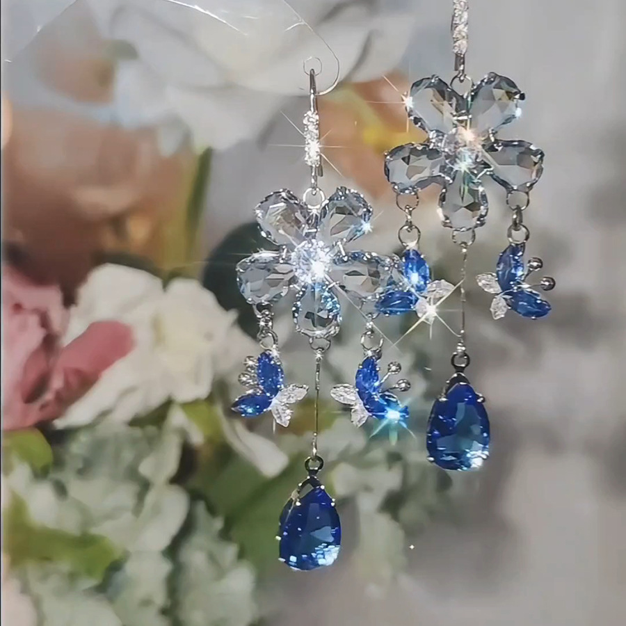 蓝色锆石花朵蝴蝶水滴流苏耳钩小众清冷感气质耳环轻奢高级感耳饰