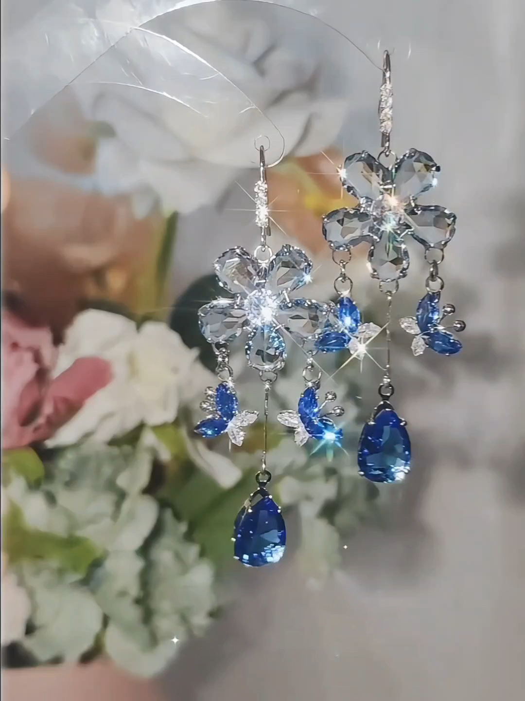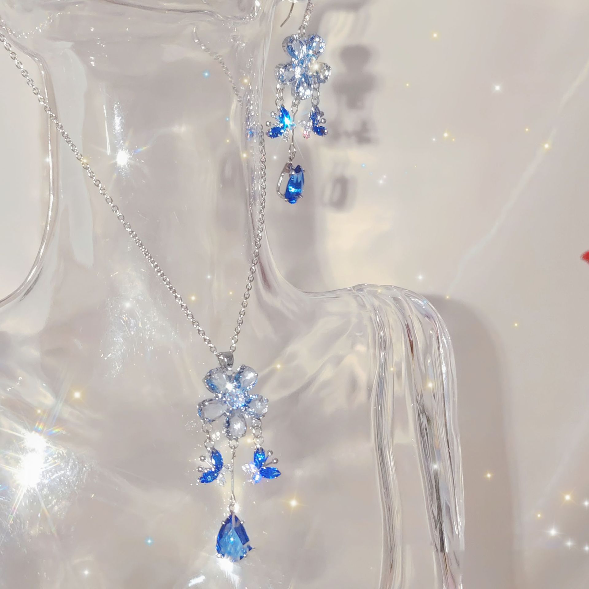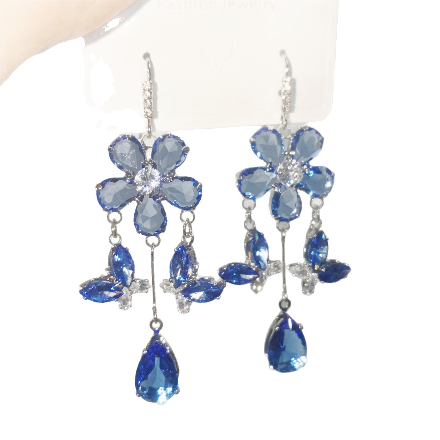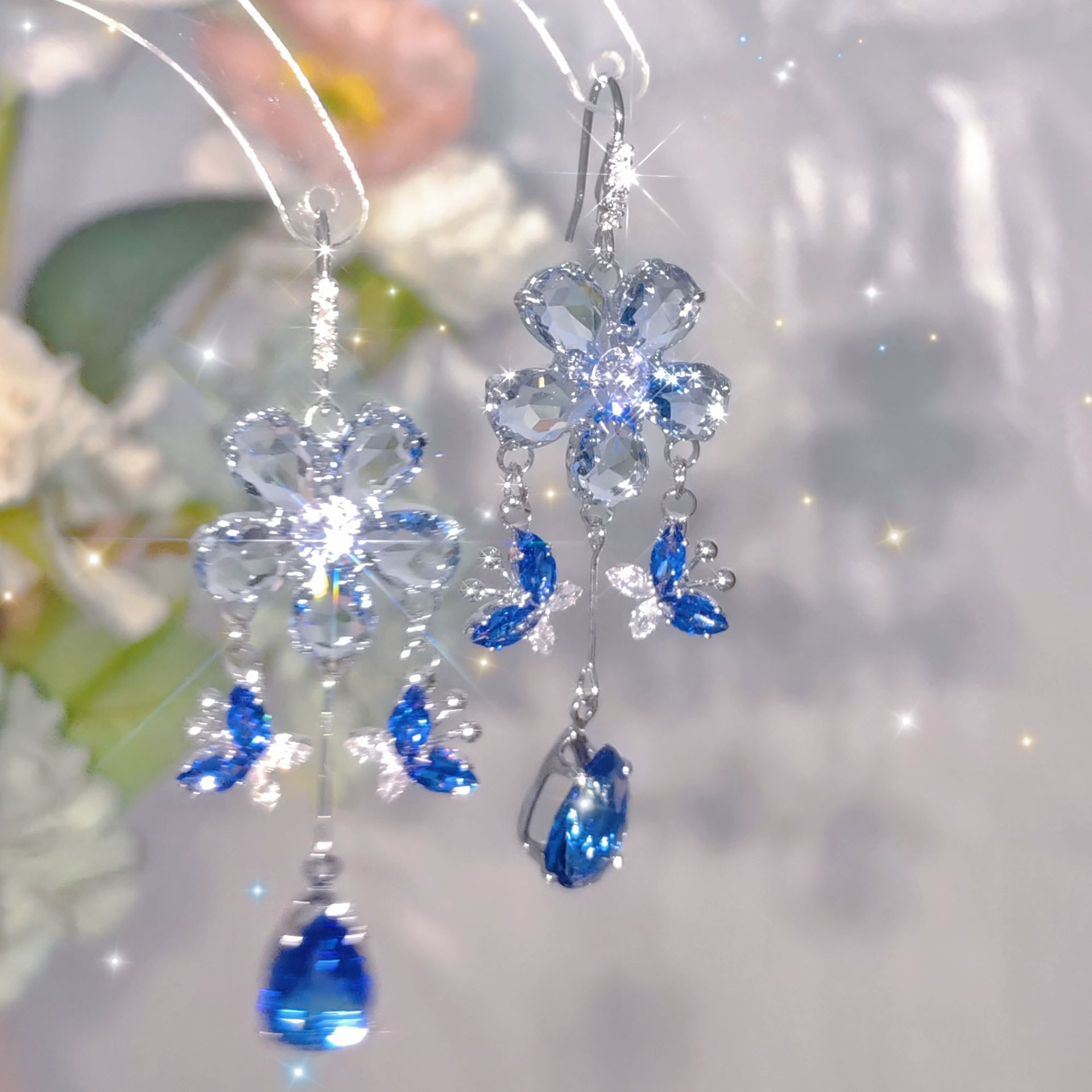 蓝色锆石花朵蝴蝶水滴流苏耳钩小众清冷感气质耳环轻奢高级感耳饰
