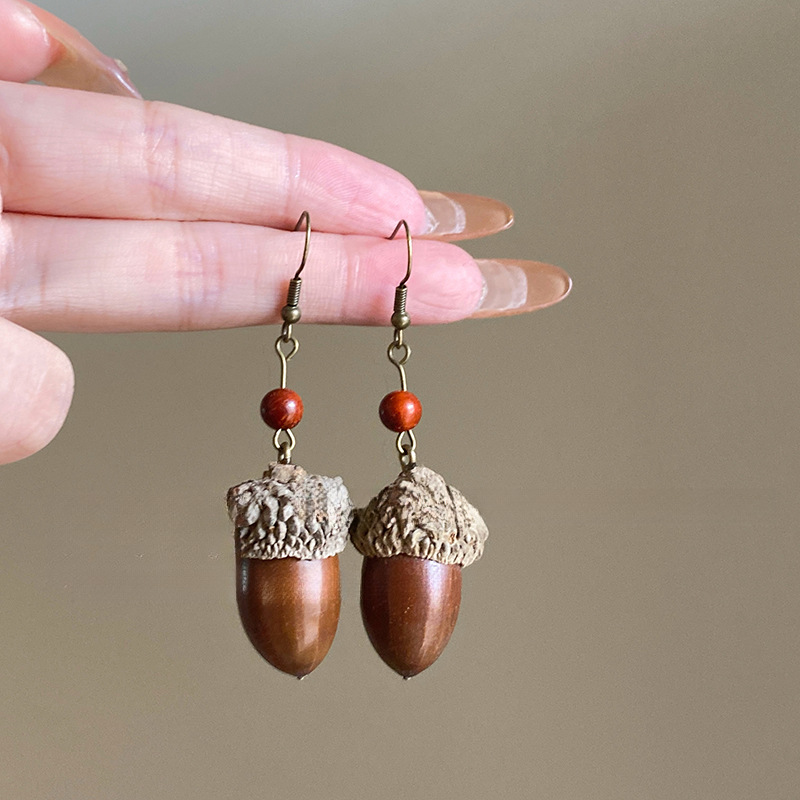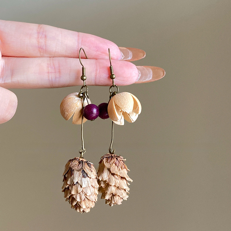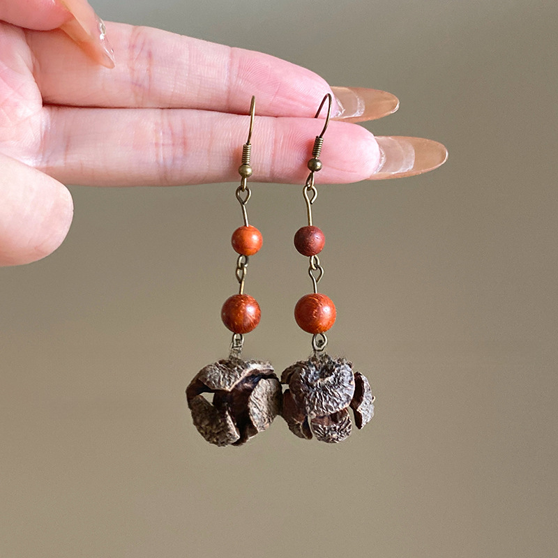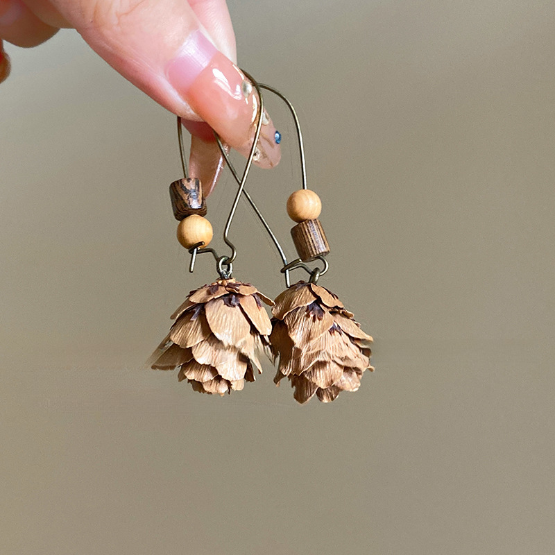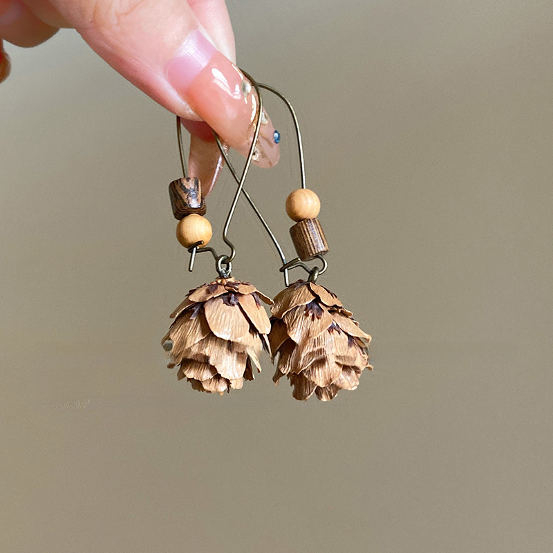 法式复古木珠松子吊坠耳环轻奢高级感耳钩时尚个性耳饰设计感小众