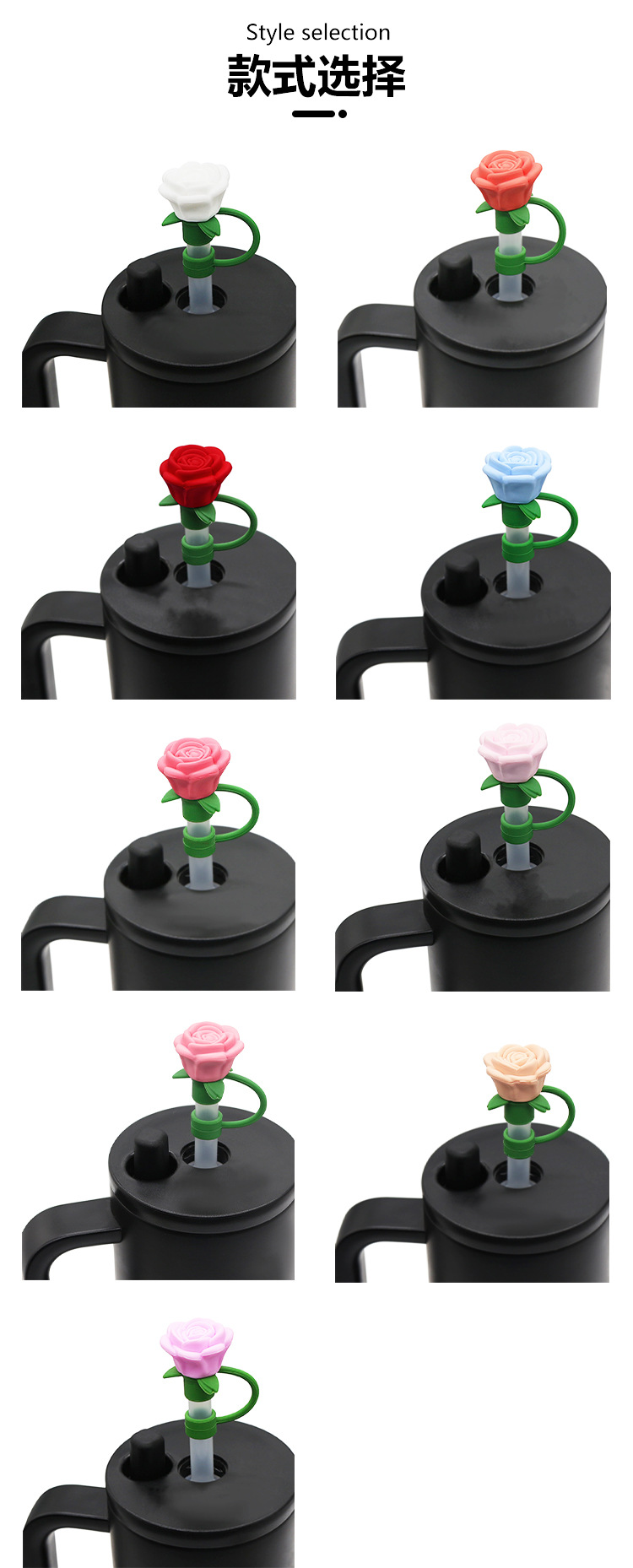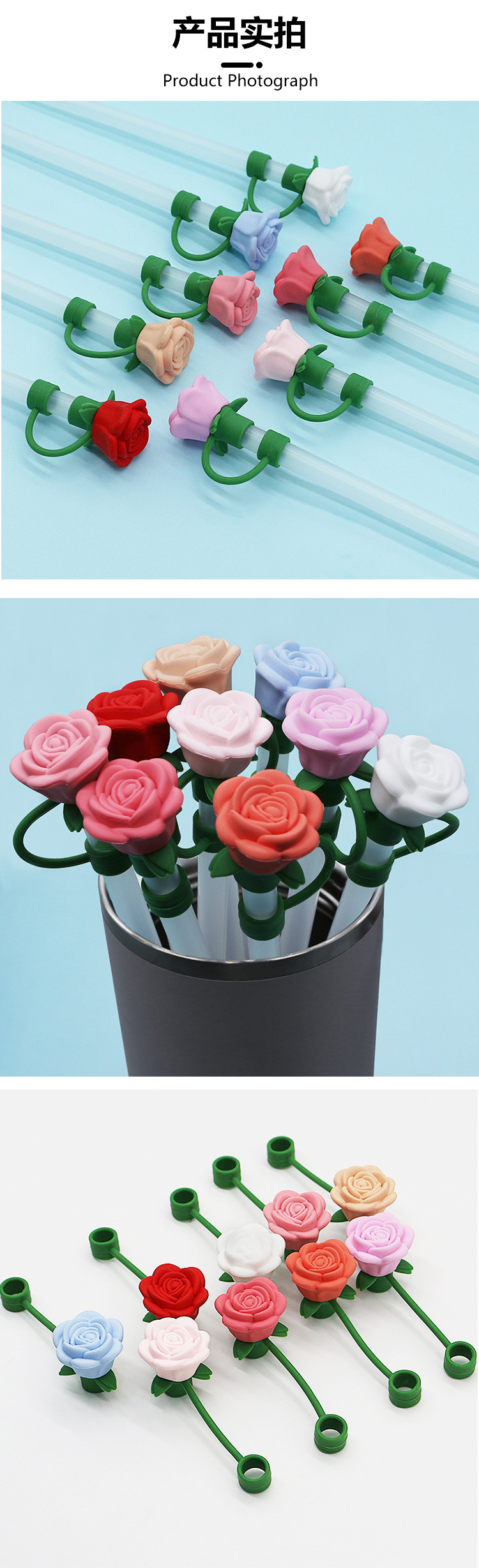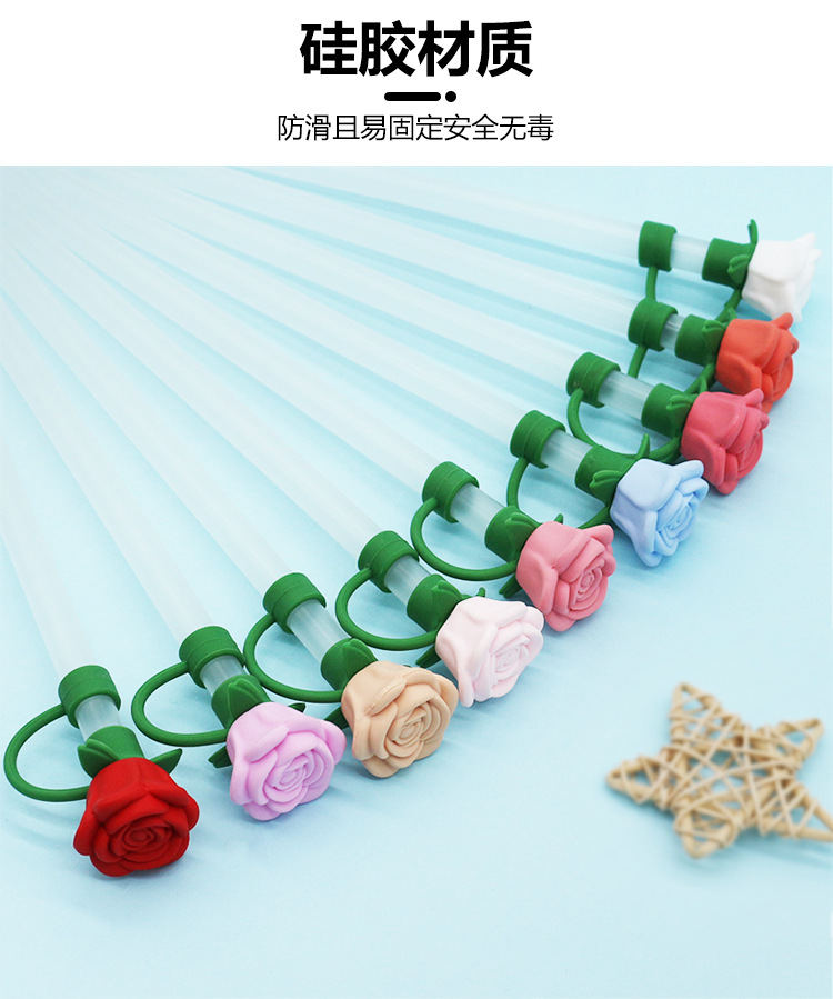 亚马逊立体硅胶10mm吸管帽跨境可爱玫瑰吸管防尘可循环使用吸管帽