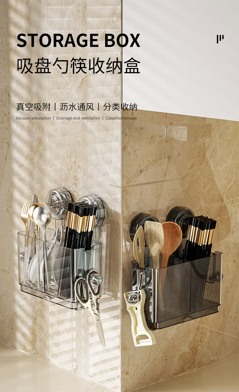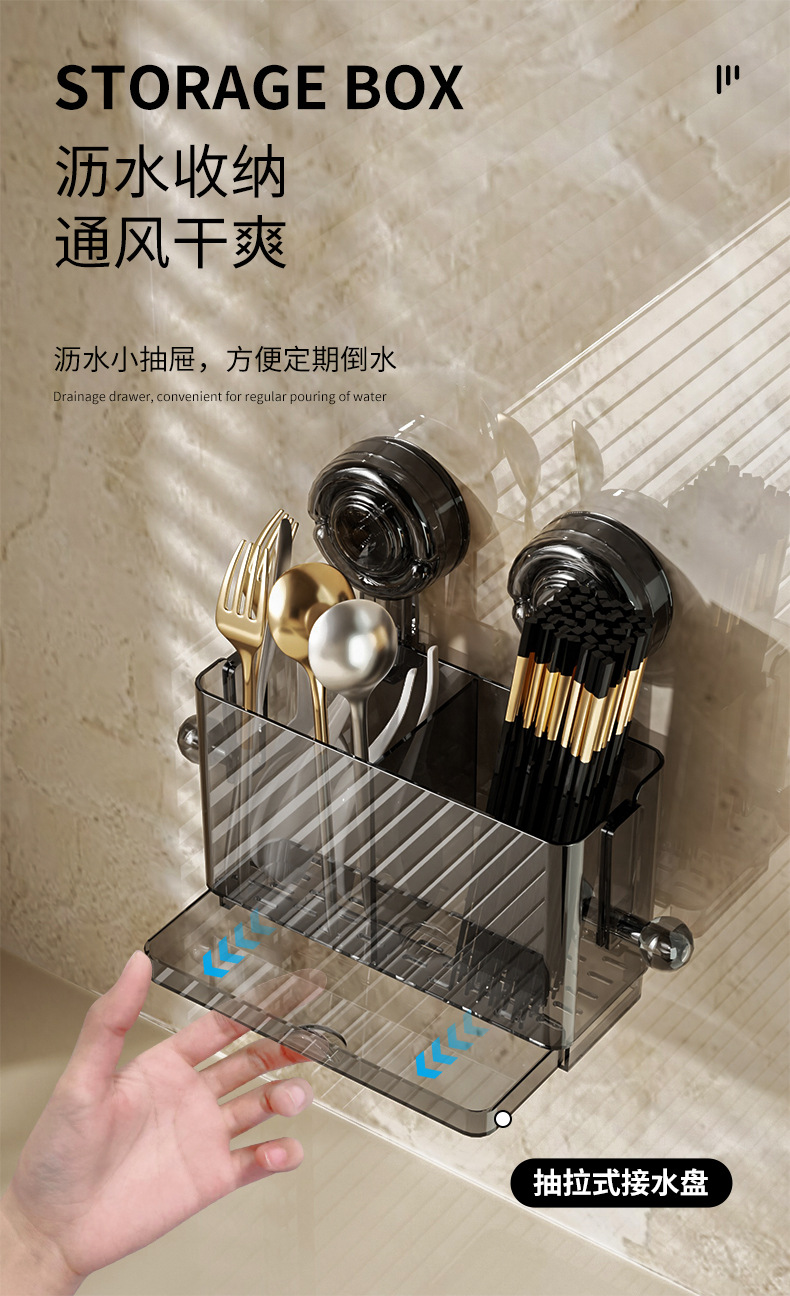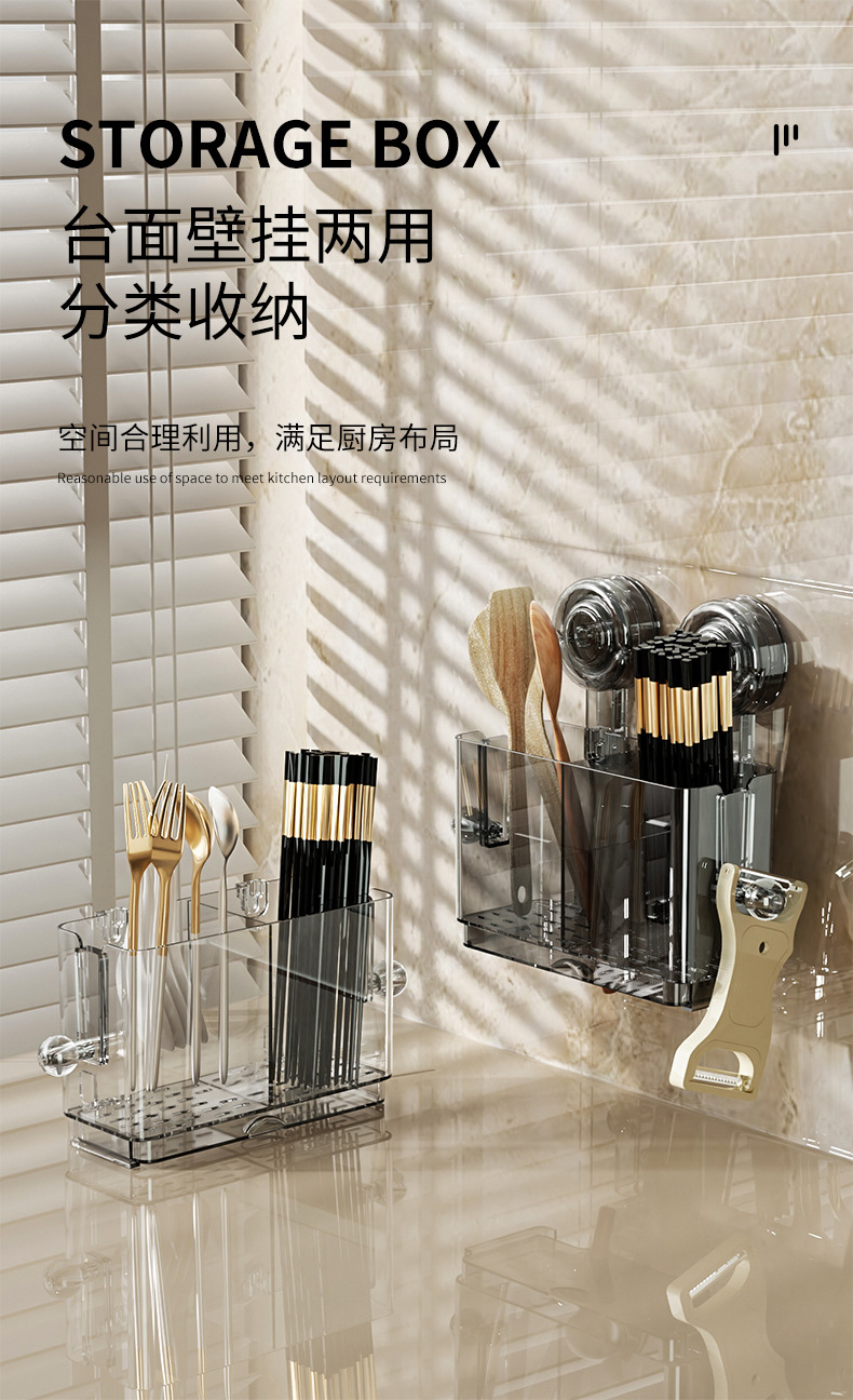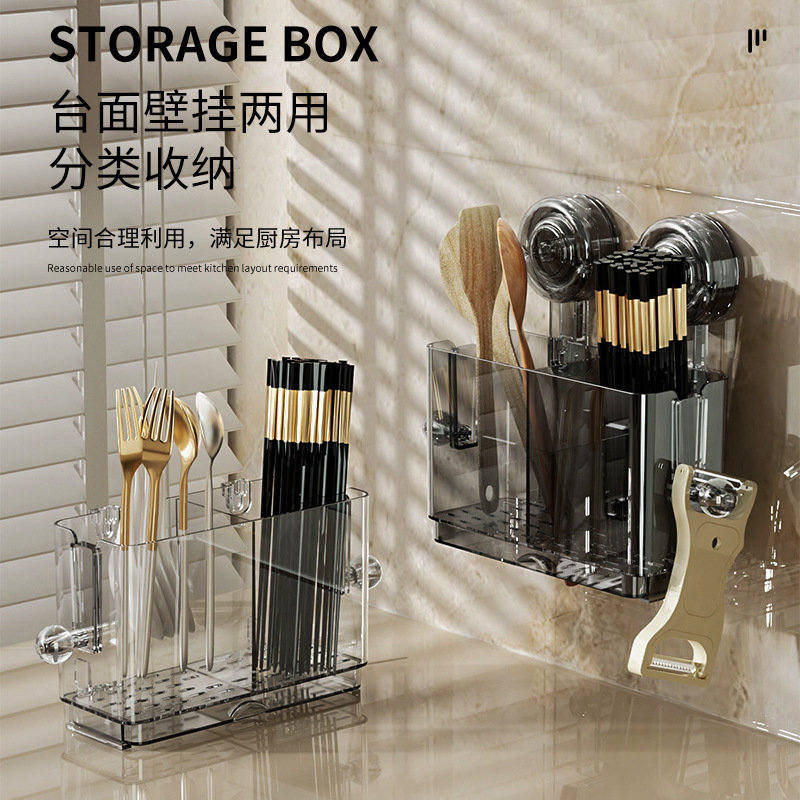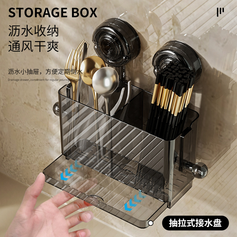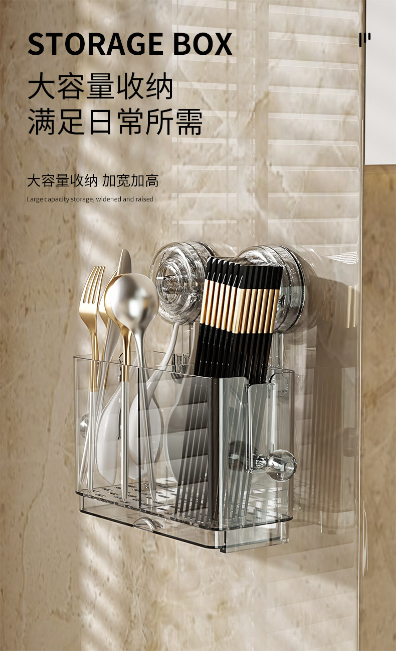 家用厨房收纳盒免打孔沥水轻奢透明置物架吸盘筷子餐具置物收纳盒