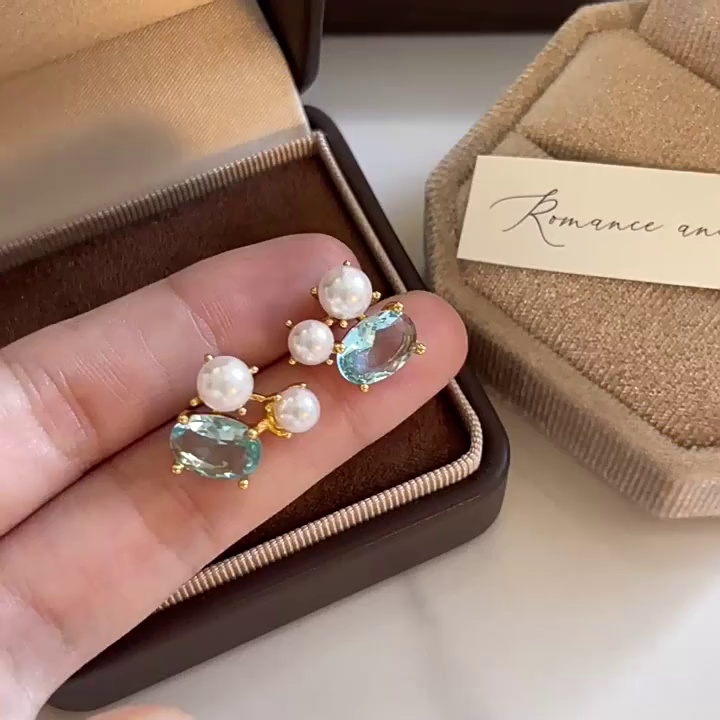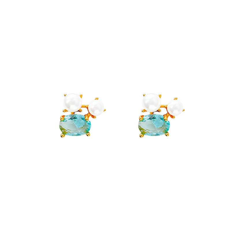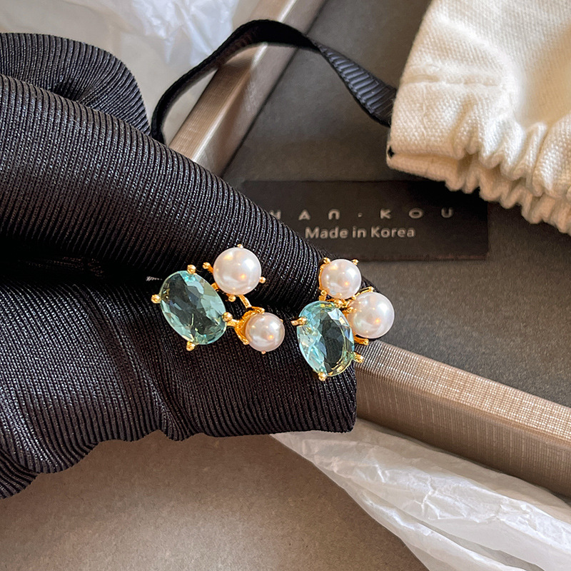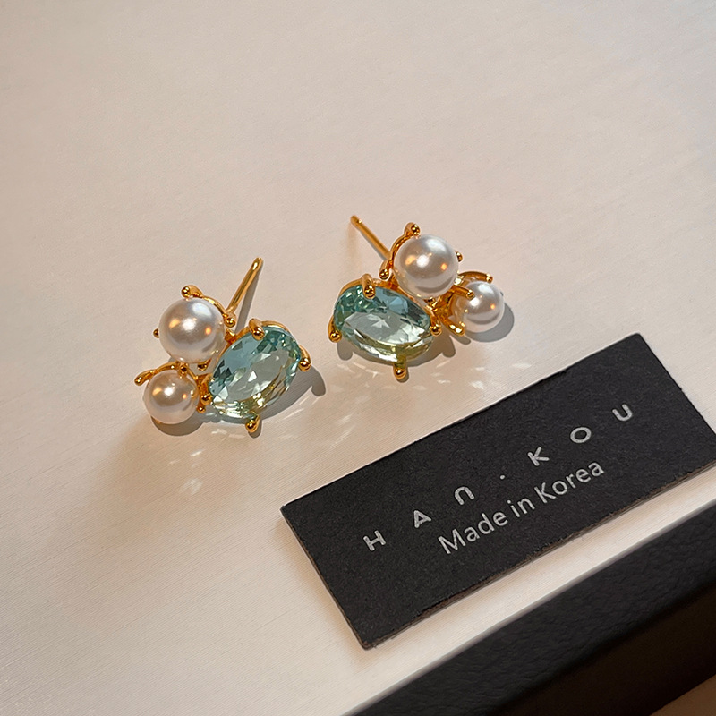 真金电镀简约网红同款珍珠耳钉S925纯银针森系橄榄绿超闪锆石耳环
