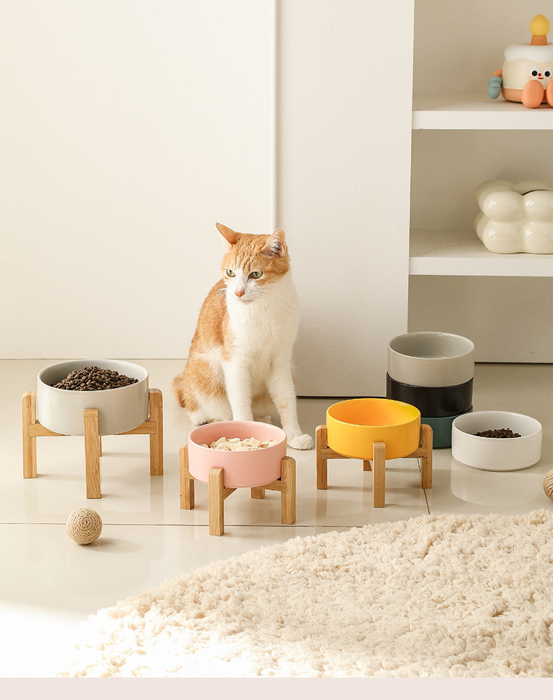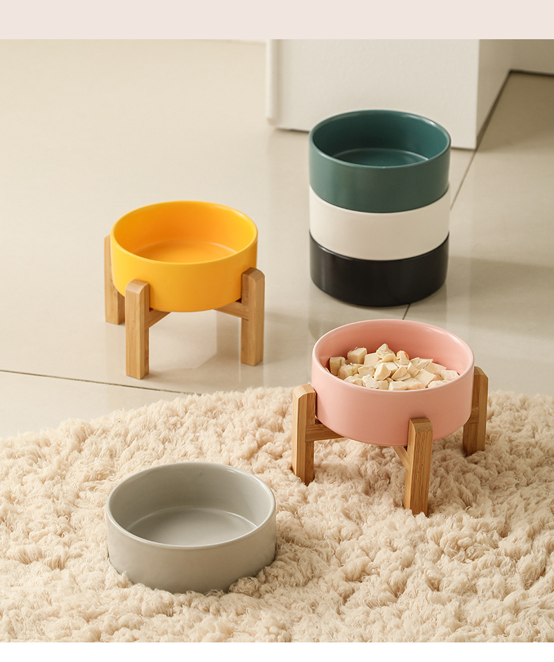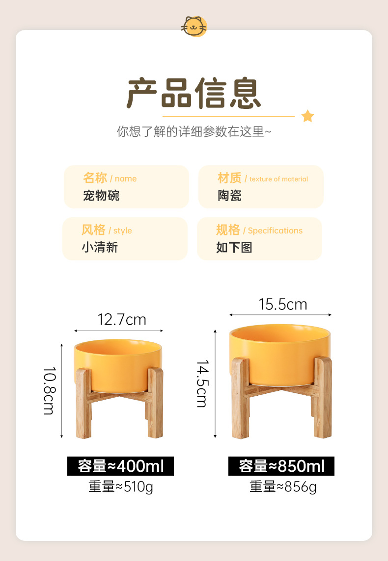 宠物狗食盆狗粮碗猫咪碗陶瓷猫碗加高竹木架保护颈椎喝水碗防打翻