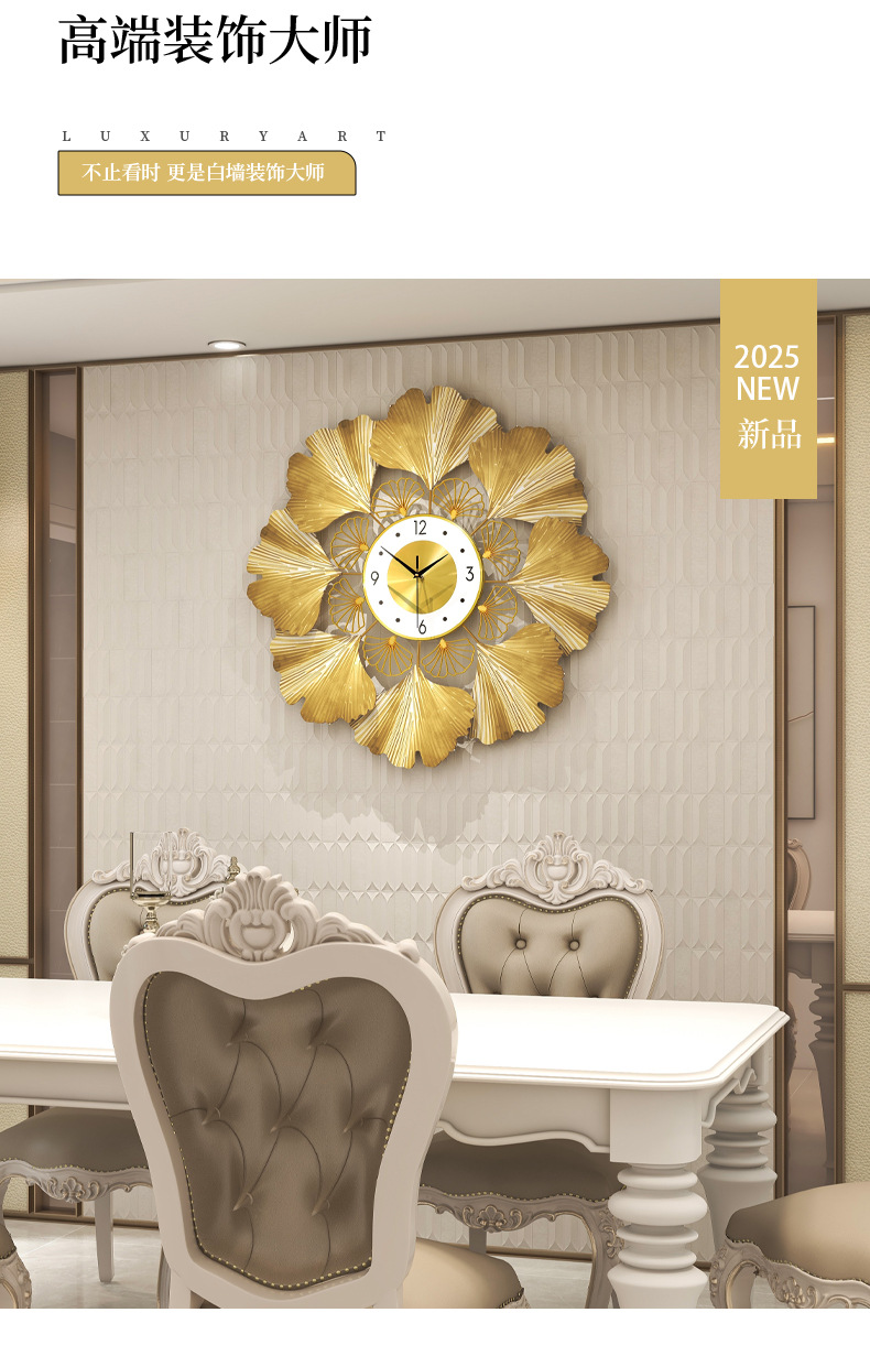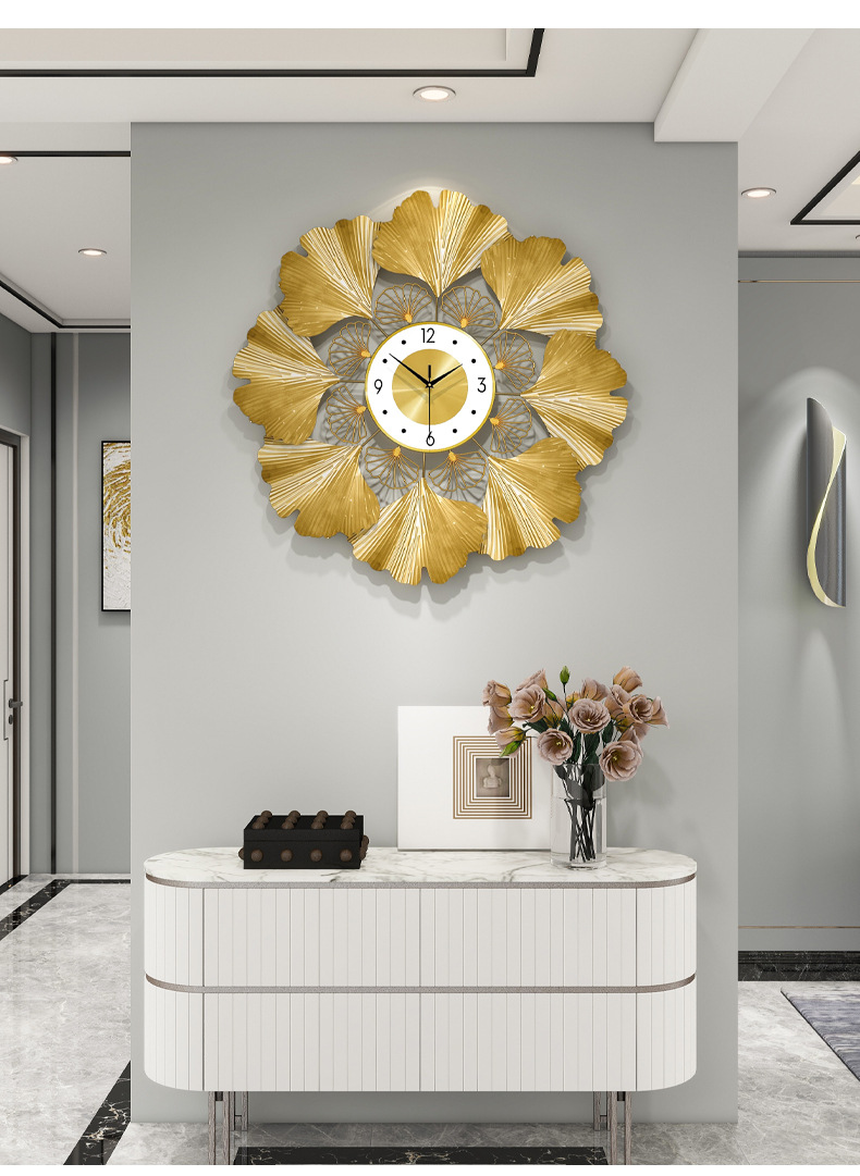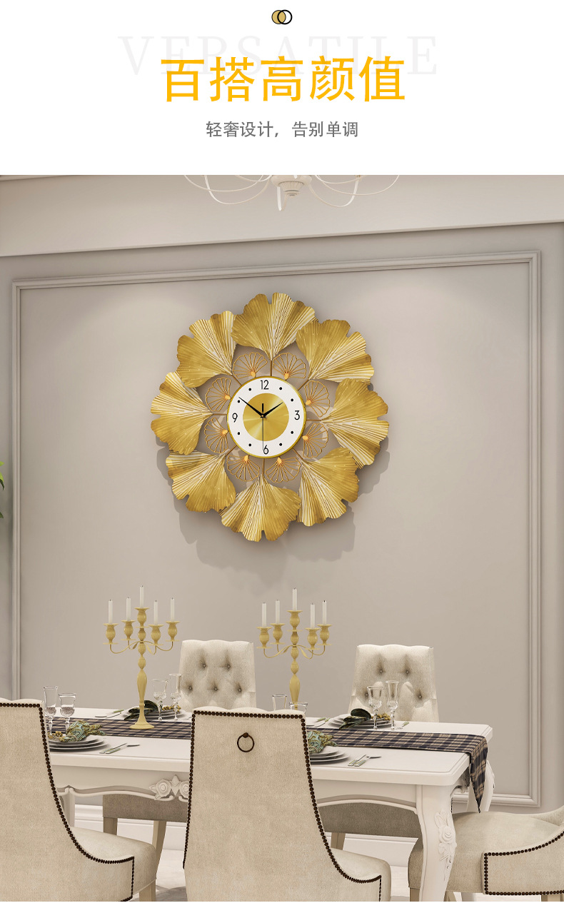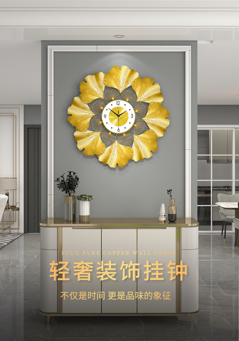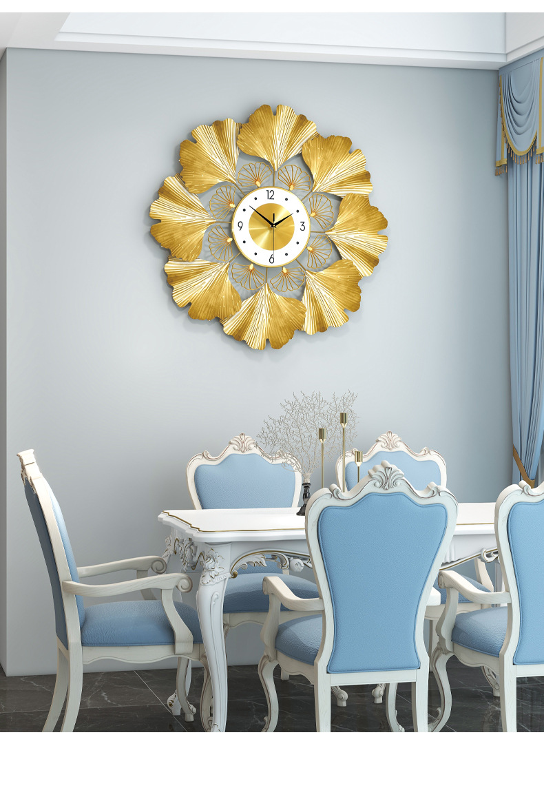 银杏叶创意挂钟欧式轻奢钟表 客厅美式简约家居装饰艺术时钟挂墙