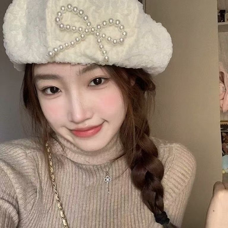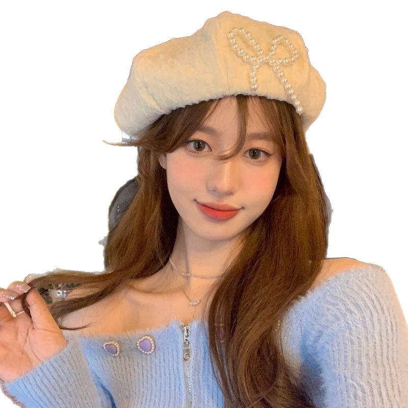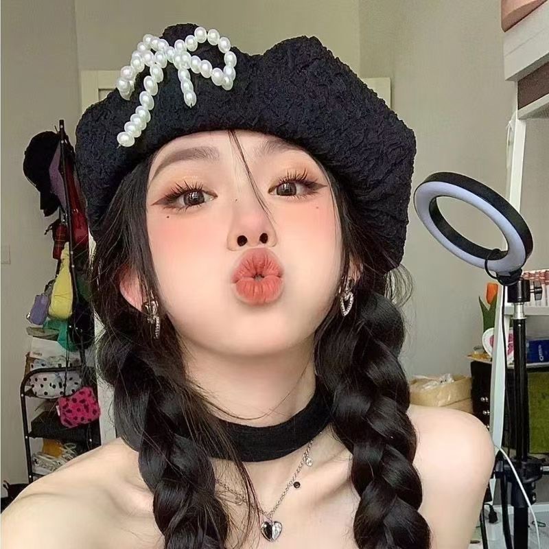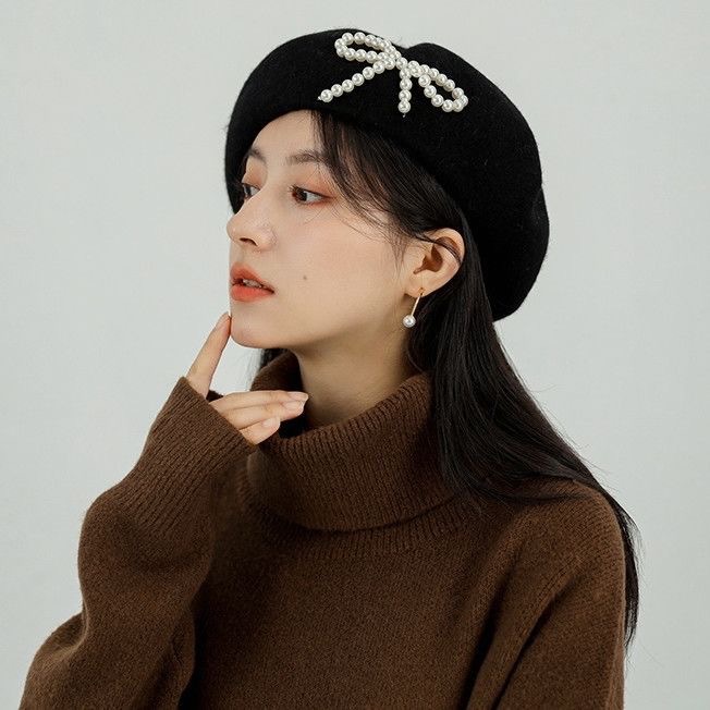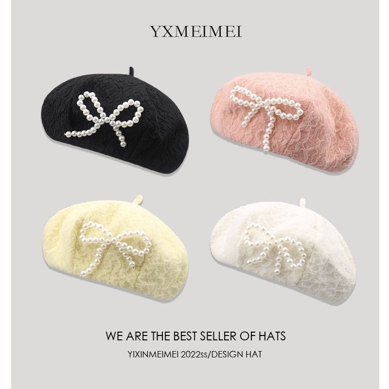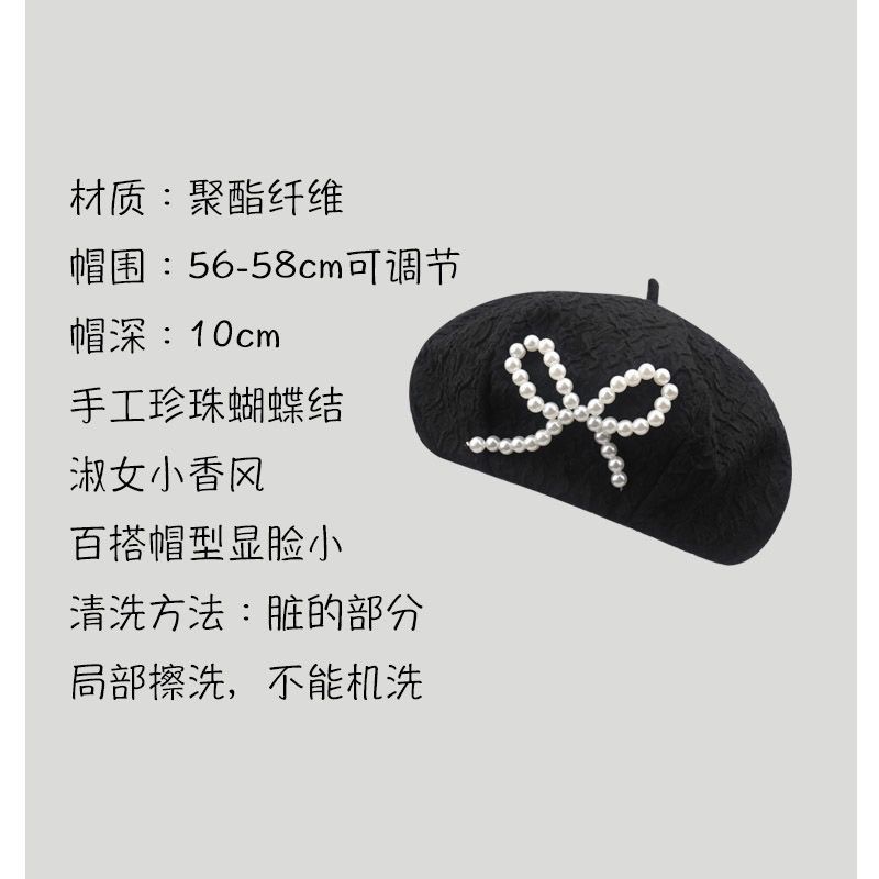 小香风格黑色贝雷帽女春秋款网红泡泡纱薄款珍珠蝴蝶结画家帽日系
