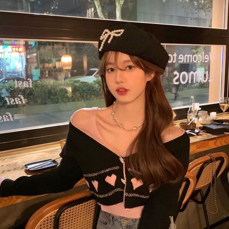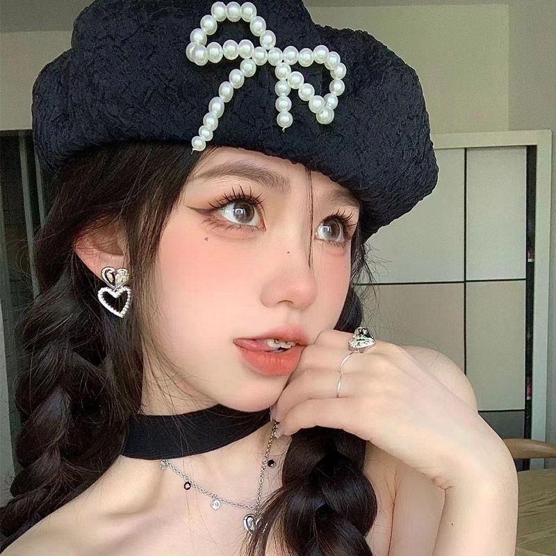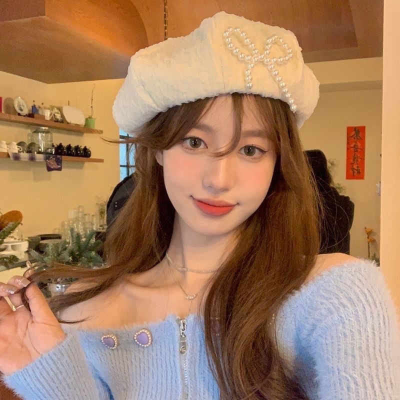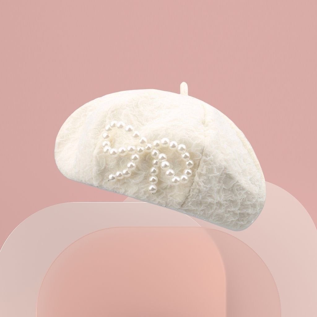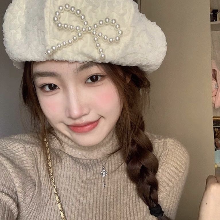 小香风格黑色贝雷帽女春秋款网红泡泡纱薄款珍珠蝴蝶结画家帽日系
