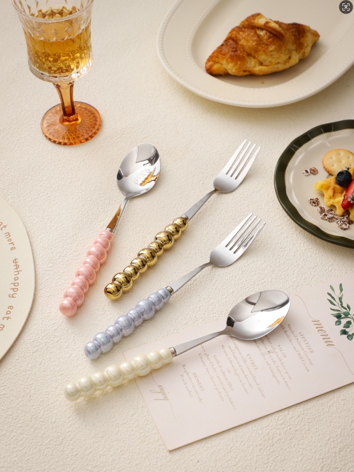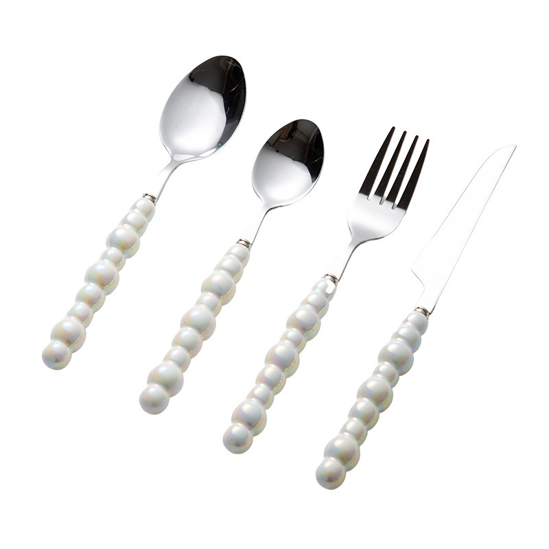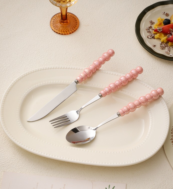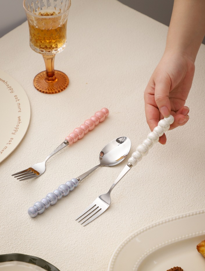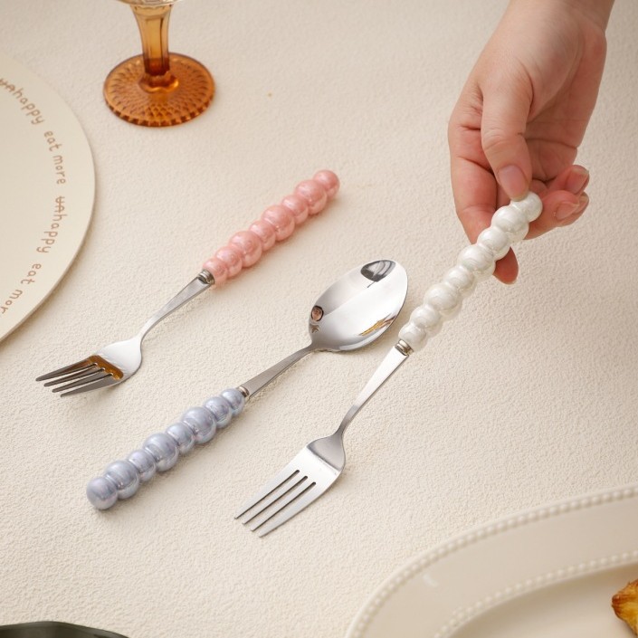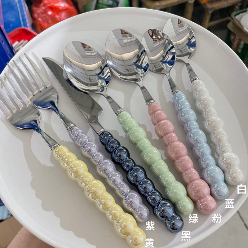 批发创意网红不锈钢勺珍珠陶瓷柄学生吃饭餐勺子叉子汤勺甜品调羹