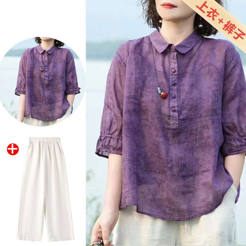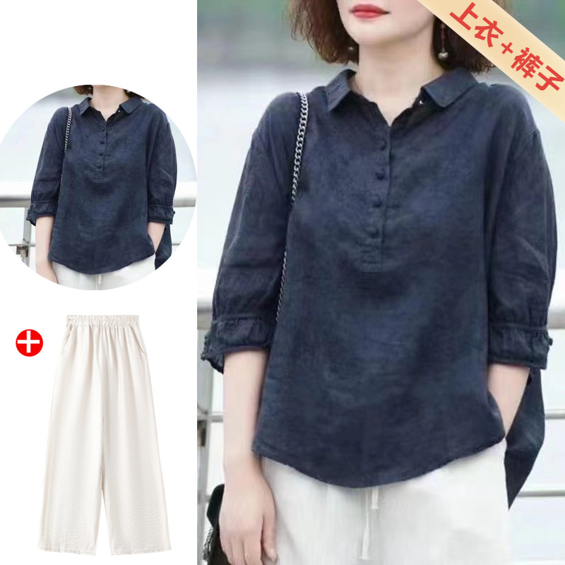 中老年女装绵绸套装妈妈款洋气2024春夏装新款中年女士衬衫两件套