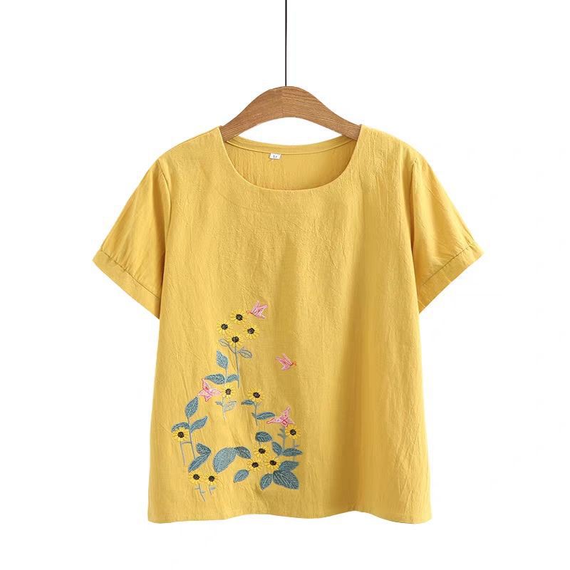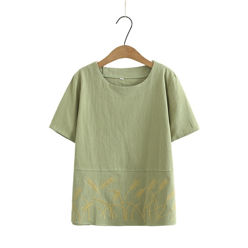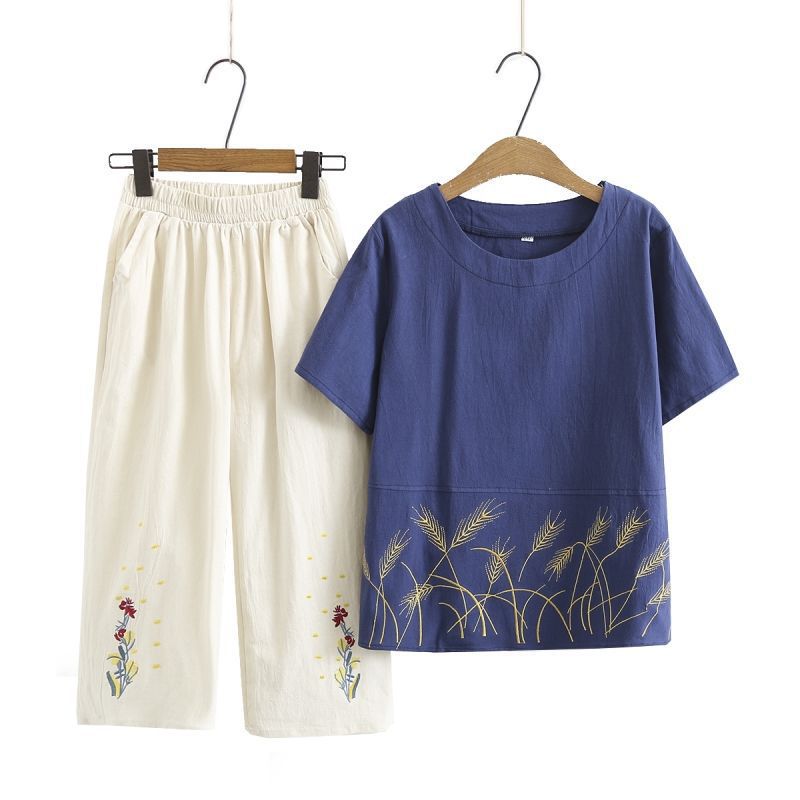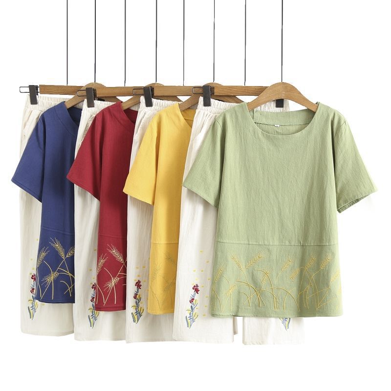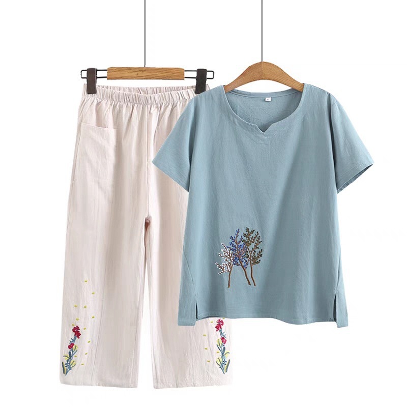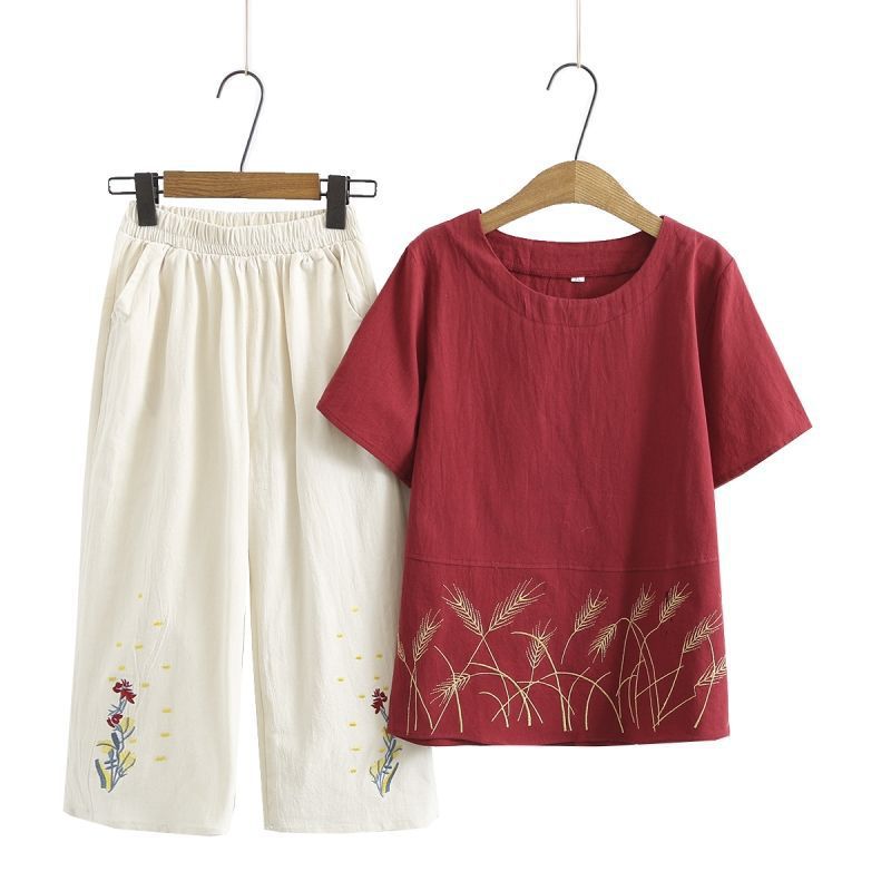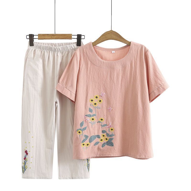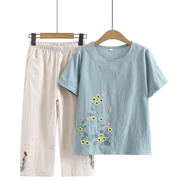 妈妈夏装棉麻套装短袖宽松显瘦中老年人T恤两件套女奶奶夏季上衣