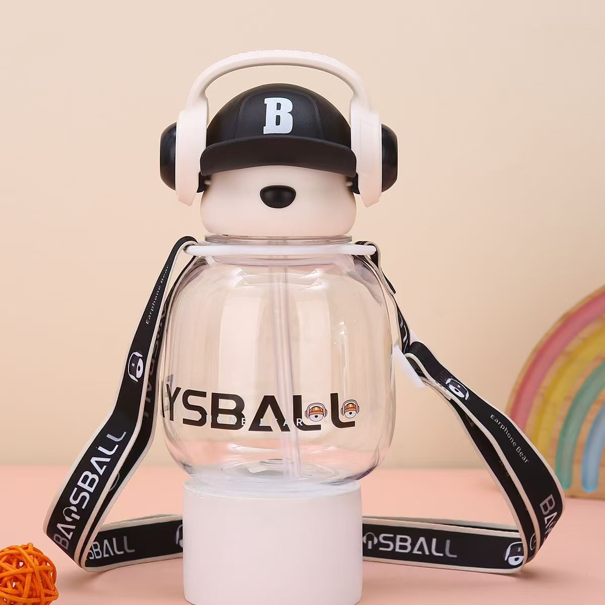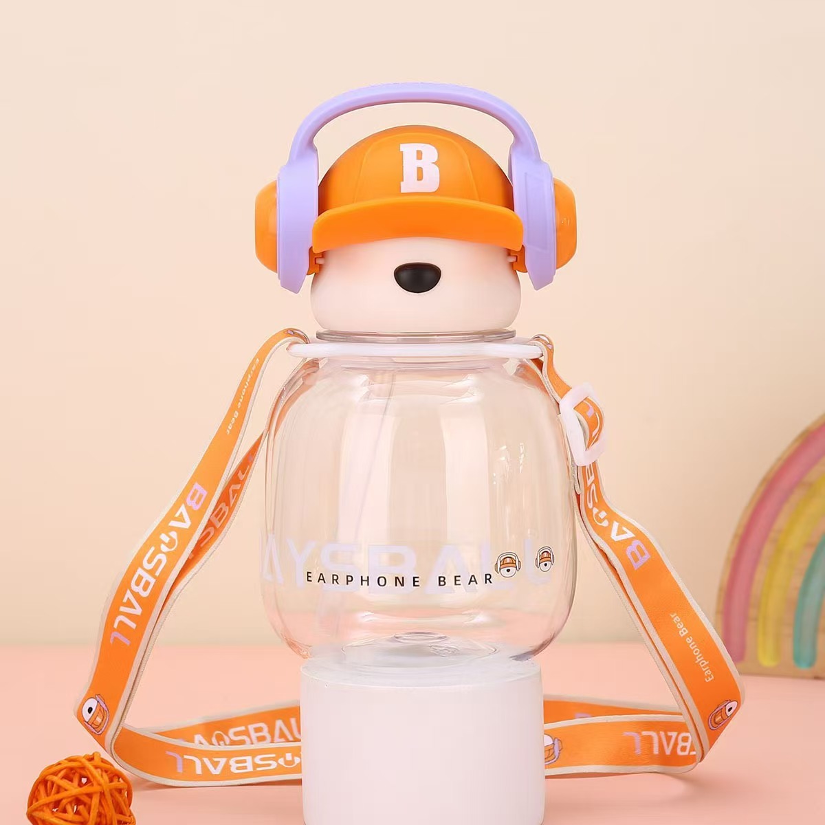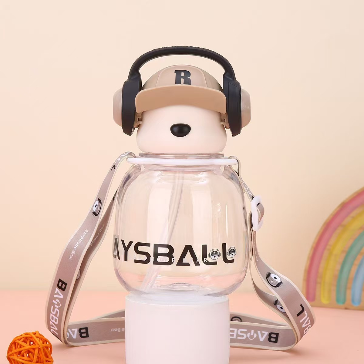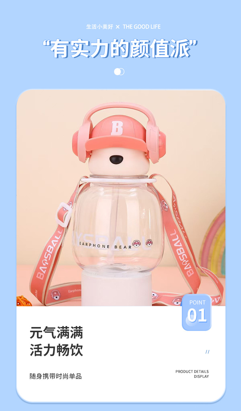2025新款卡通耳机熊塑料杯磨砂家用吸管水杯高颜值吊带杯礼品杯工