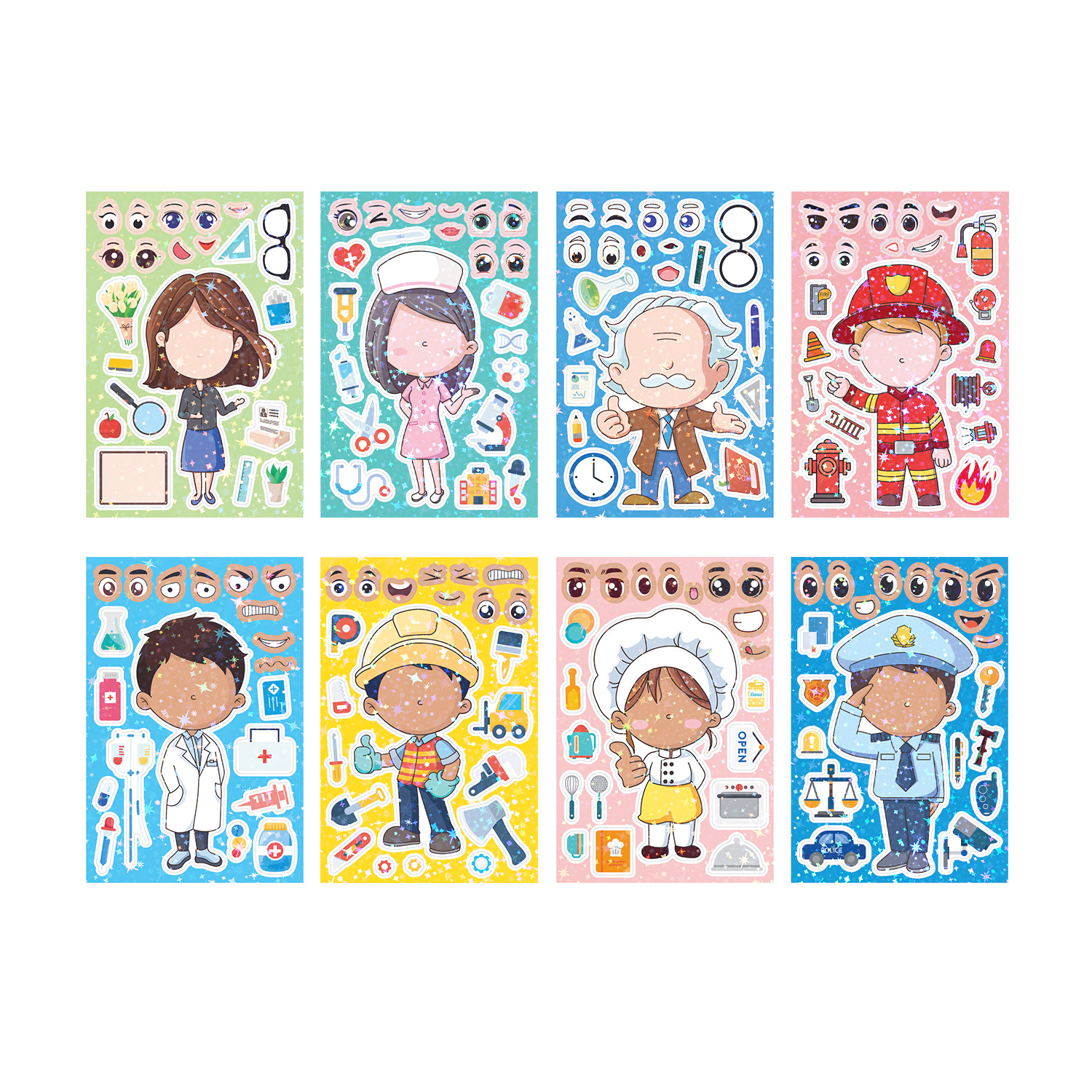 想给你的孩子一个惊喜吗? 换脸贴纸是一款理想的贴纸,它将帮助您的孩子开发他们的创造力和手握能力,您的孩子一定会喜欢它。在聚会或教室与亲戚朋友一起DIY,可以加深他们的友谊,可以作为很好的派对礼物。 它也是其他活动的选择,如公路旅行、汽车旅行或乘坐飞机,以避免焦躁不安。
