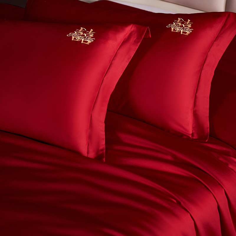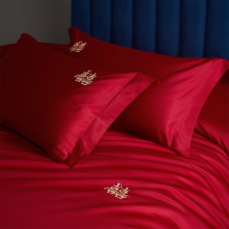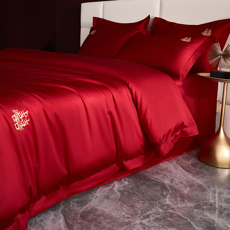 礼盒装高端100支贡缎婚庆四件套简约大红色结婚婚礼床上用品工厂
