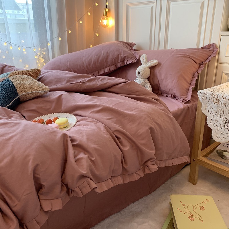 美式复古红色婚庆用品四件套简约纯色花边被套床单宿舍床上三件套