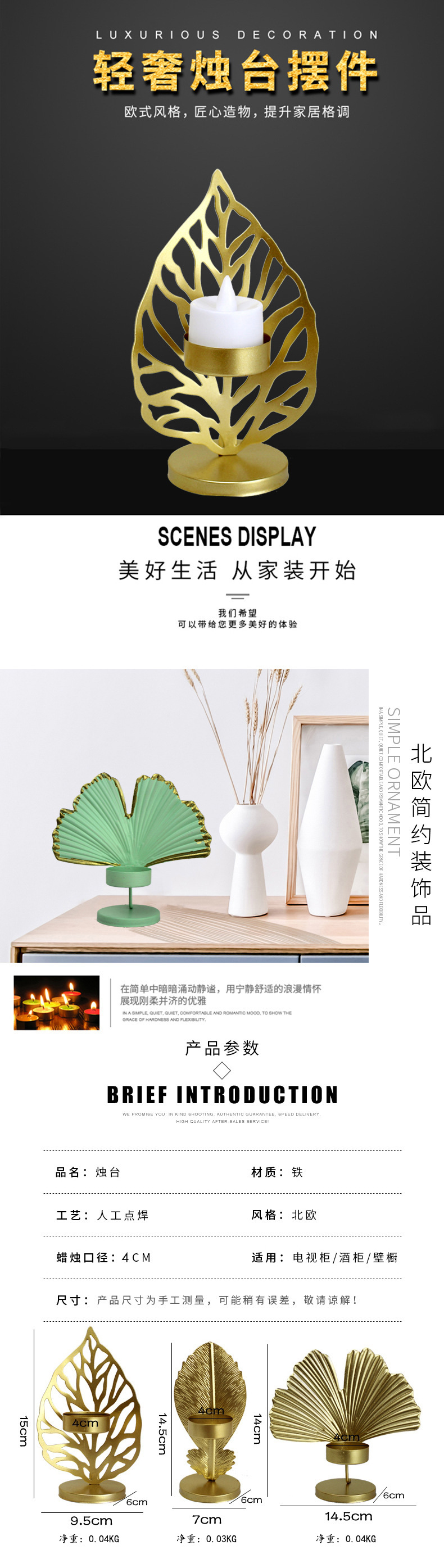 厂家北欧铁艺烛台金色底座客厅桌面装饰简约创意金色叶片工艺品
