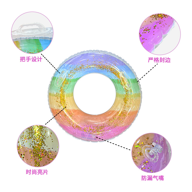 夏季户外水上卡通亮片七彩女成年人游泳圈带把手加厚pvc充气浮圈
