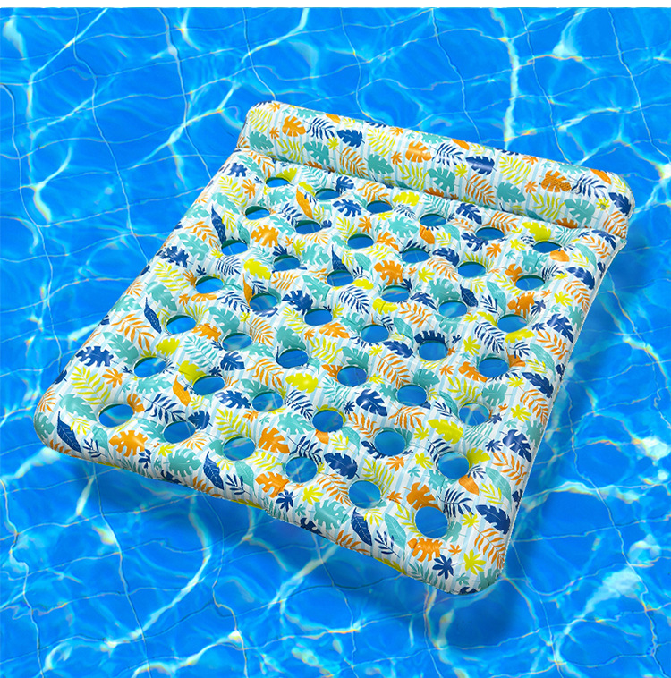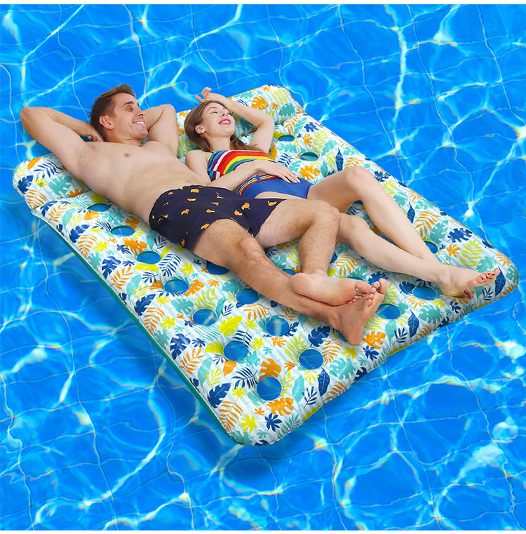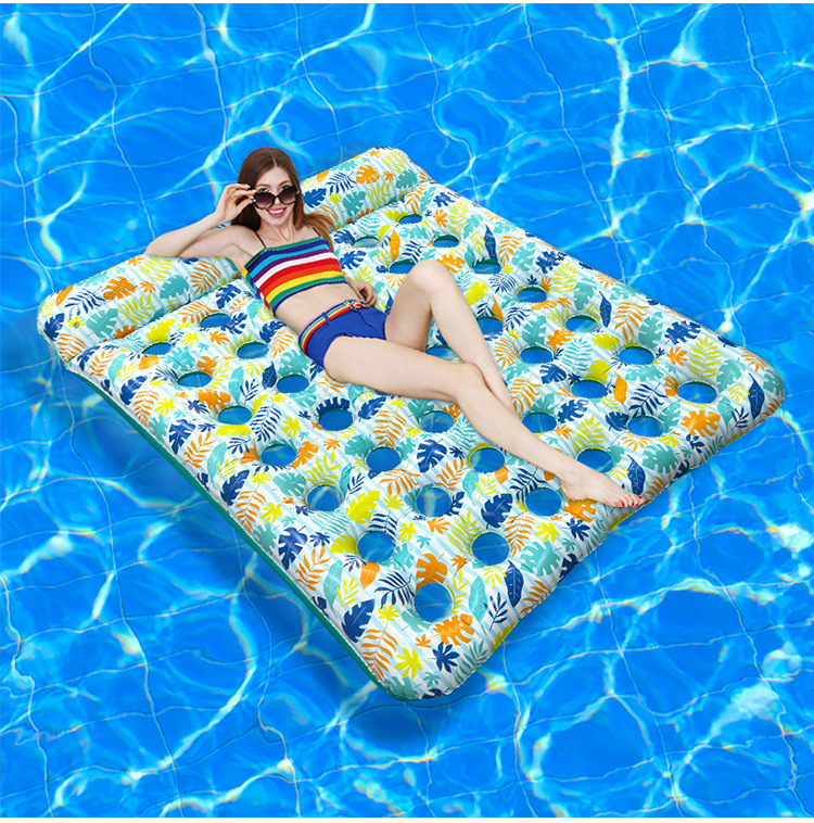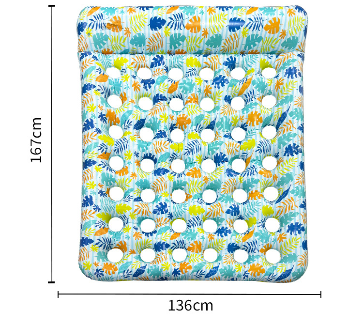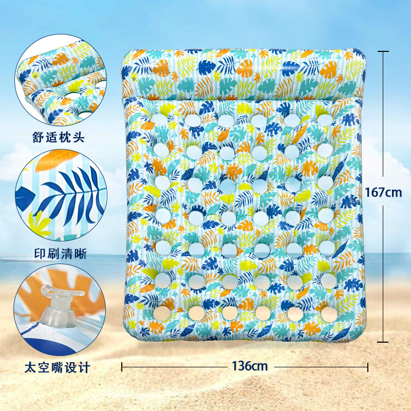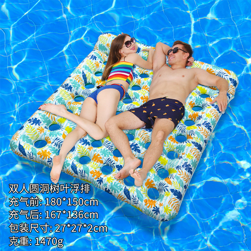 跨境夏季戏水圆孔树叶水上充气漂浮床带靠枕环保加厚PVC双人浮排