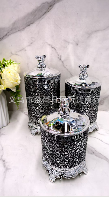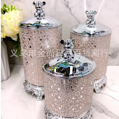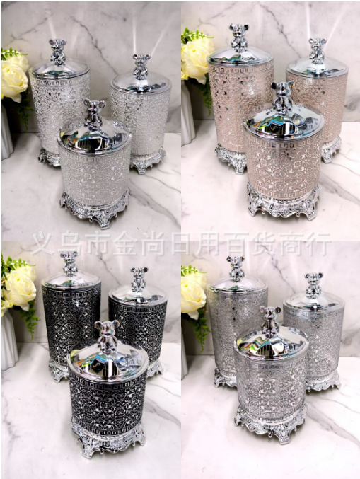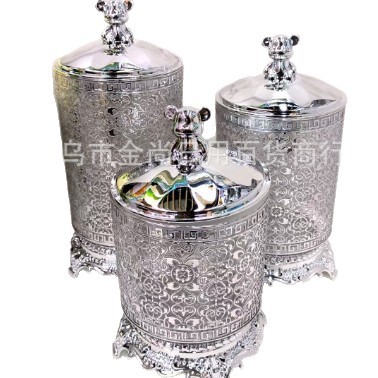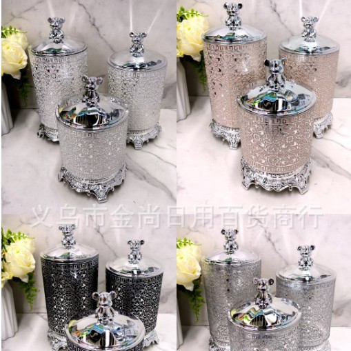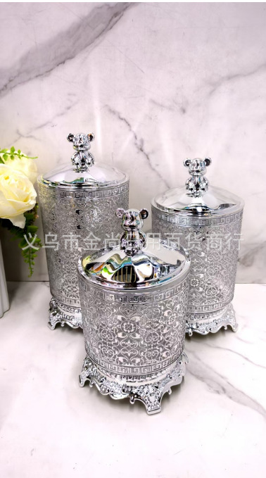 新款家用收纳盒银色熊盖烫银圈心花款托台圆型彩盒