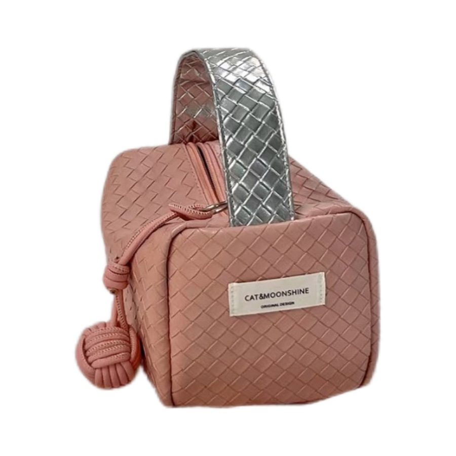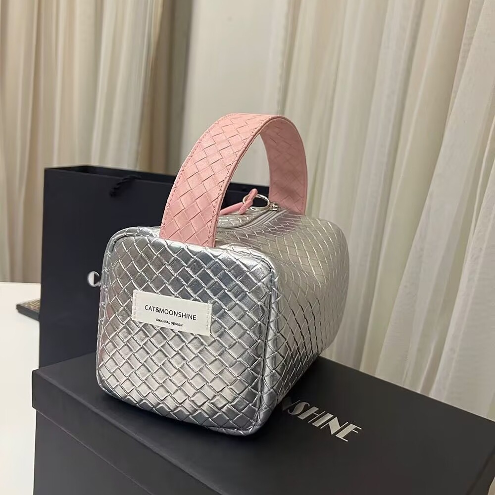 原创银粉拼色编织纹2023新款手拎包小包包便携化妆包收纳 包整理