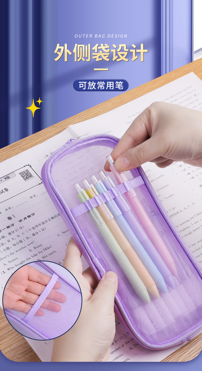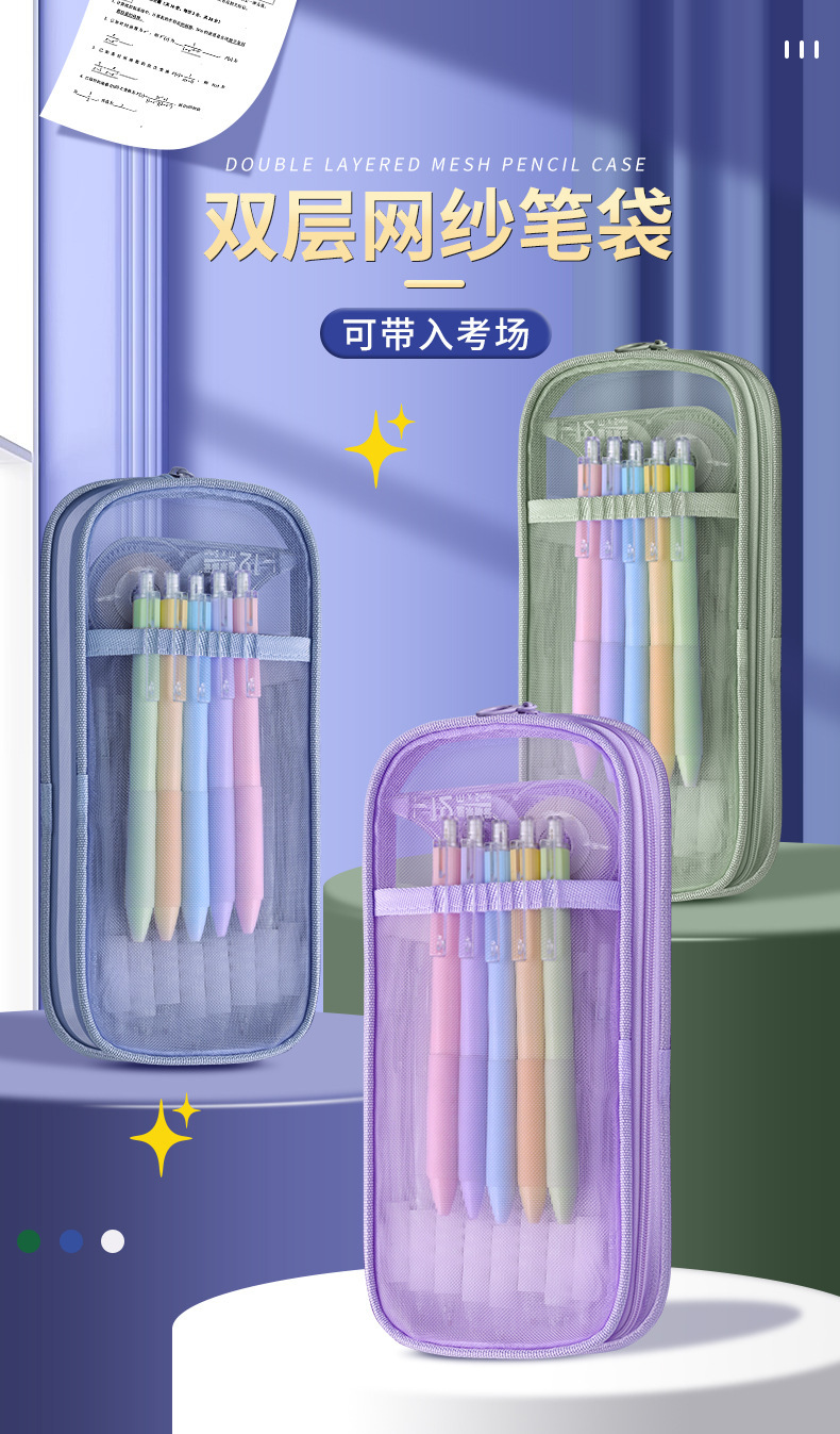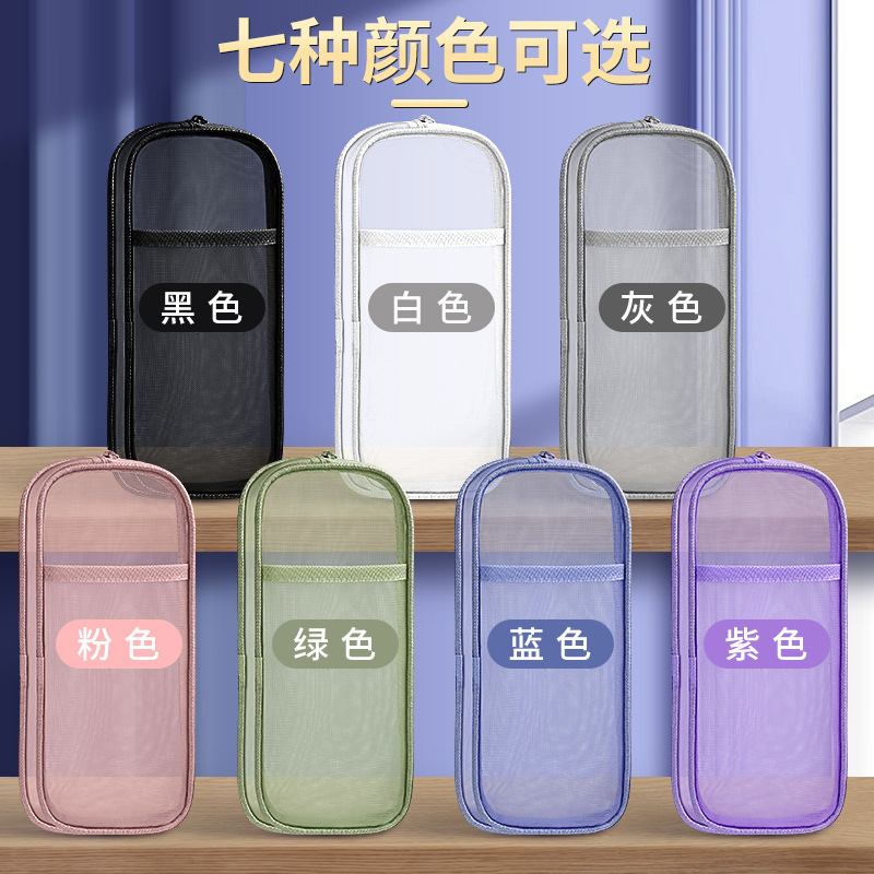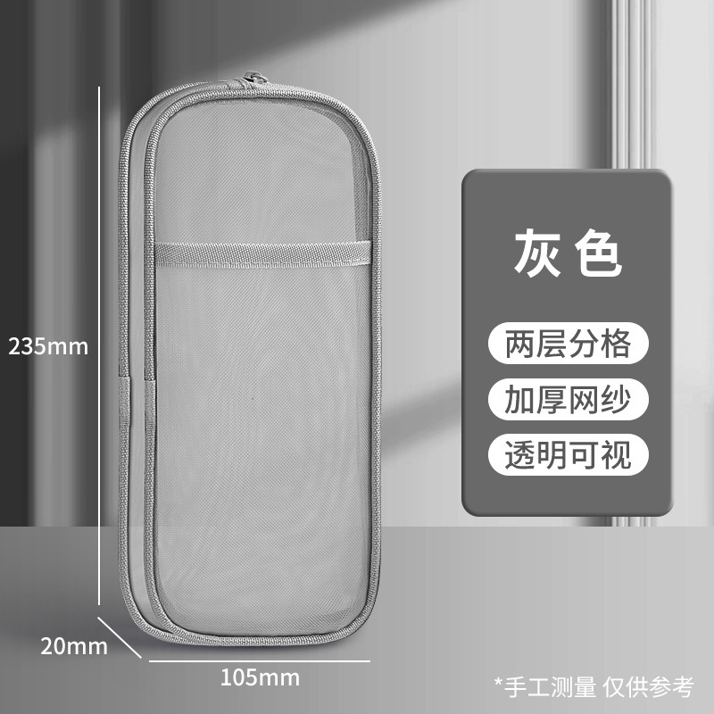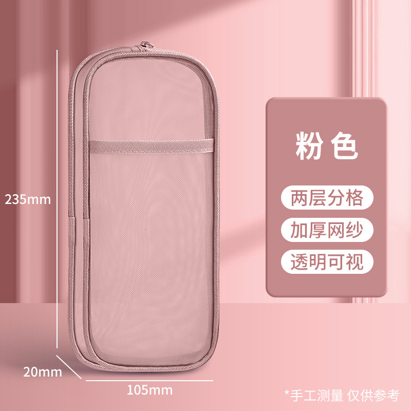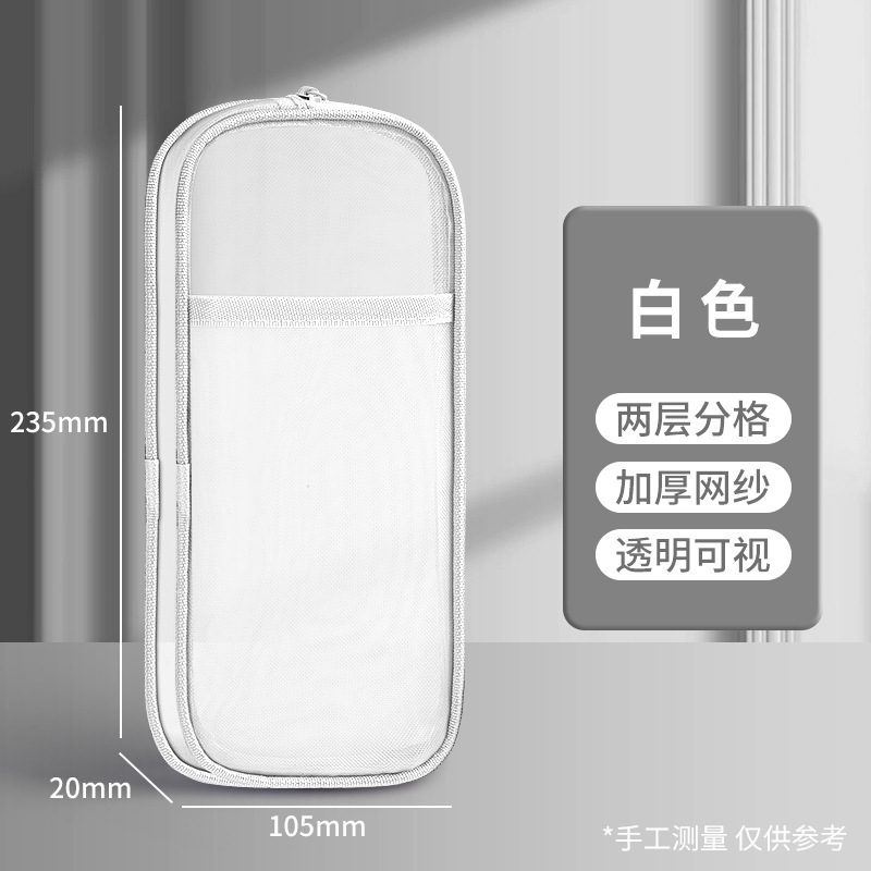 简约双层网纱笔袋学生大容量文具袋透明铅笔袋便携式手提收纳袋