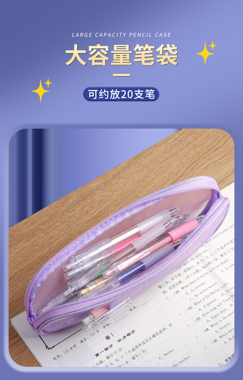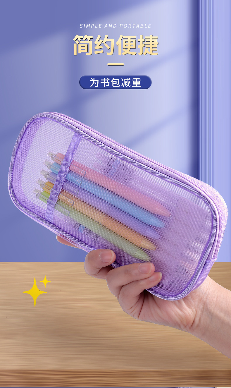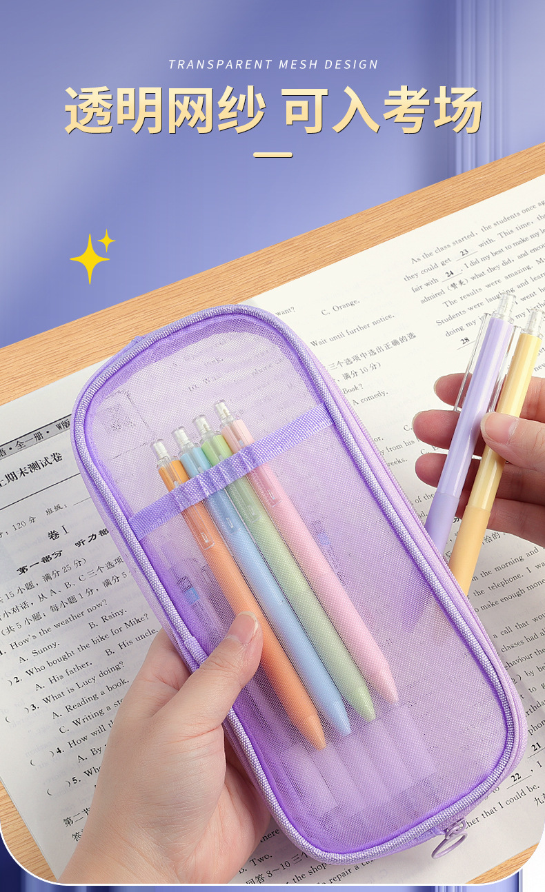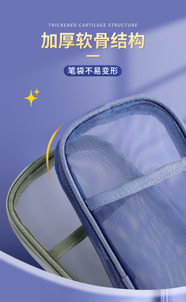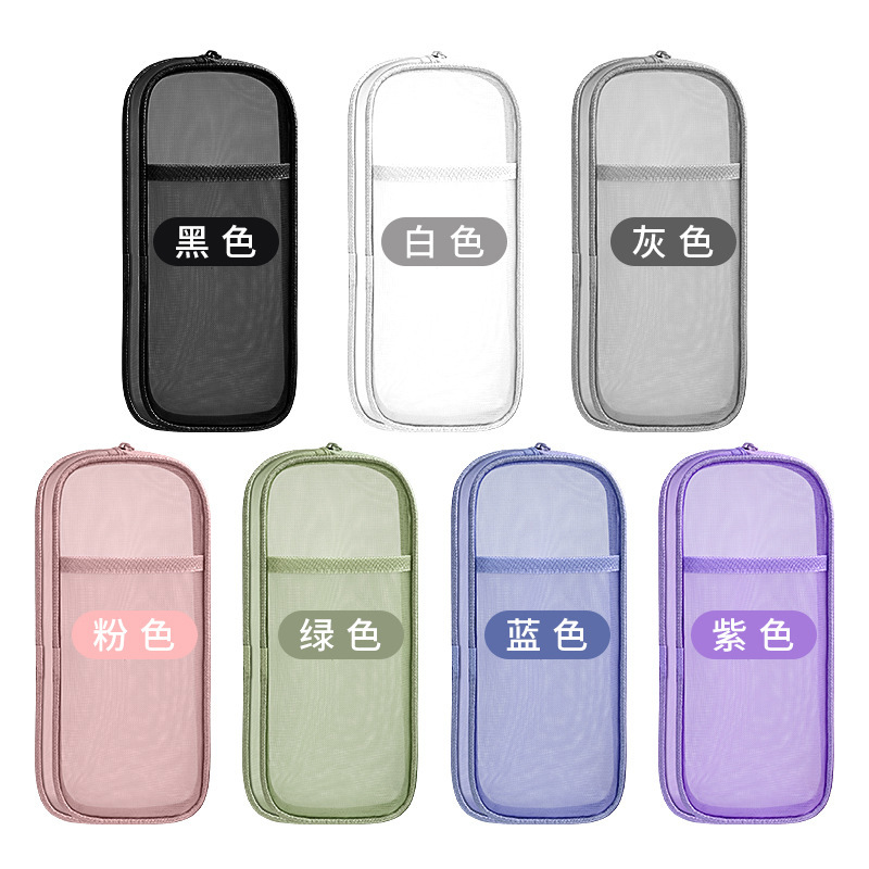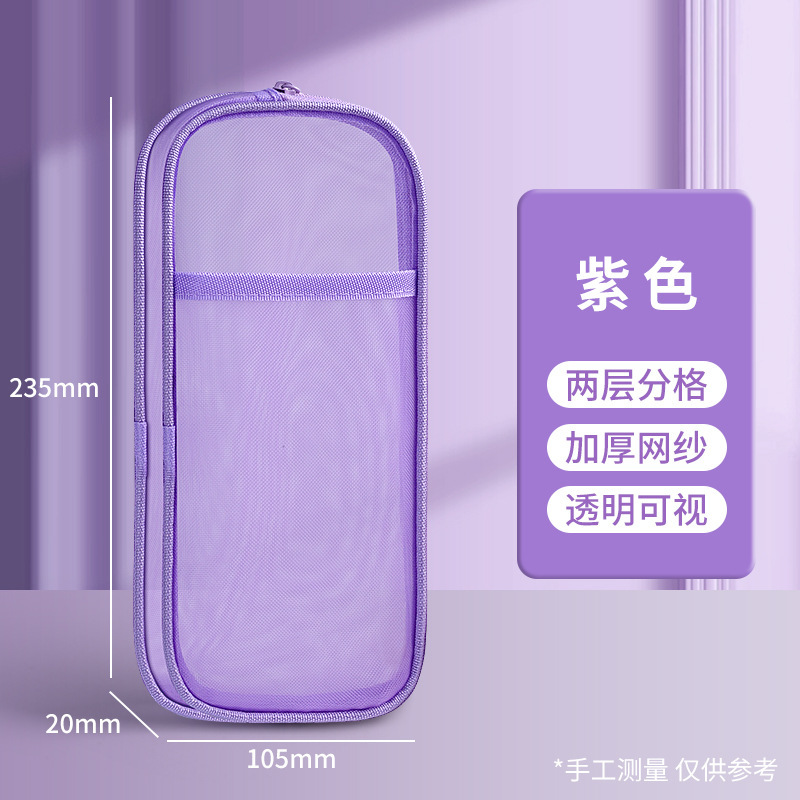 简约双层网纱笔袋学生大容量文具袋透明铅笔袋便携式手提收纳袋