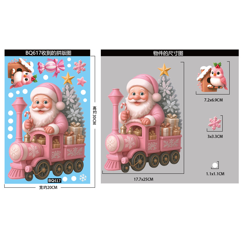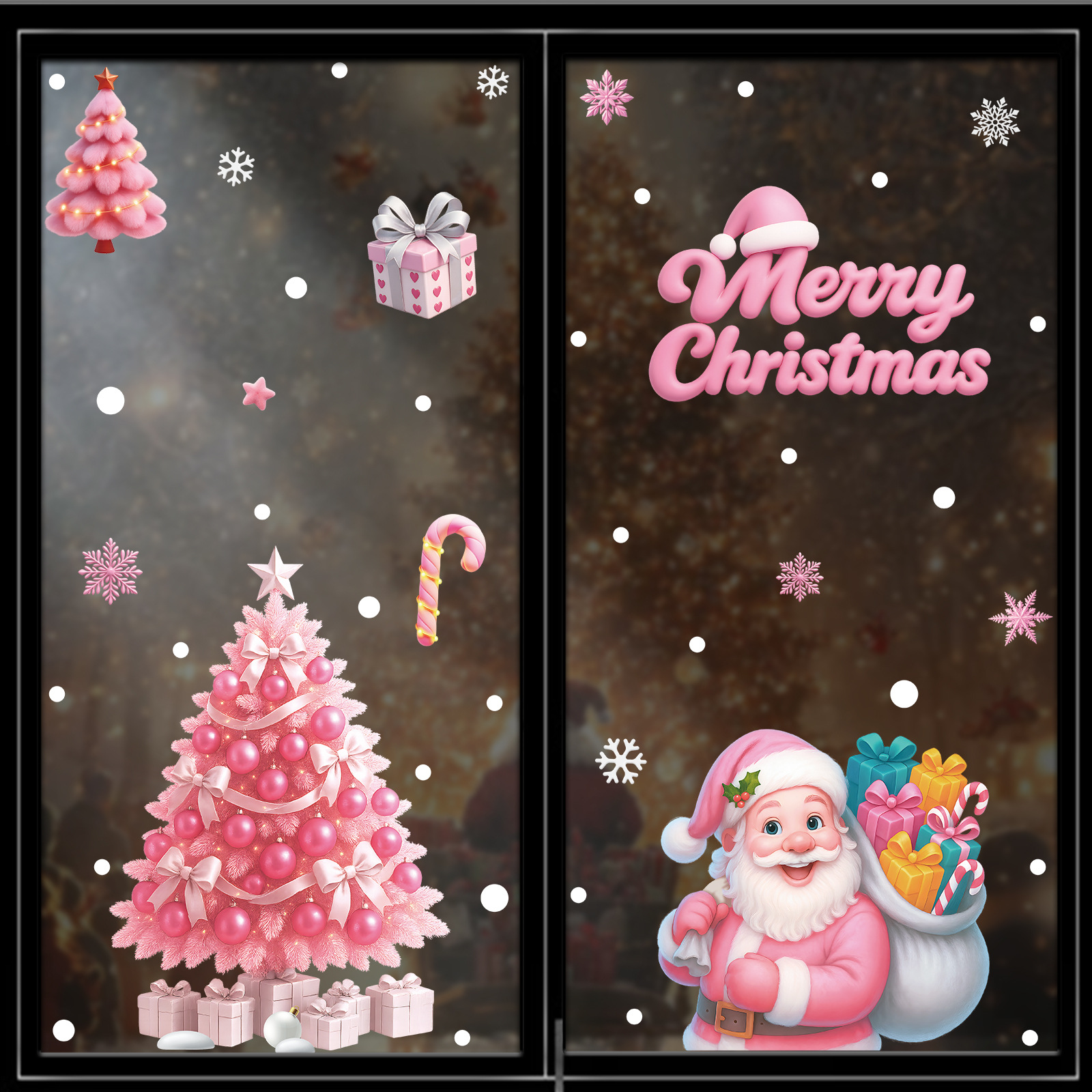 粉色圣诞节装饰玻璃贴纸圣诞树雪人窗贴圣诞贴纸老人鹿雪花静电贴