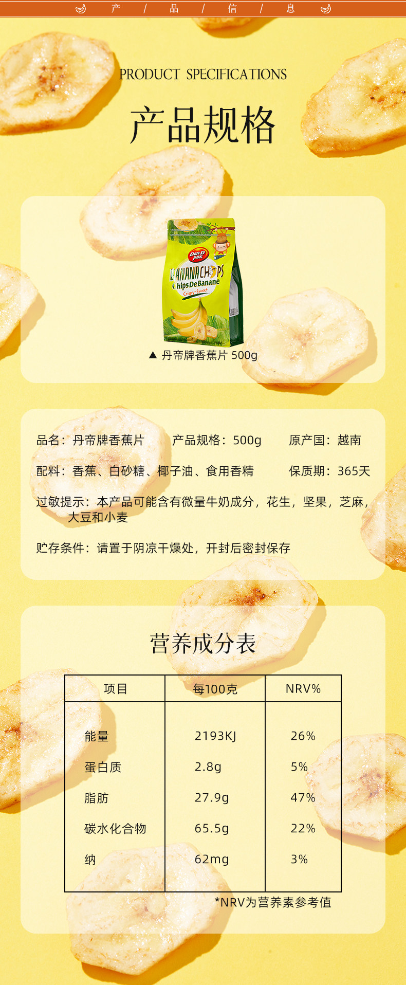 丹帝进口甜脆香蕉片脱水果香蕉干脆片芭蕉干果蜜饯零食500g
