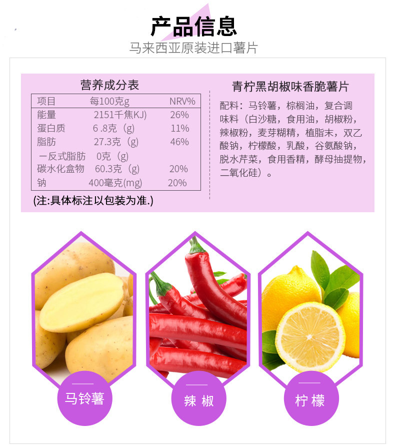 | crispy lime black pepper flavoring crispy potato chips(脆滋青柠黑胡椒味香脆薯片) | USD $3.71 | 0 piece available |