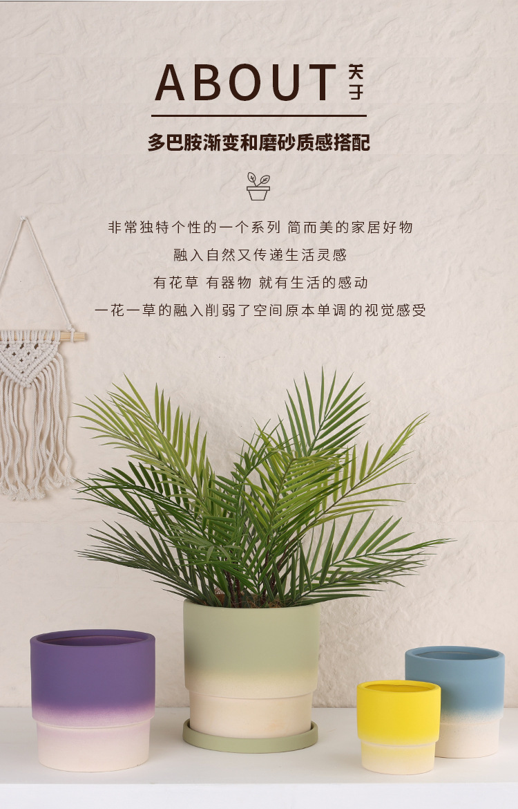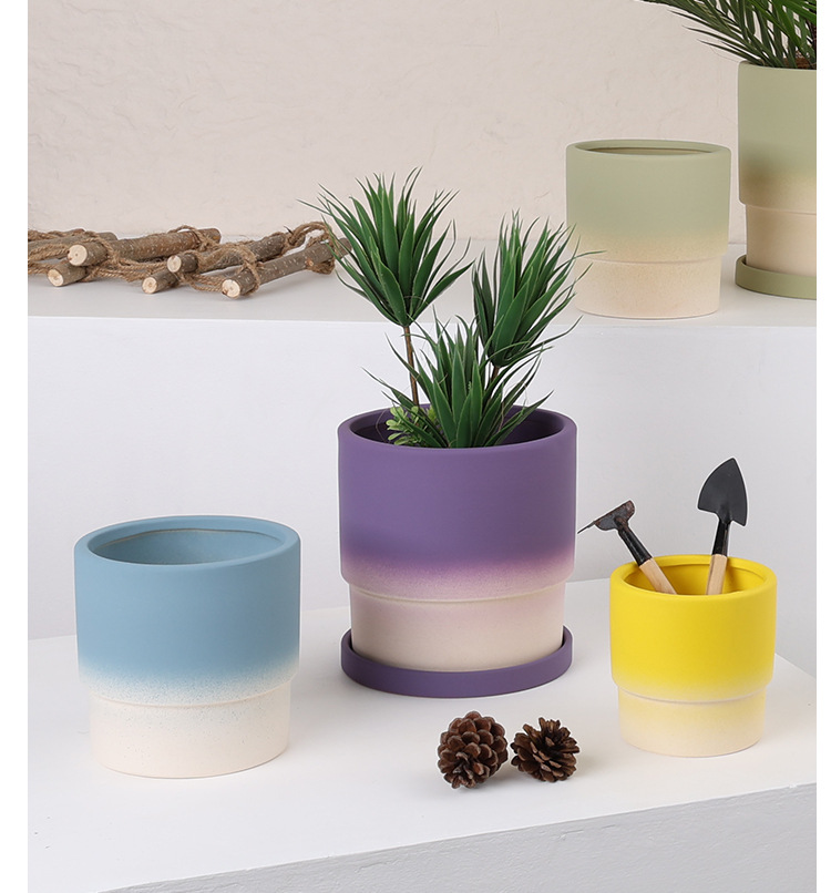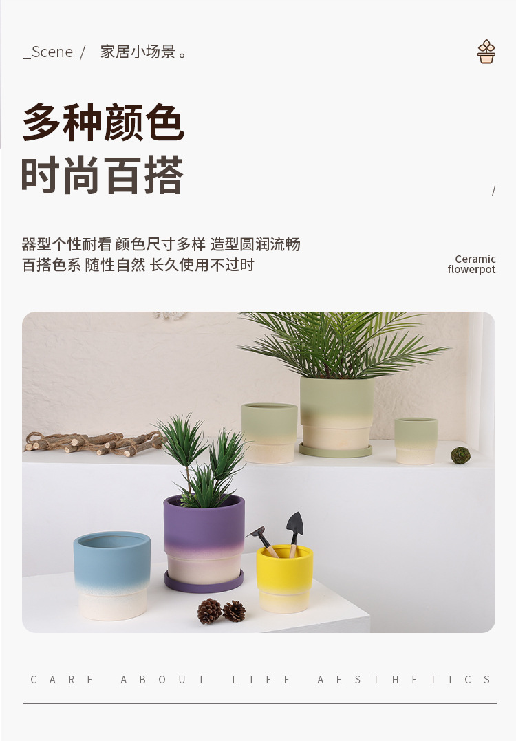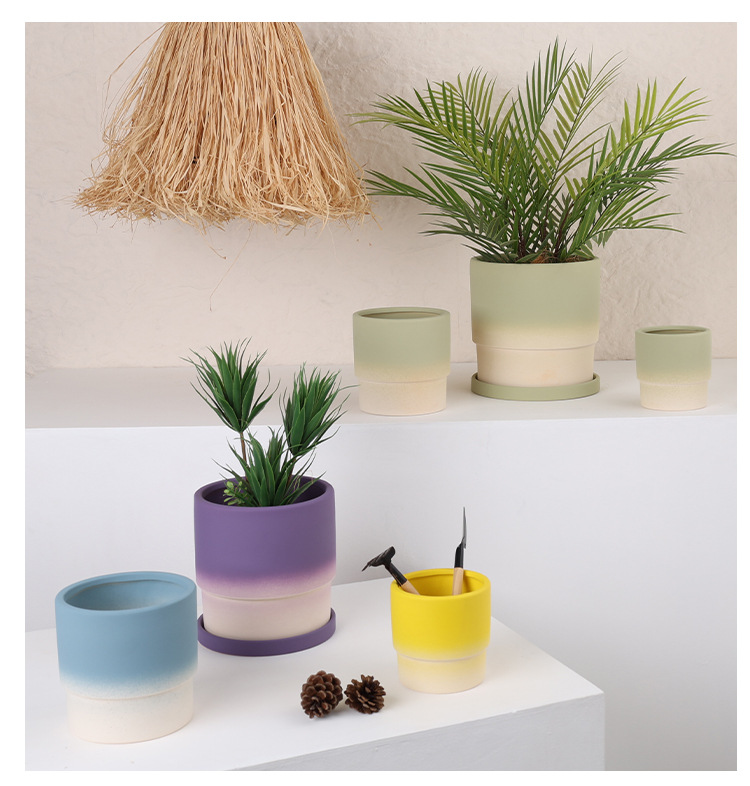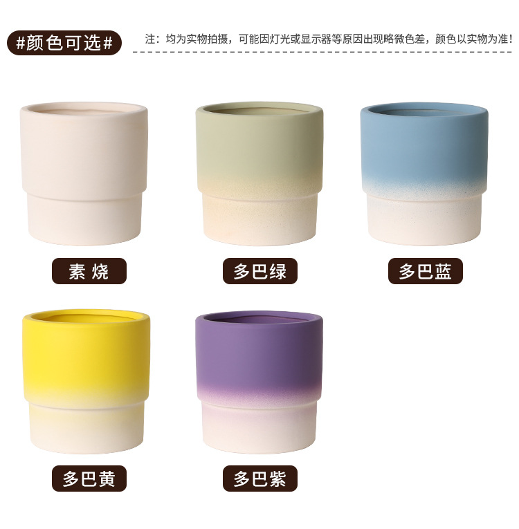 北欧渐变多巴胺圆形陶瓷花盆透气陶土家用带托盘有孔多肉盆栽绿植
