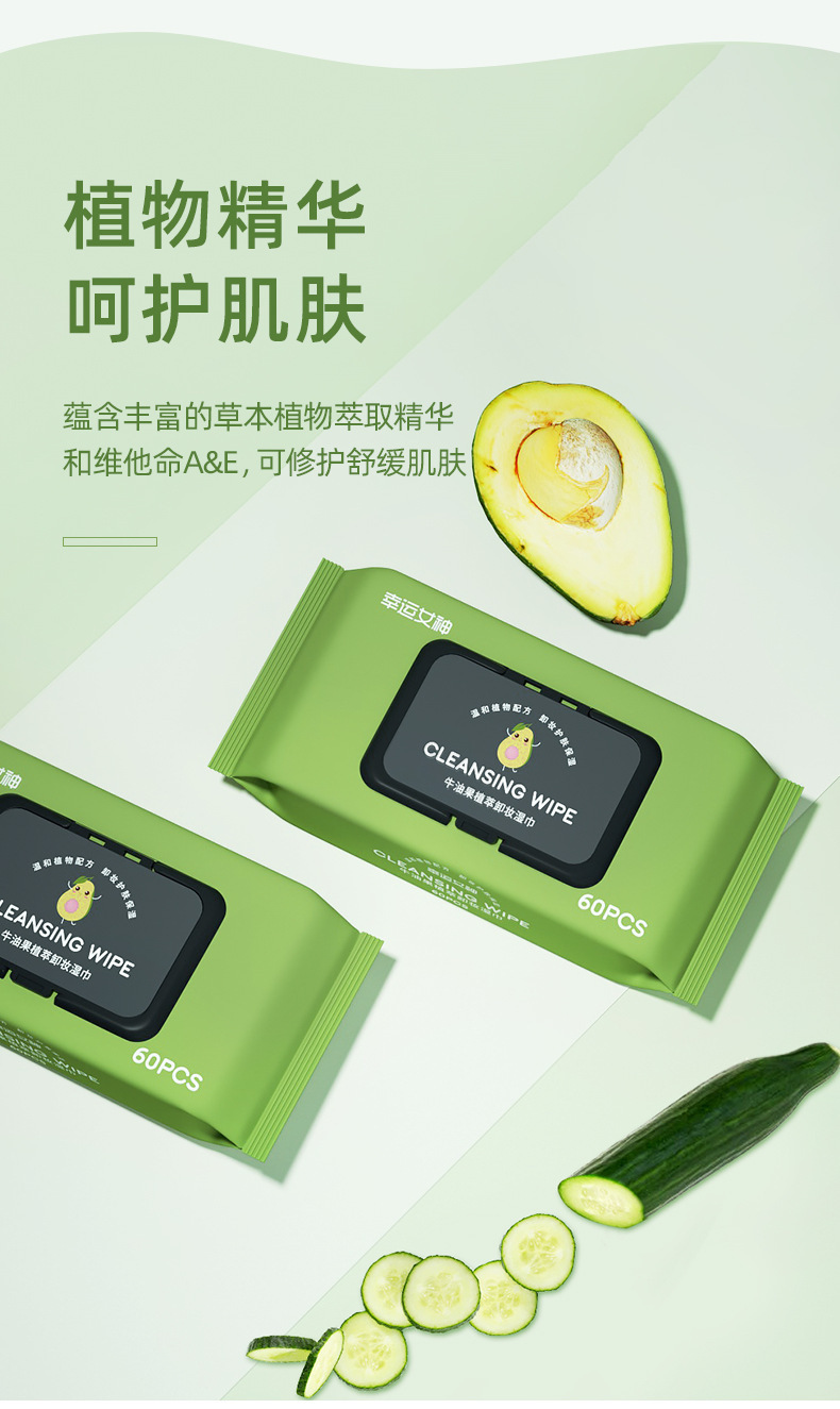 60片牛油果卸妆湿巾一次性面部温和清洁免洗卸妆巾便携洁面洗脸巾