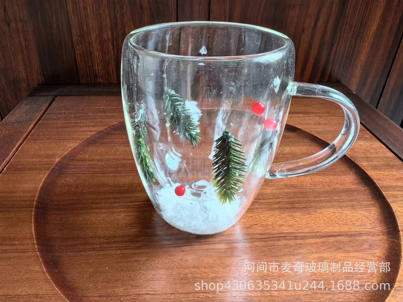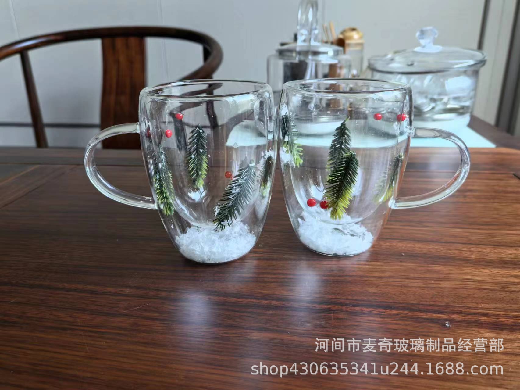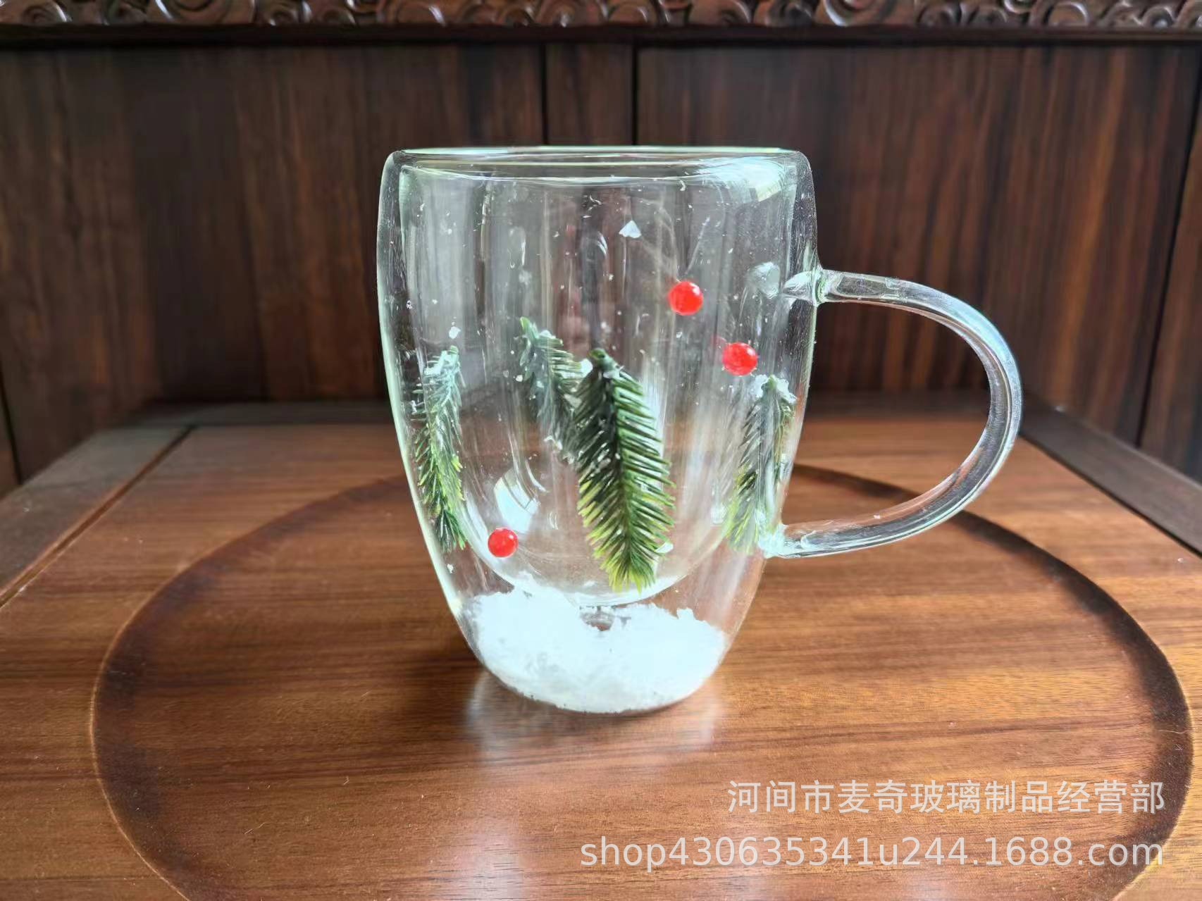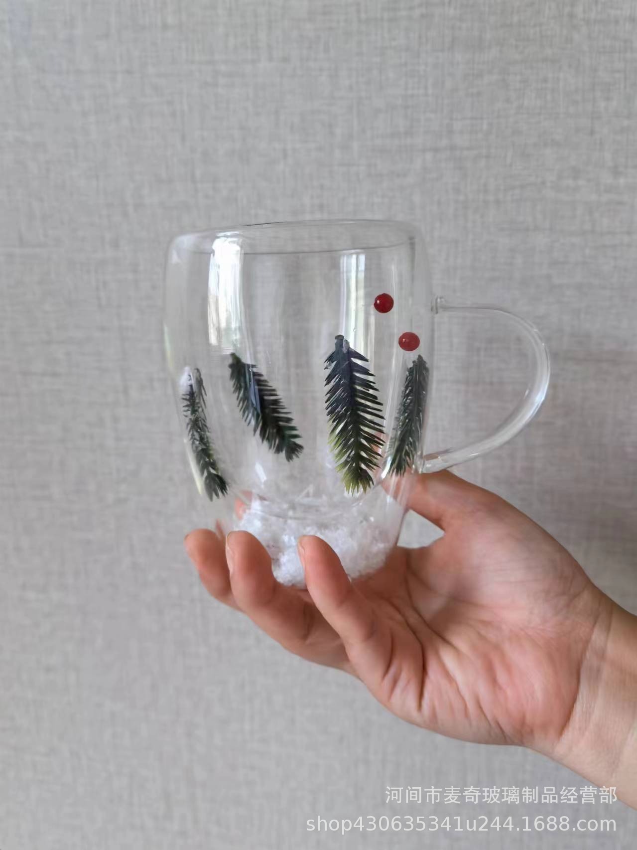 松枝雪花双层玻璃杯跨境可爱节日礼品圣诞雪景松枝杯高硼硅雪景杯