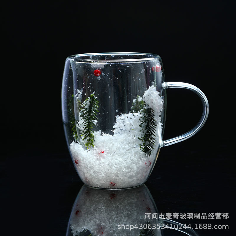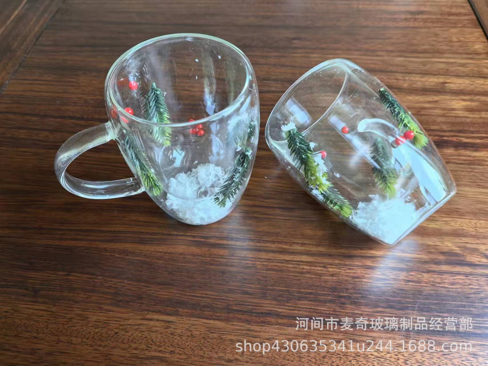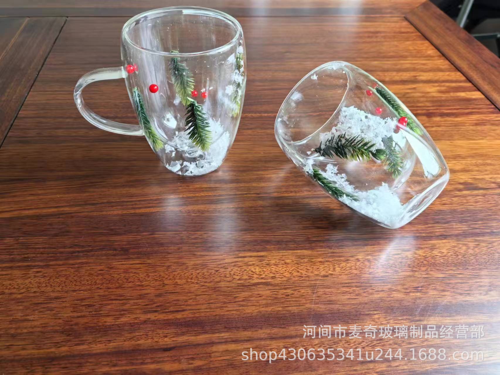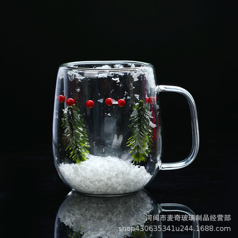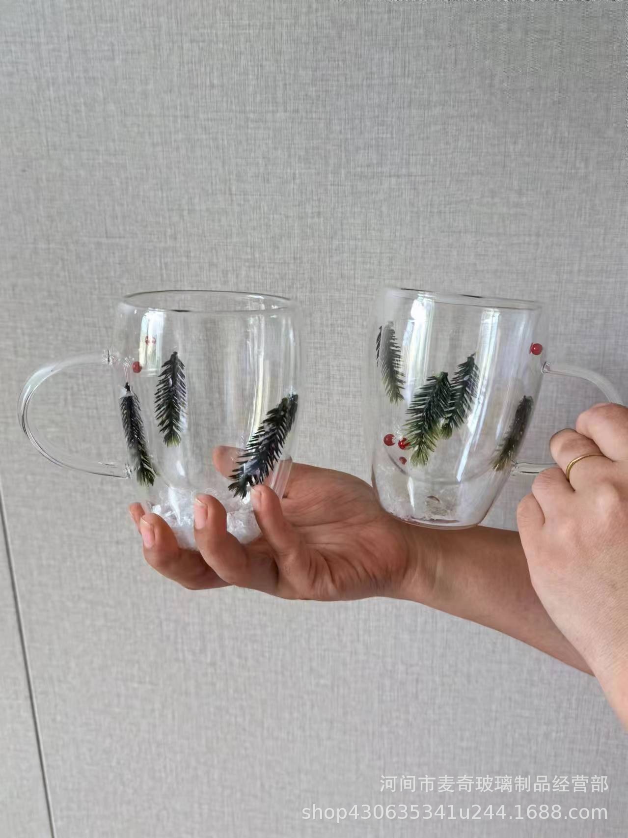 松枝雪花双层玻璃杯跨境可爱节日礼品圣诞雪景松枝杯高硼硅雪景杯