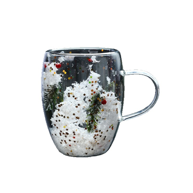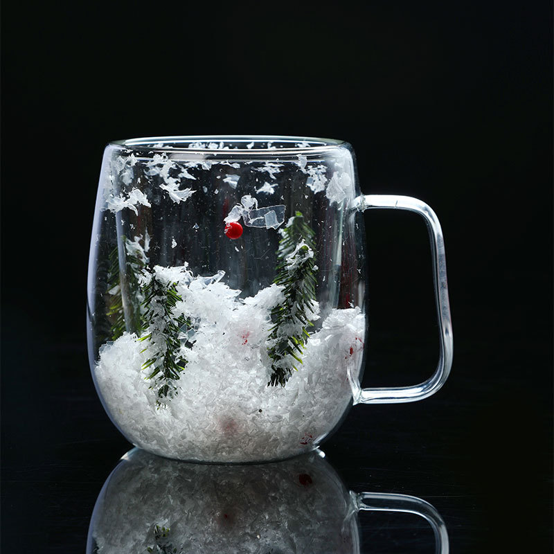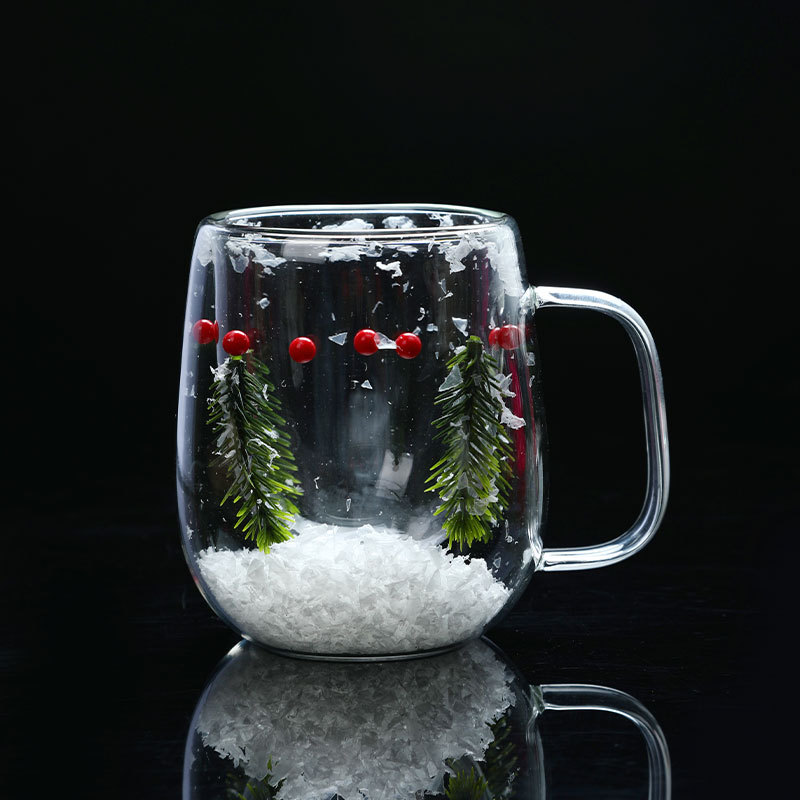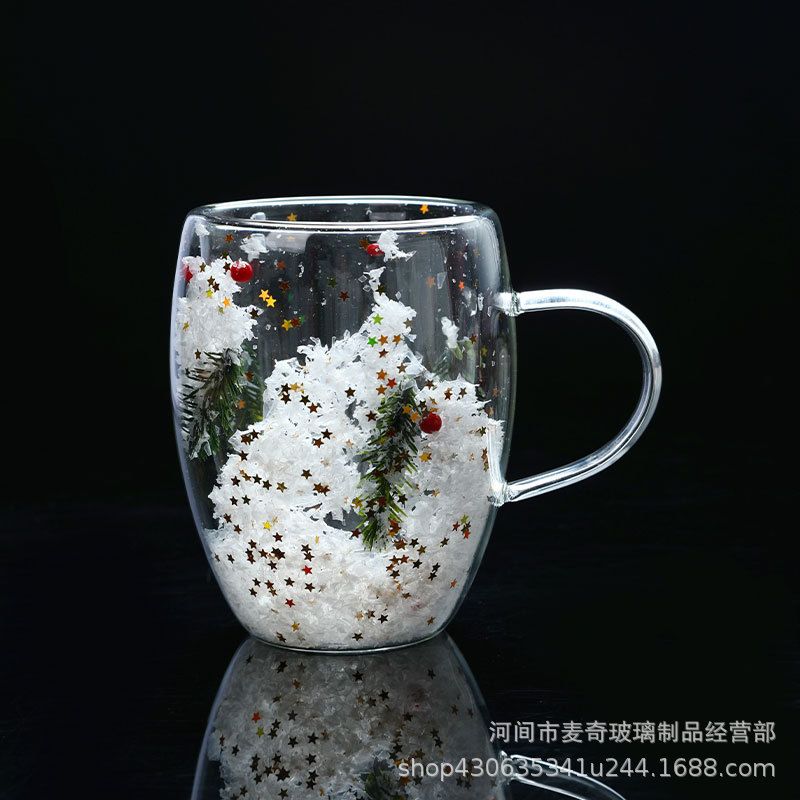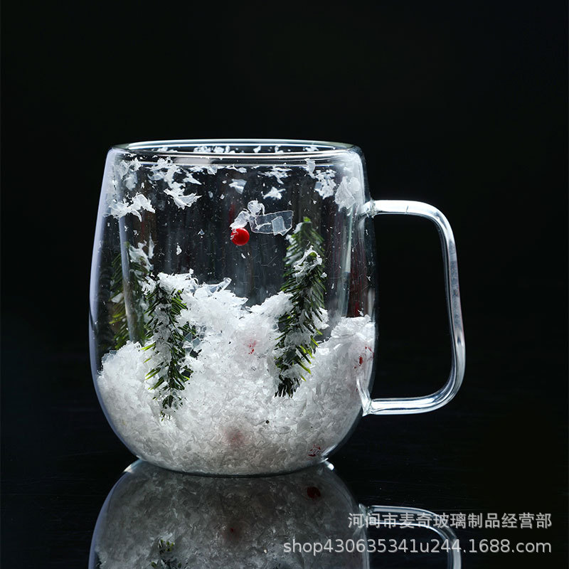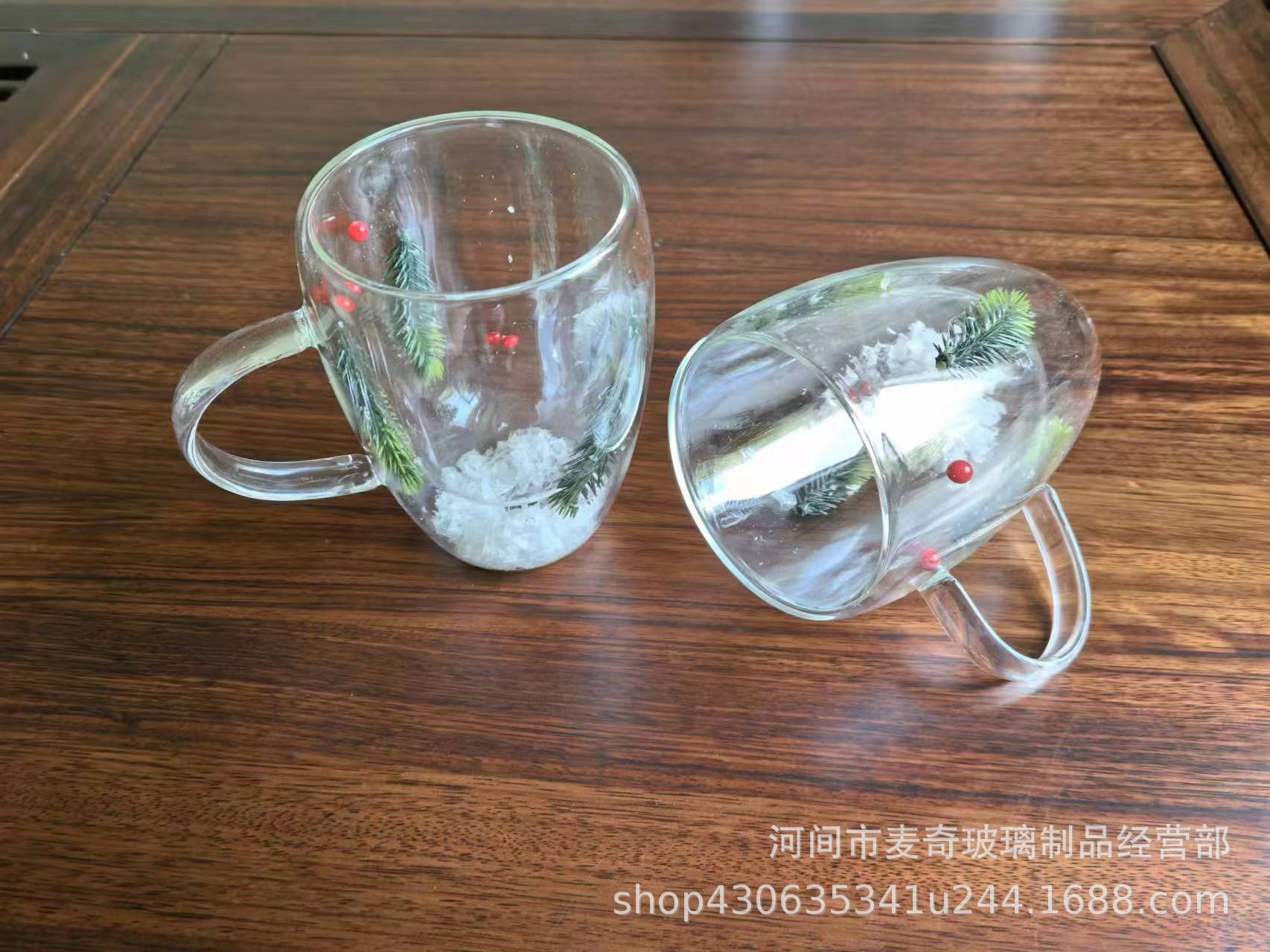 松枝雪花双层玻璃杯跨境可爱节日礼品圣诞雪景松枝杯高硼硅雪景杯