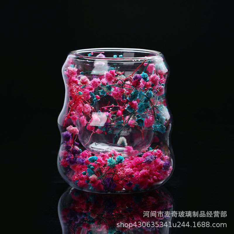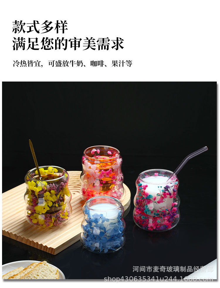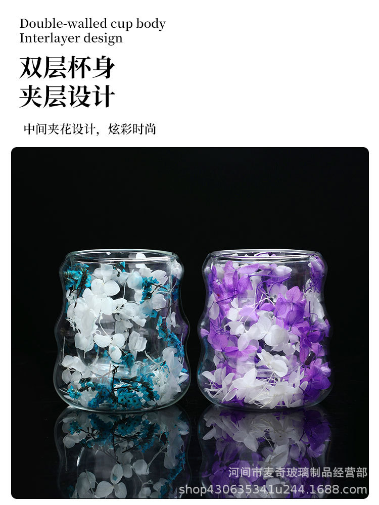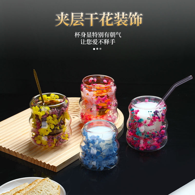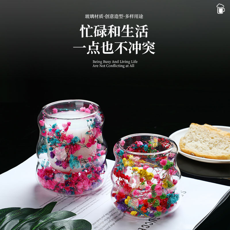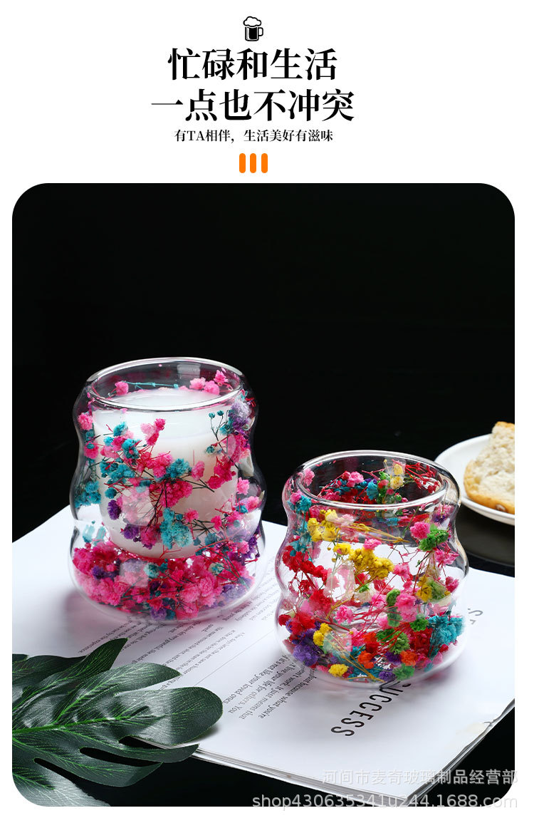 创意干花双层杯高颜值咖啡杯跨境高硼硅玻璃杯夹层干花装饰云朵杯