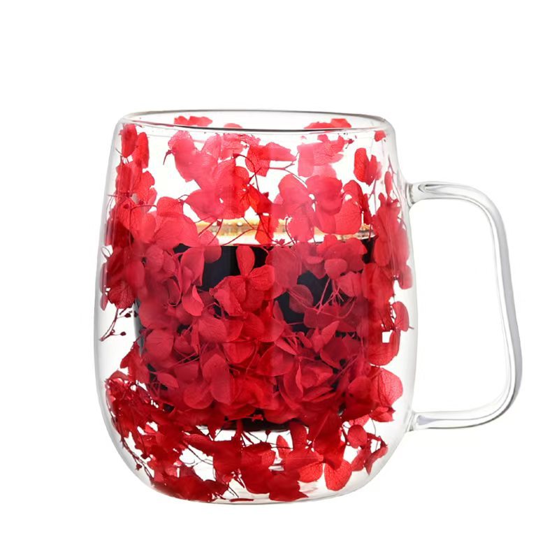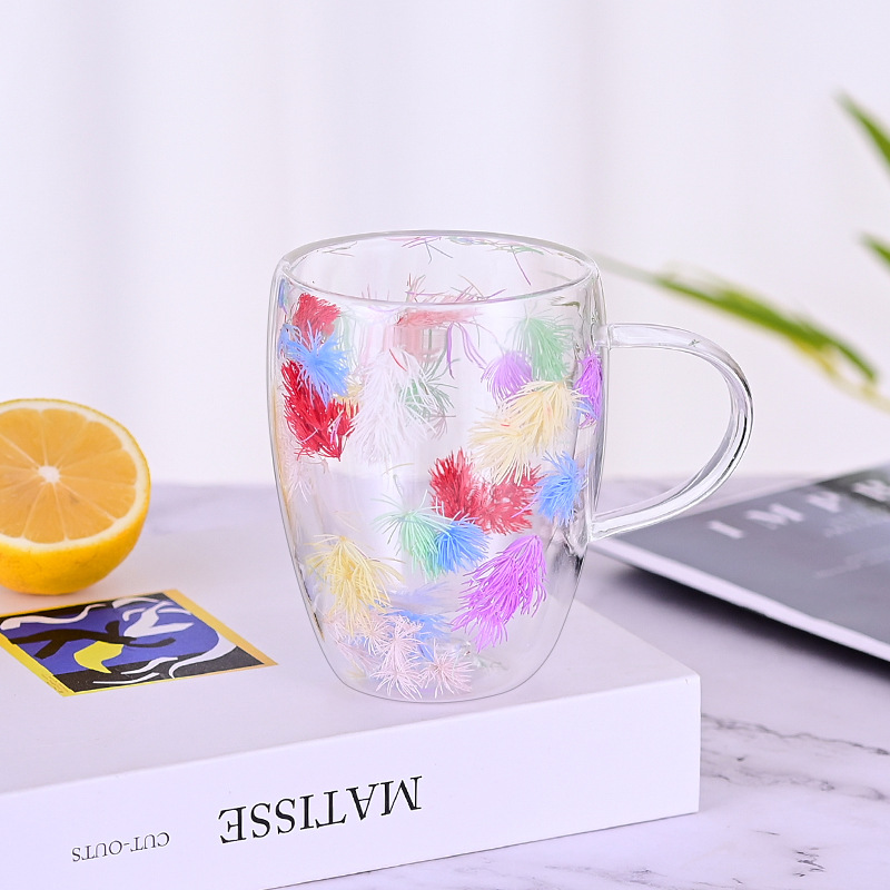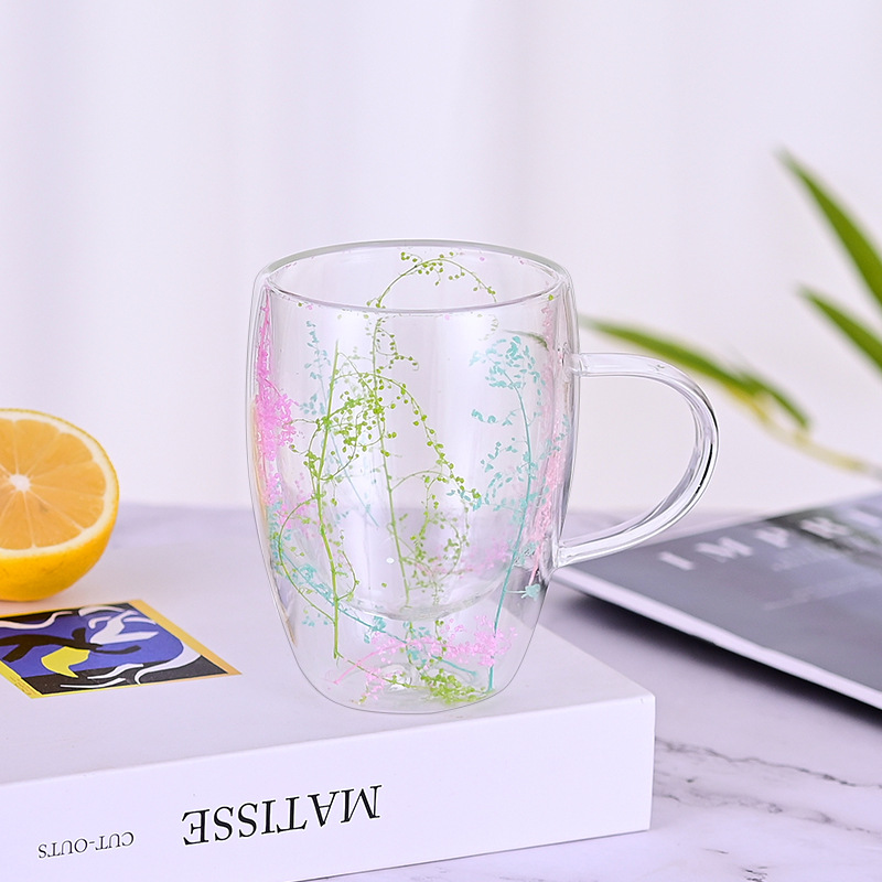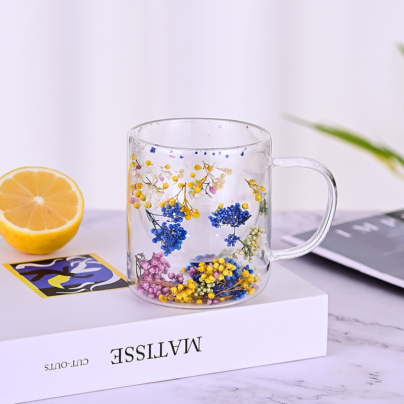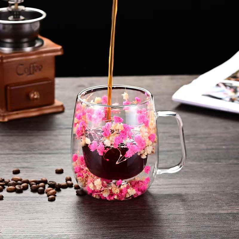 创意风新品网红真花干花双层高硼硅玻璃家用酒吧用马克杯咖啡杯