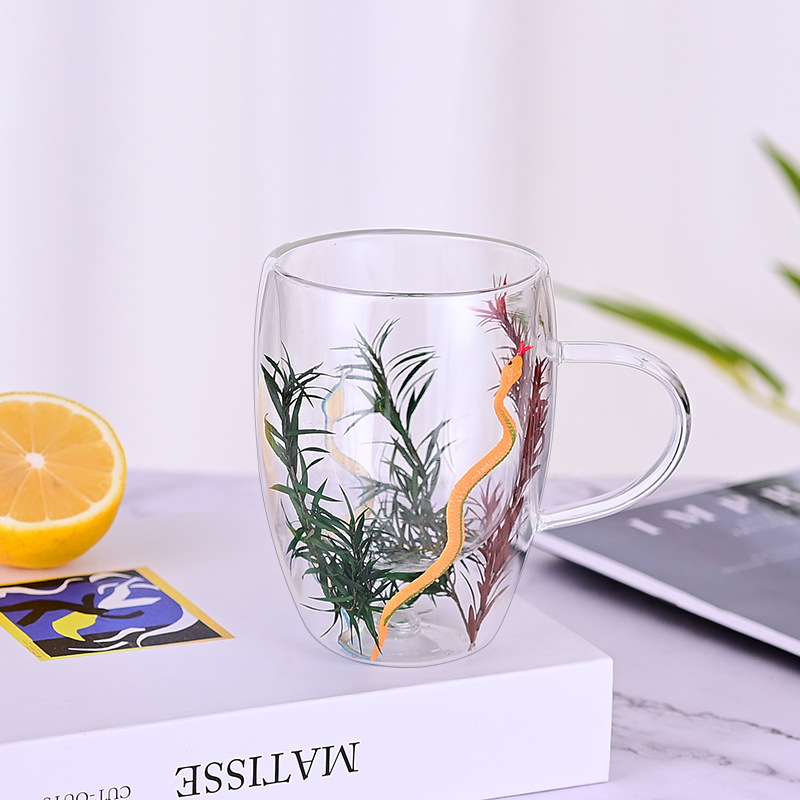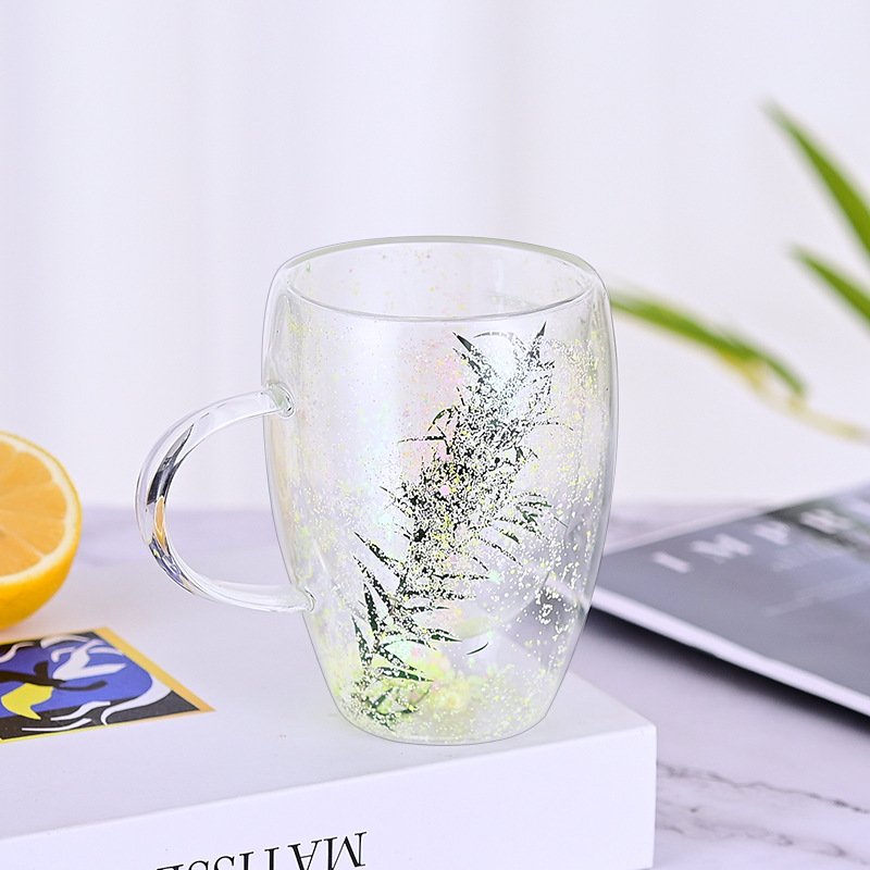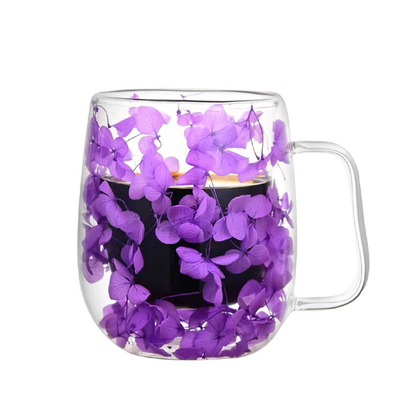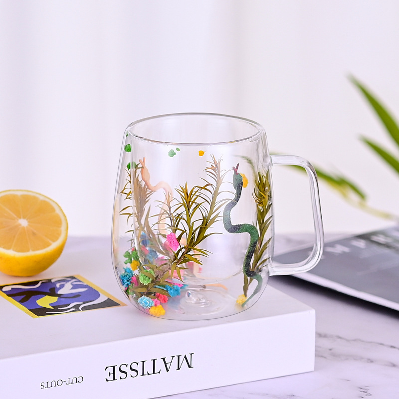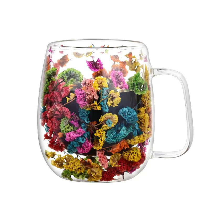创意风新品网红真花干花双层高硼硅玻璃家用酒吧用马克杯咖啡杯
