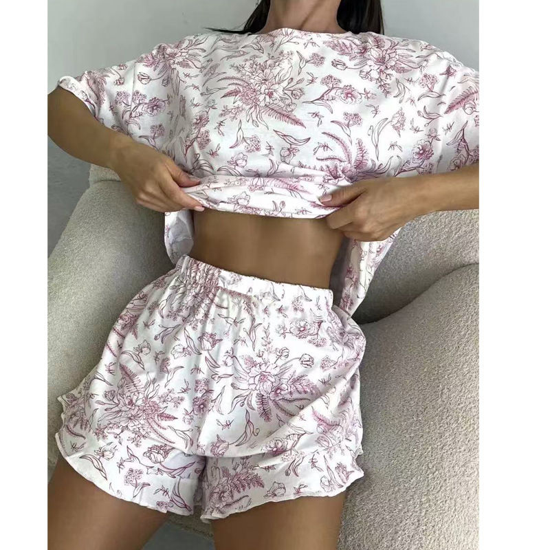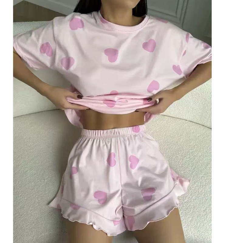 外贸休闲女装跨境家居服爱心印花短袖睡衣短裤两件套宽松舒适套装