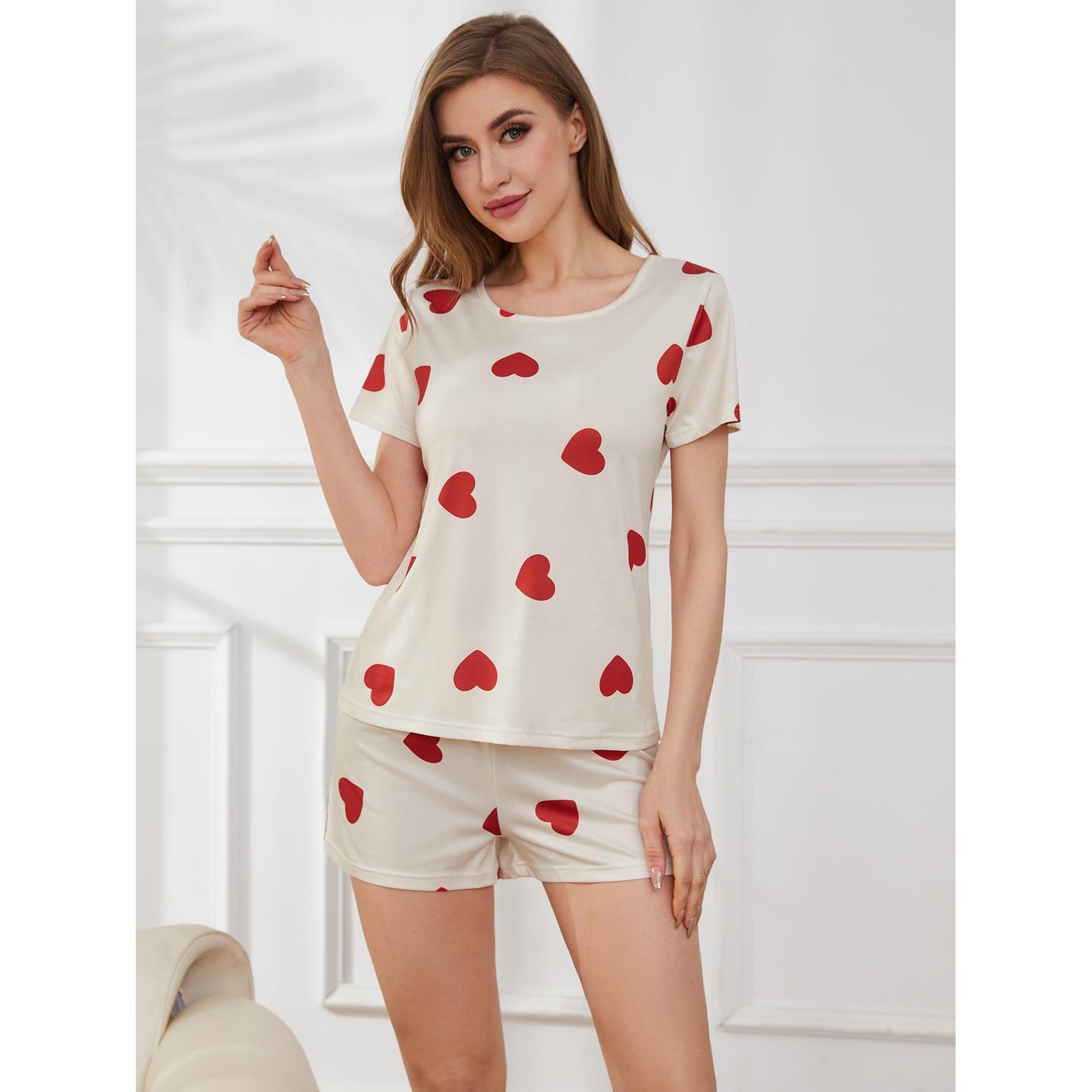 跨境欧美女士家居服夏季薄款爱心短袖短裤两件套睡衣女nightwear