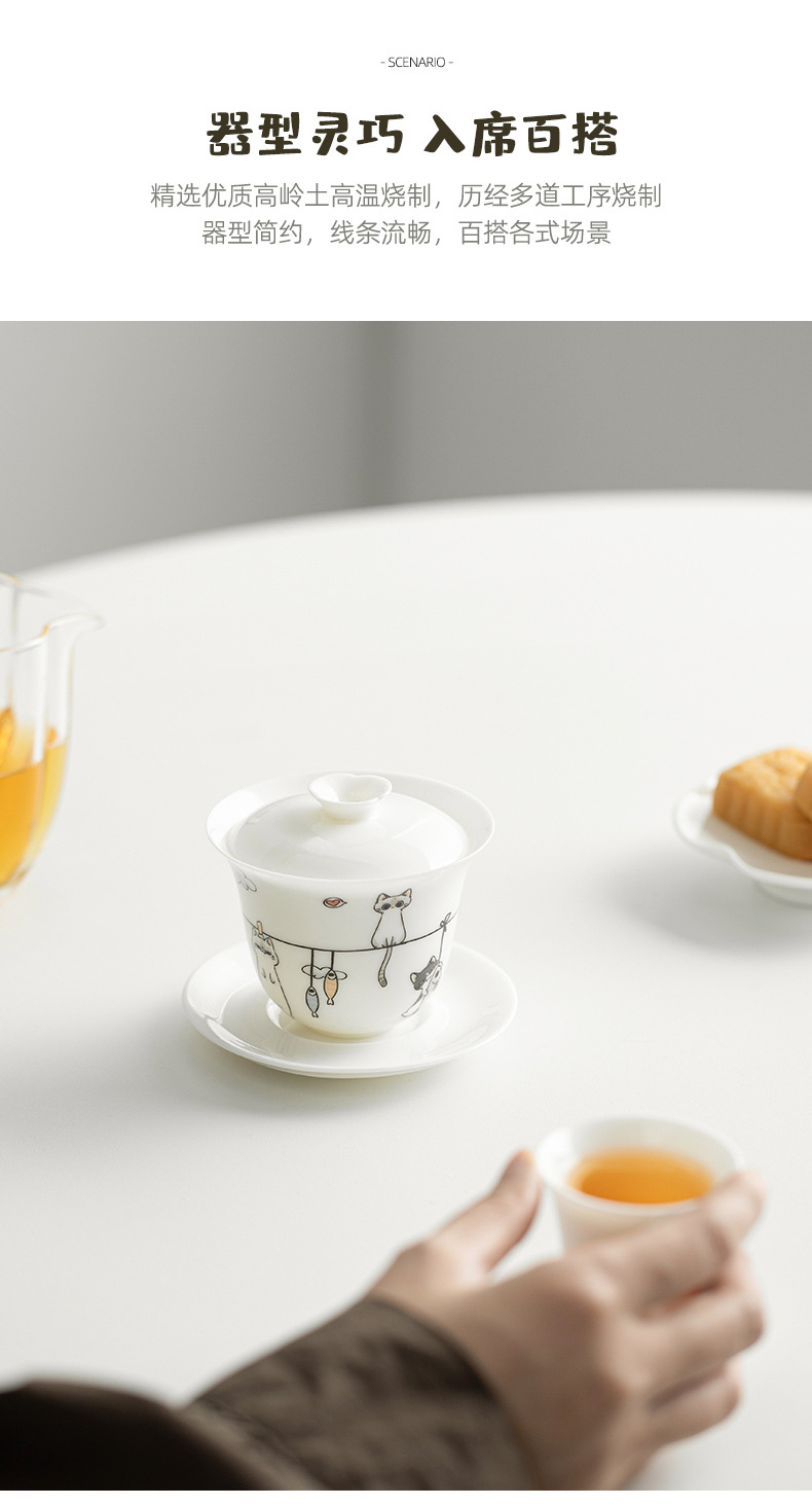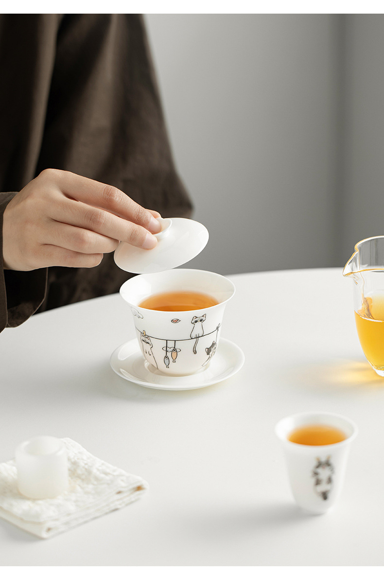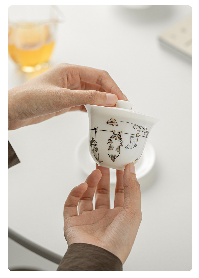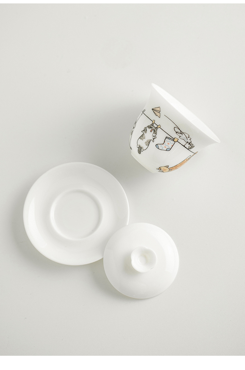 原创晒猫羊脂玉瓷盖碗不烫手可爱盖碗茶功夫碗三才带盖陶瓷定logo
