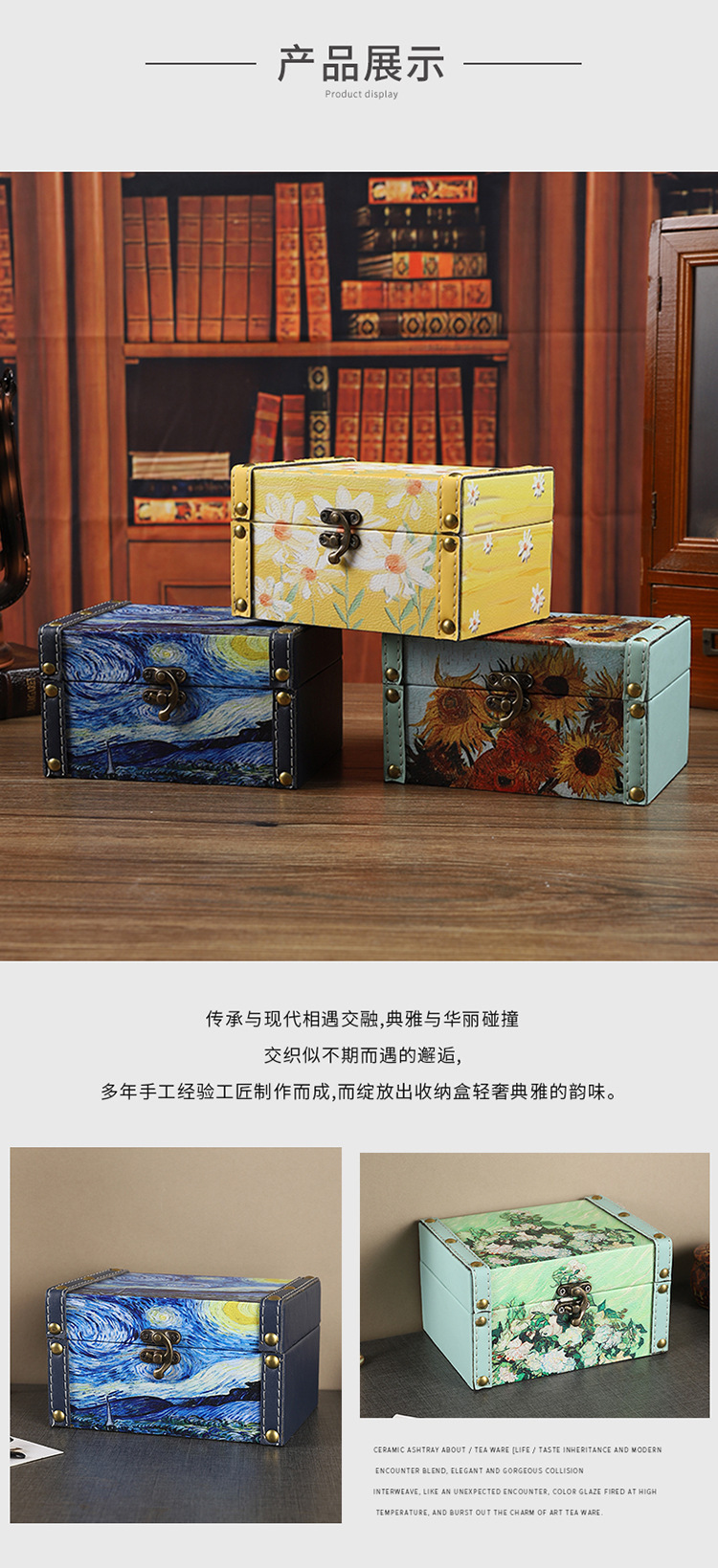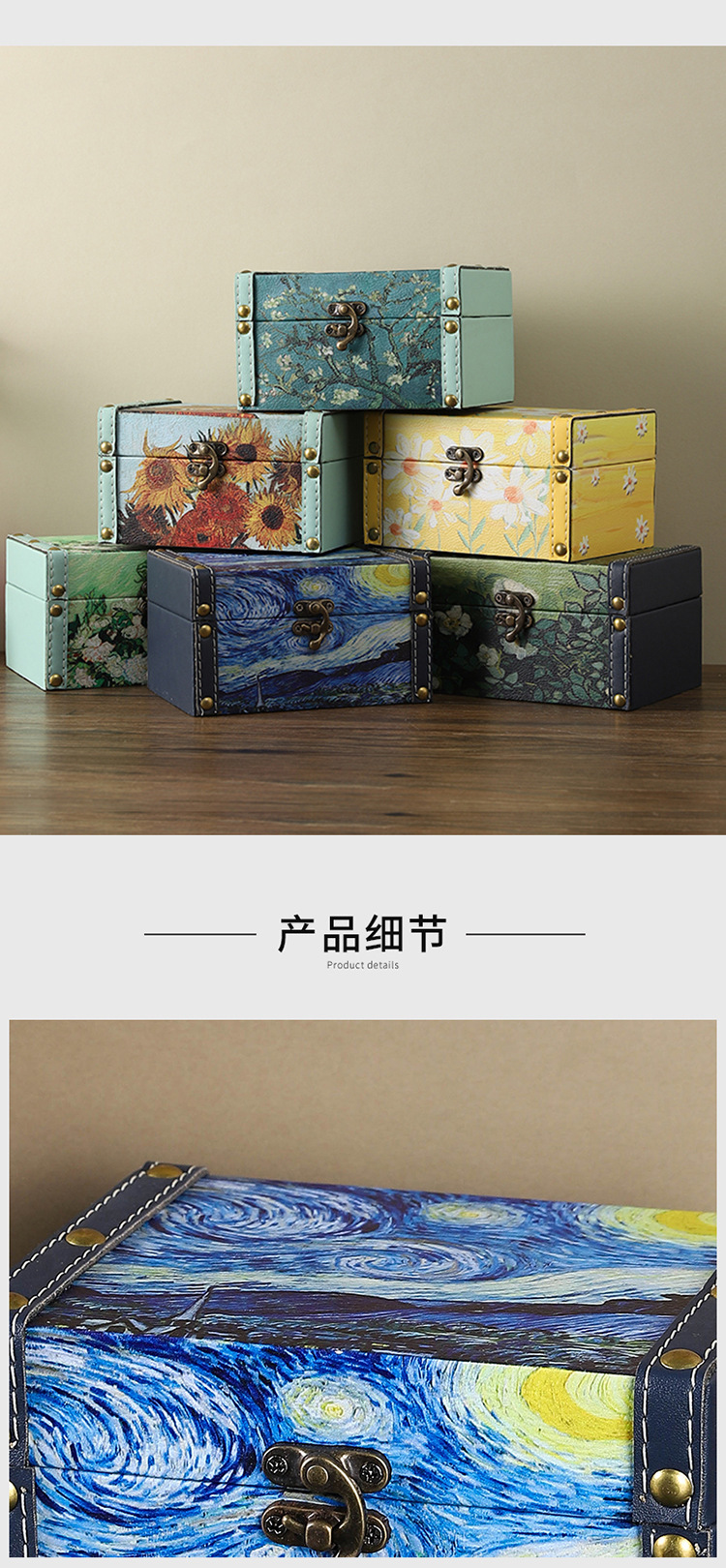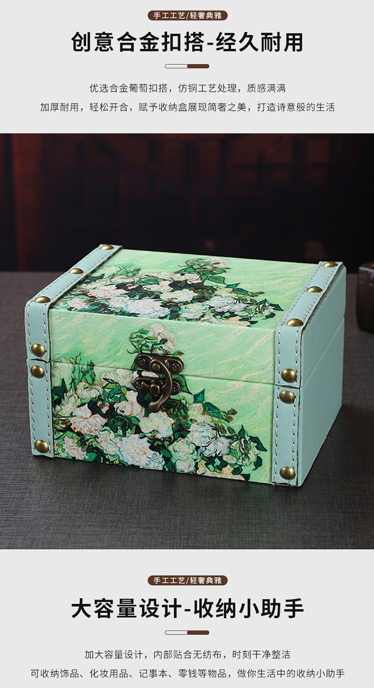 复古轻奢油画名画花朵皮革收纳盒桌面证件杂物储物盒带盖防尘木盒