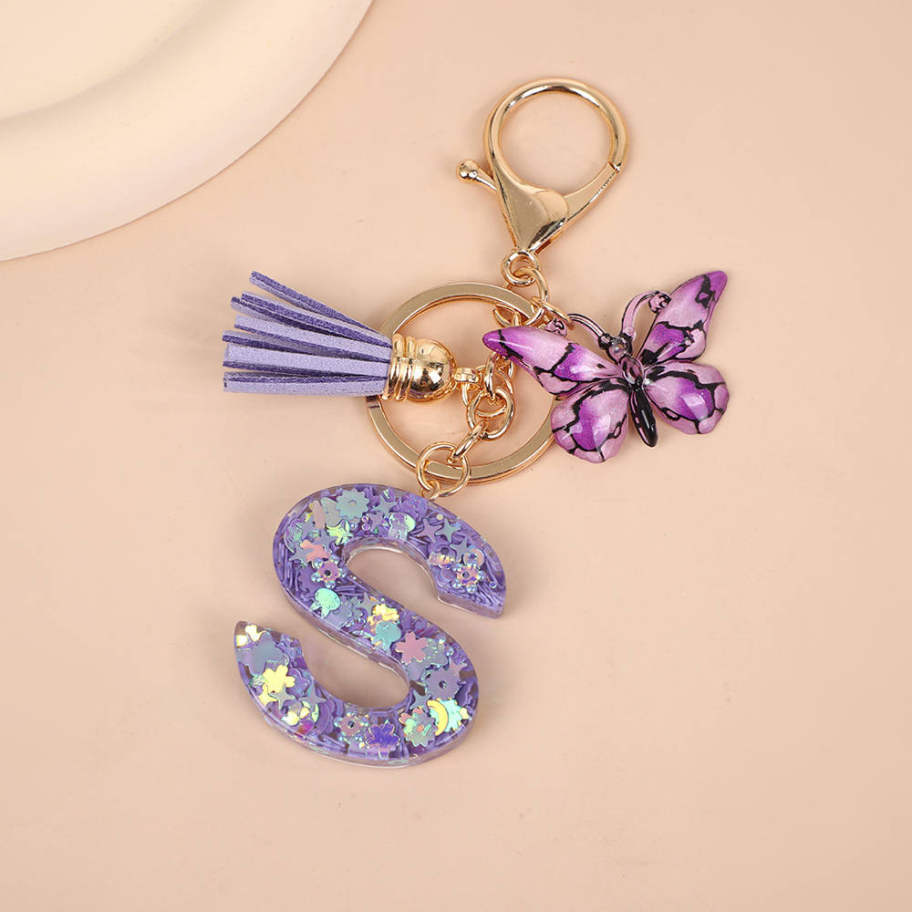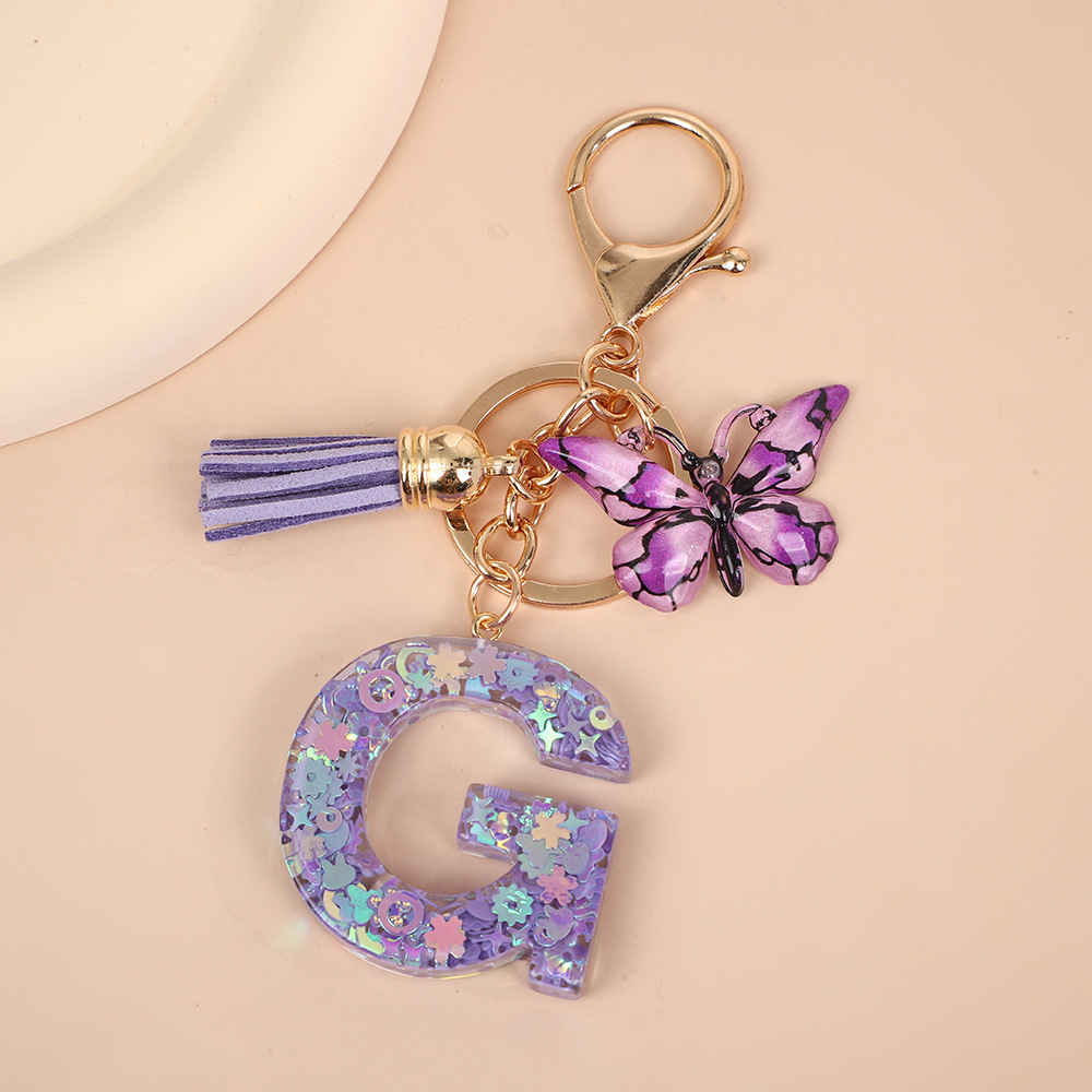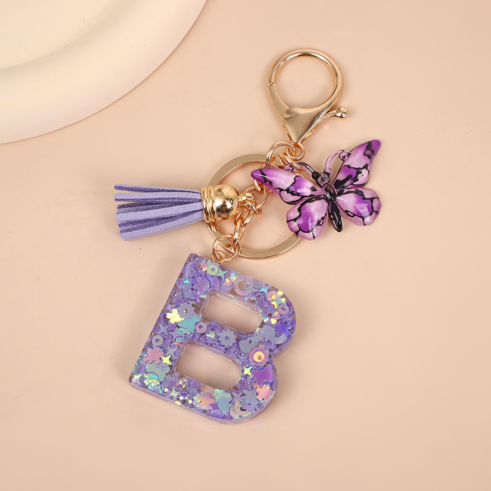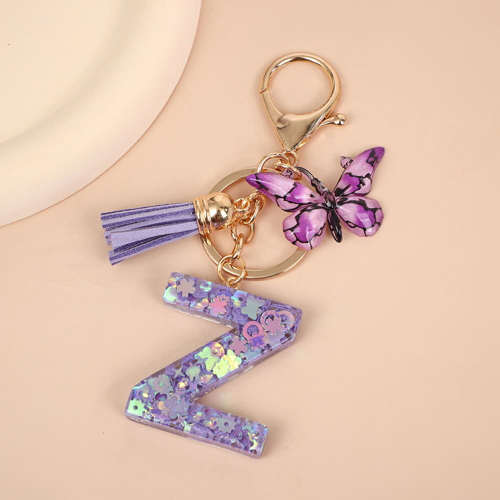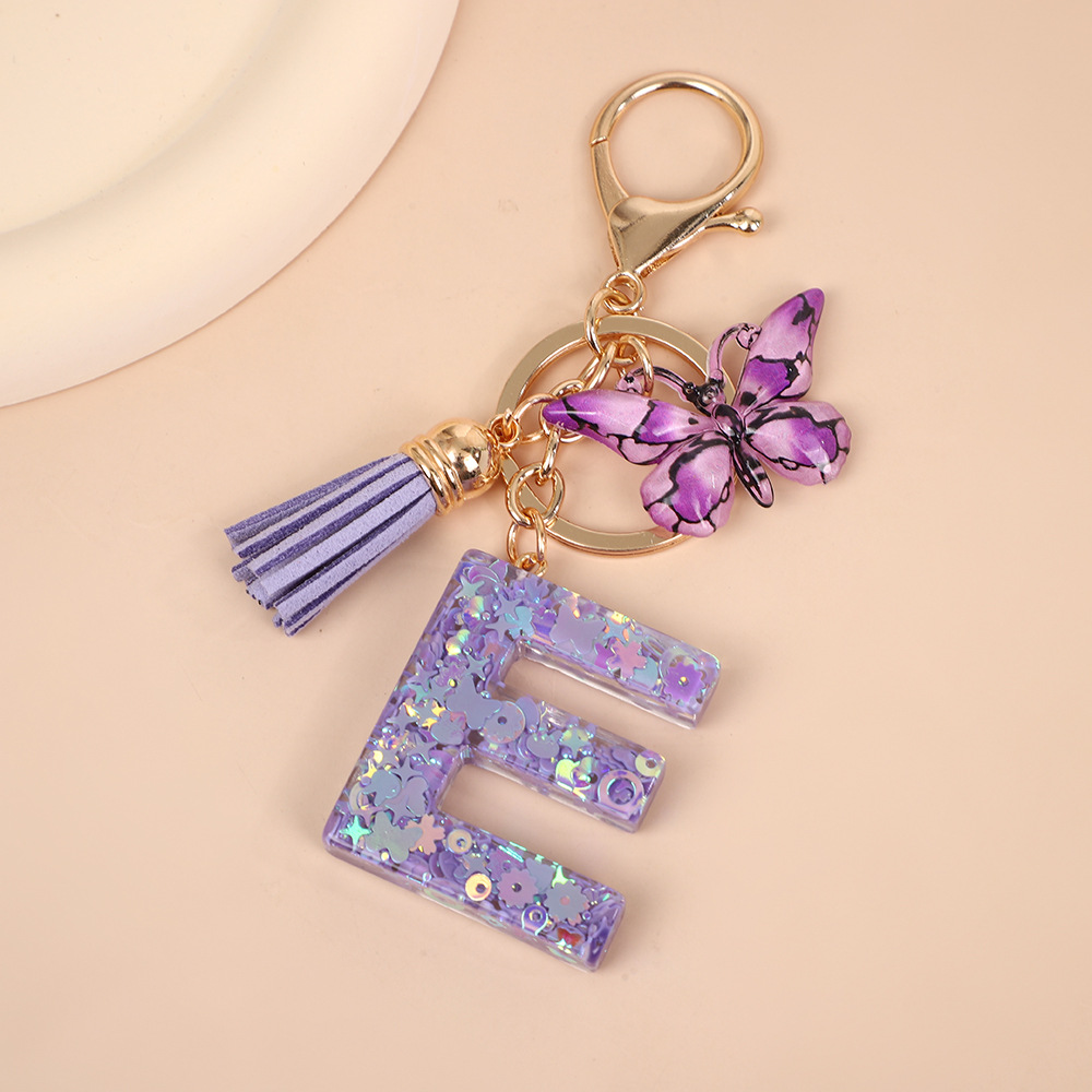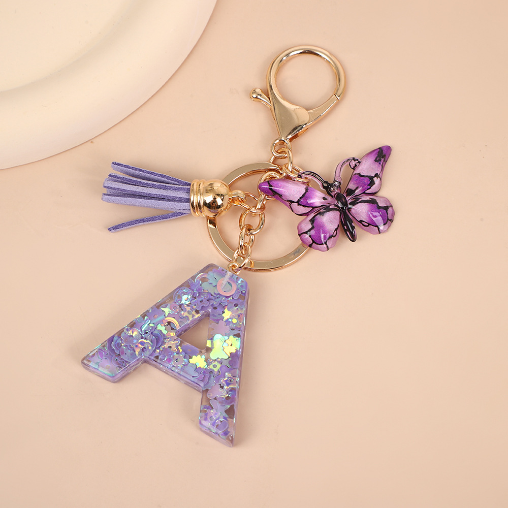 跨境紫色树脂字母钥匙扣花蝴蝶流苏滴胶26字母包挂件挂饰配件