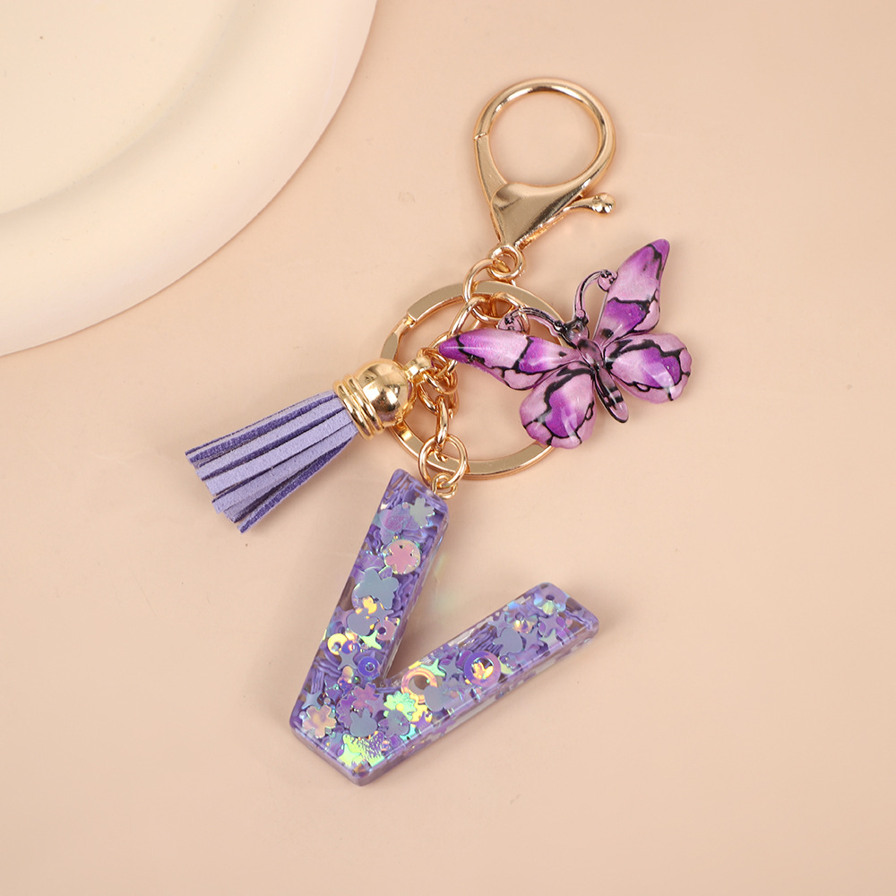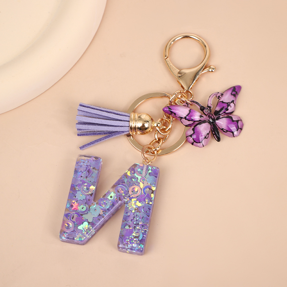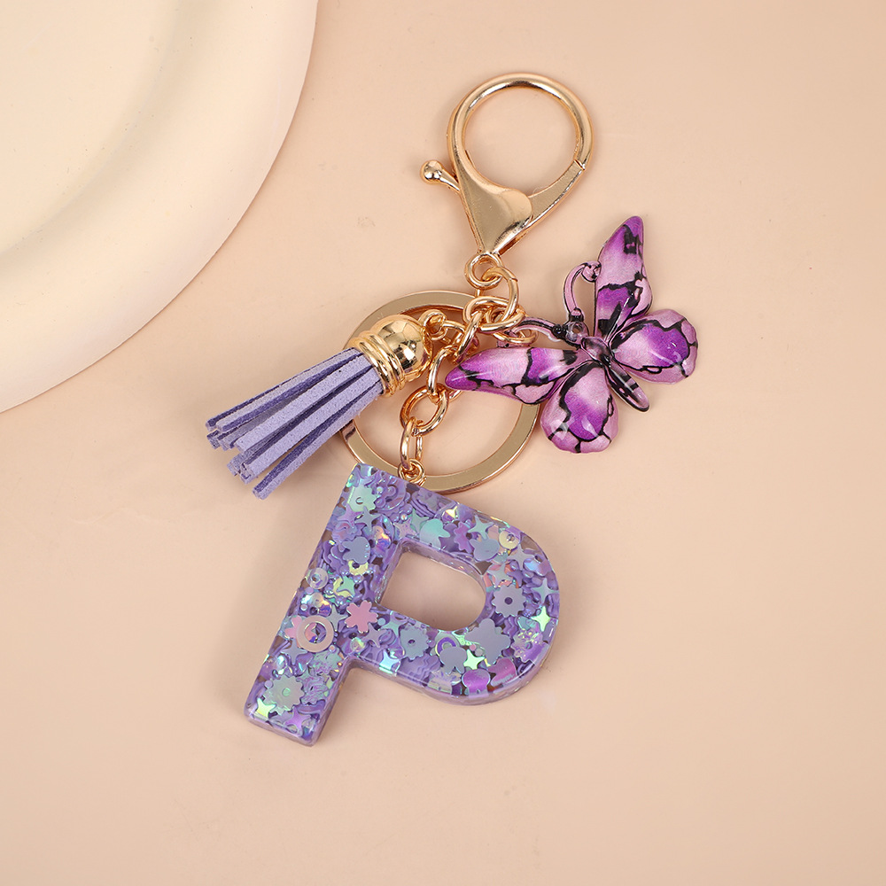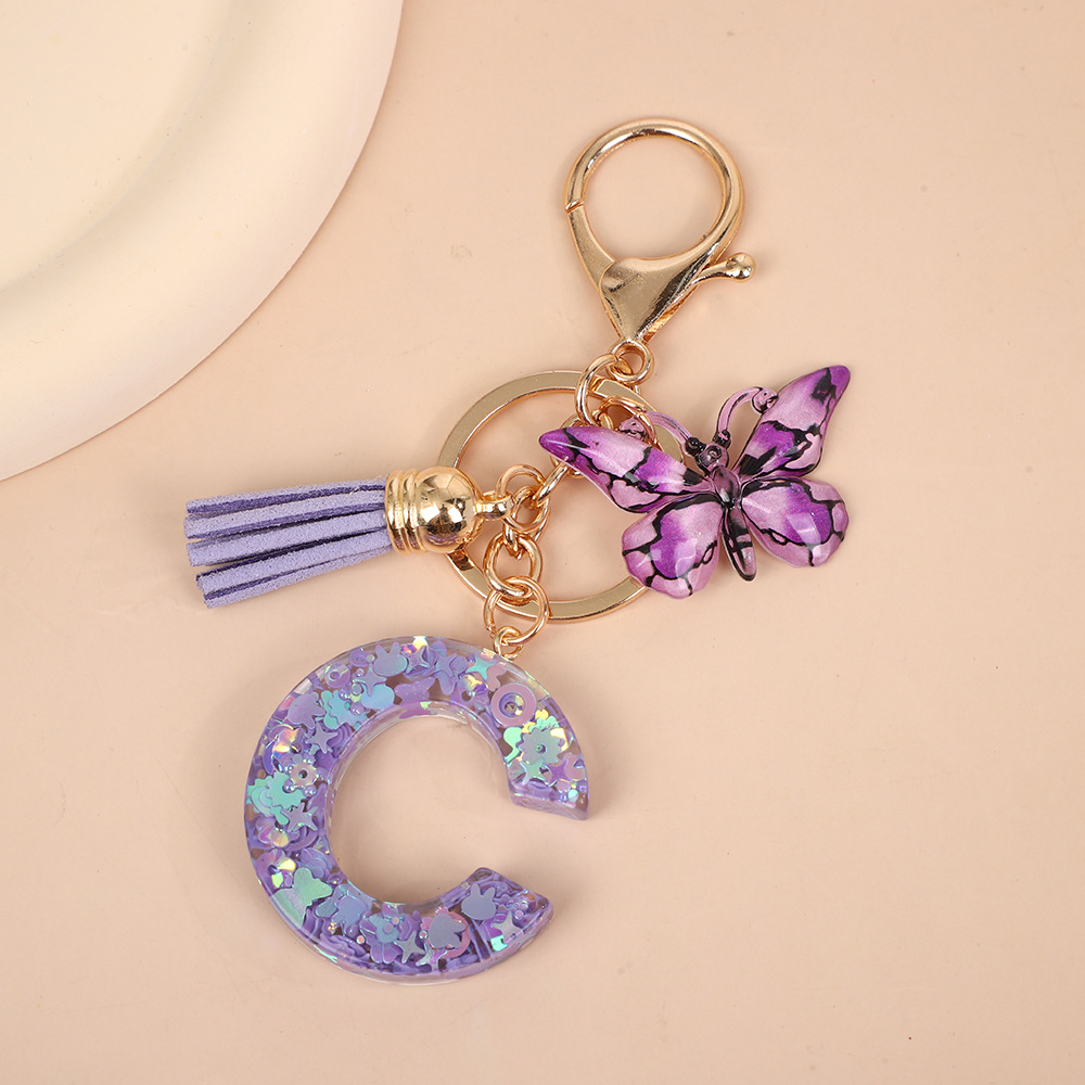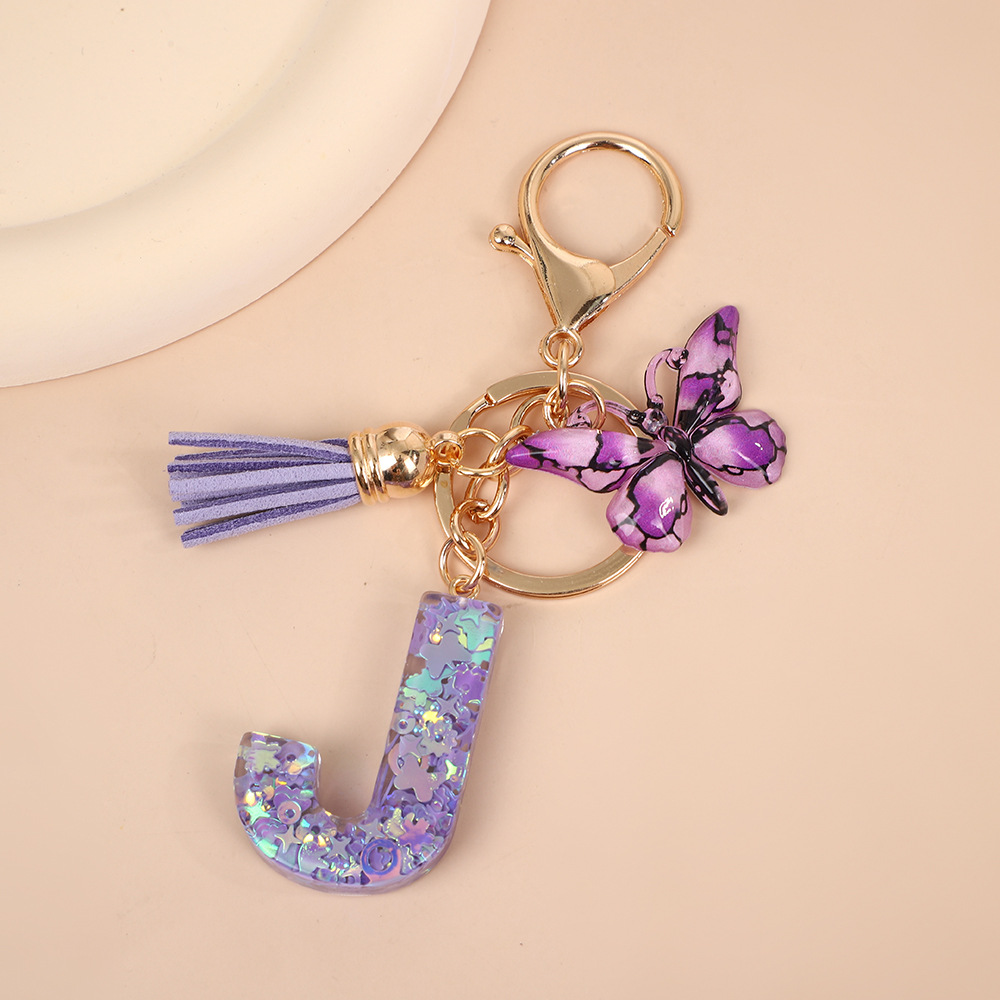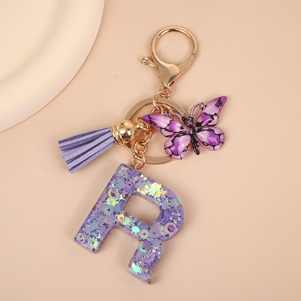 跨境紫色树脂字母钥匙扣花蝴蝶流苏滴胶26字母包挂件挂饰配件