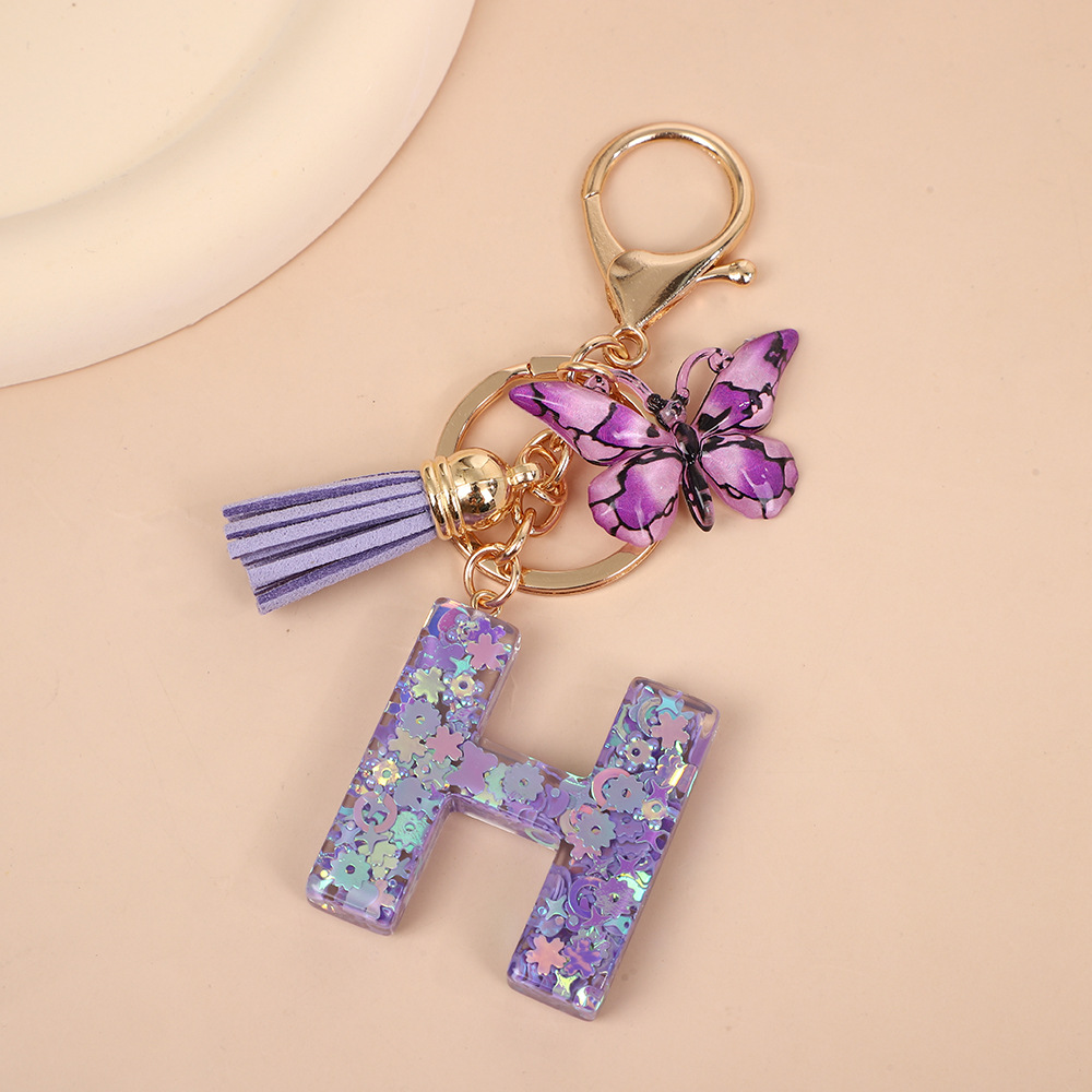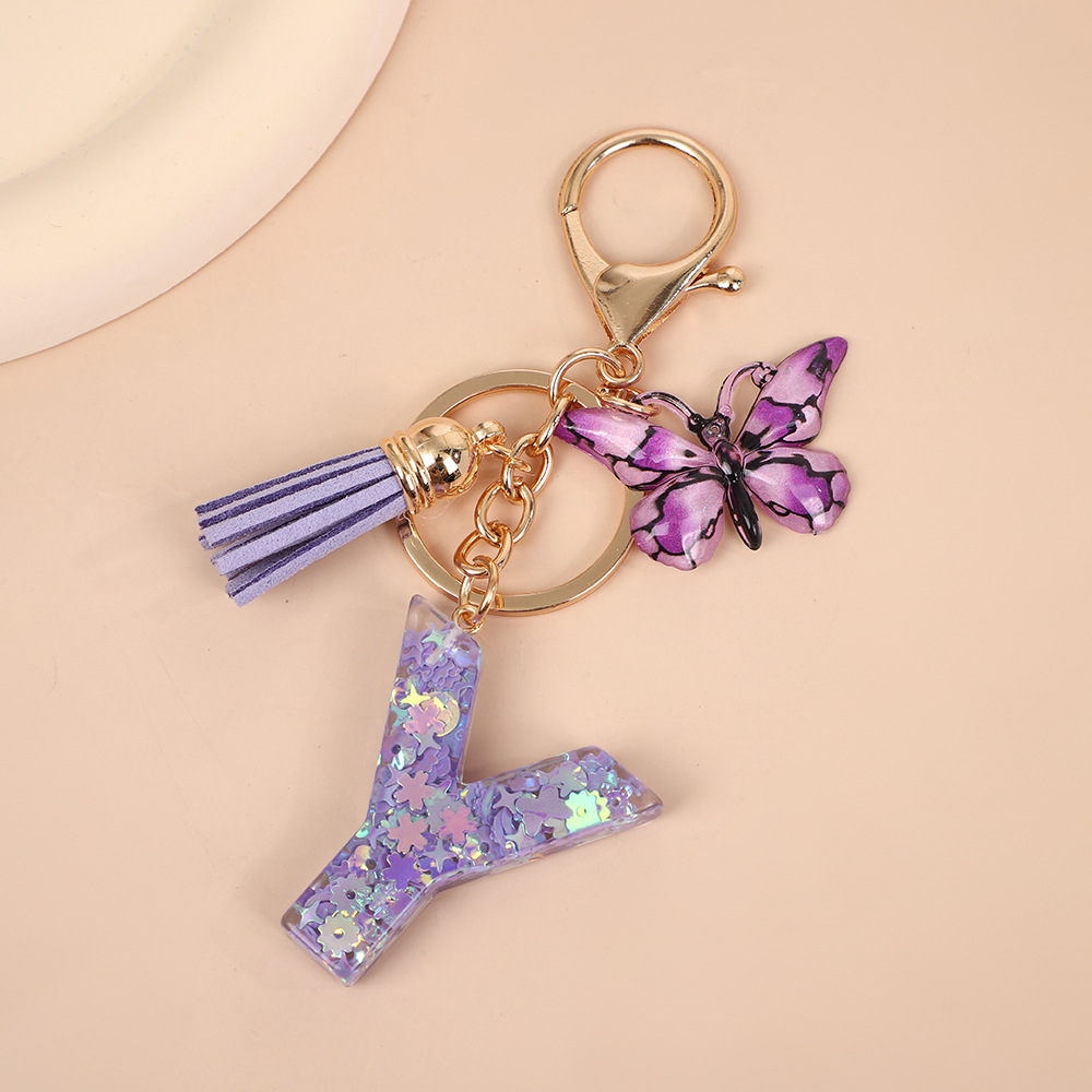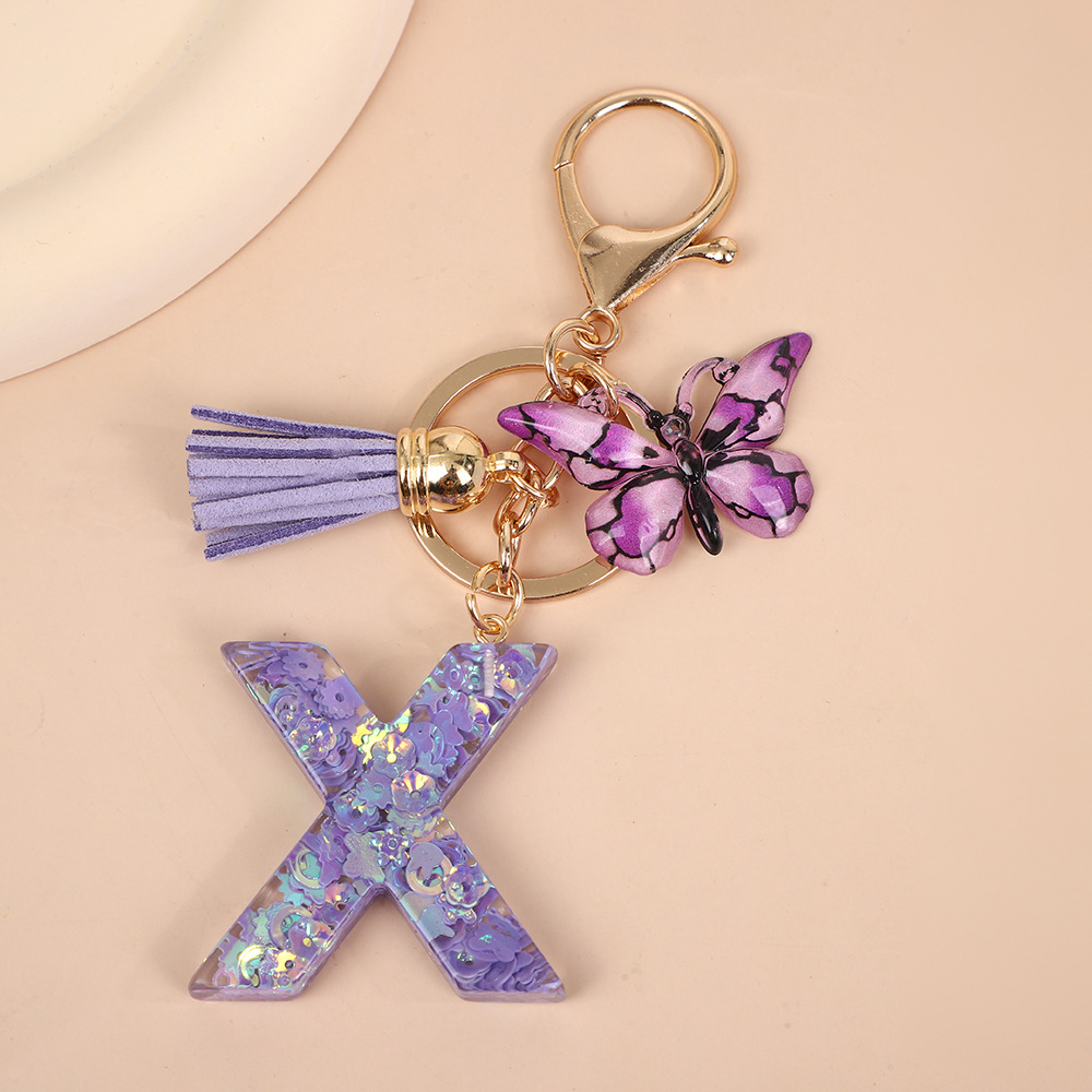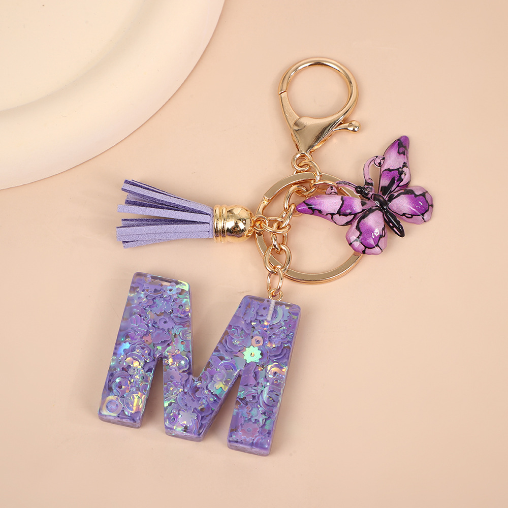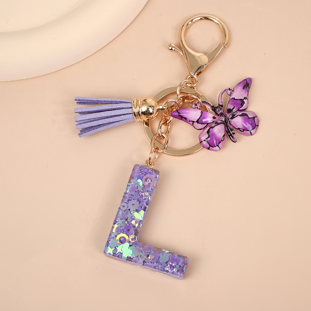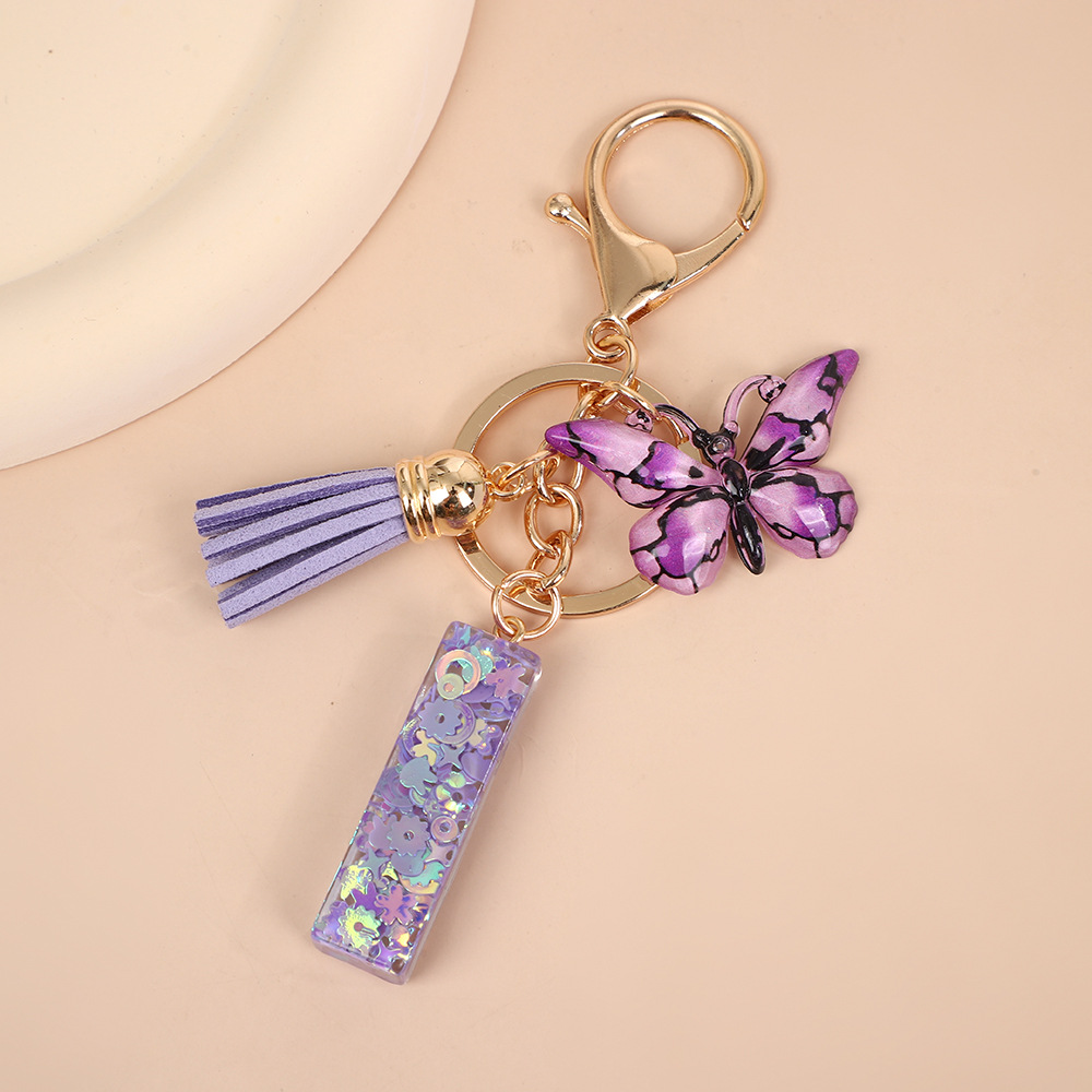 跨境紫色树脂字母钥匙扣花蝴蝶流苏滴胶26字母包挂件挂饰配件
